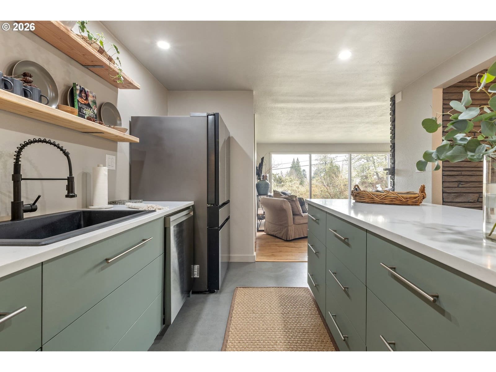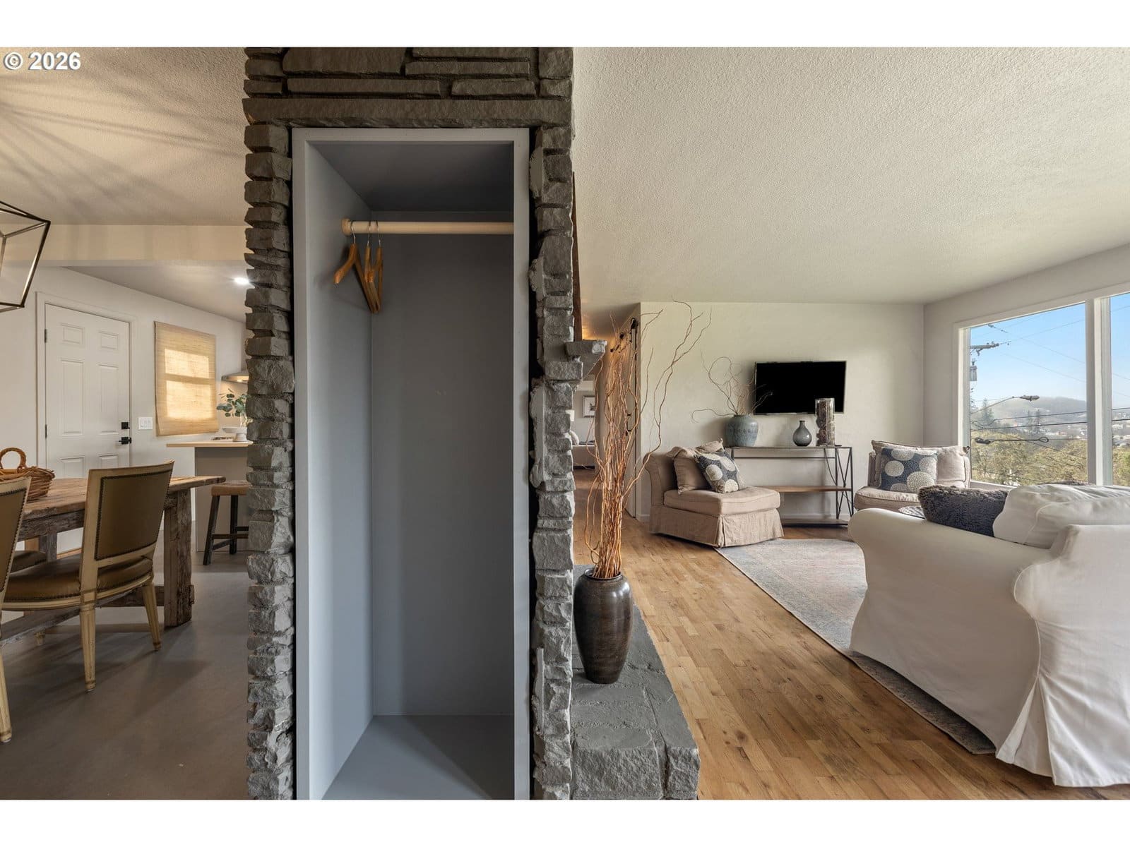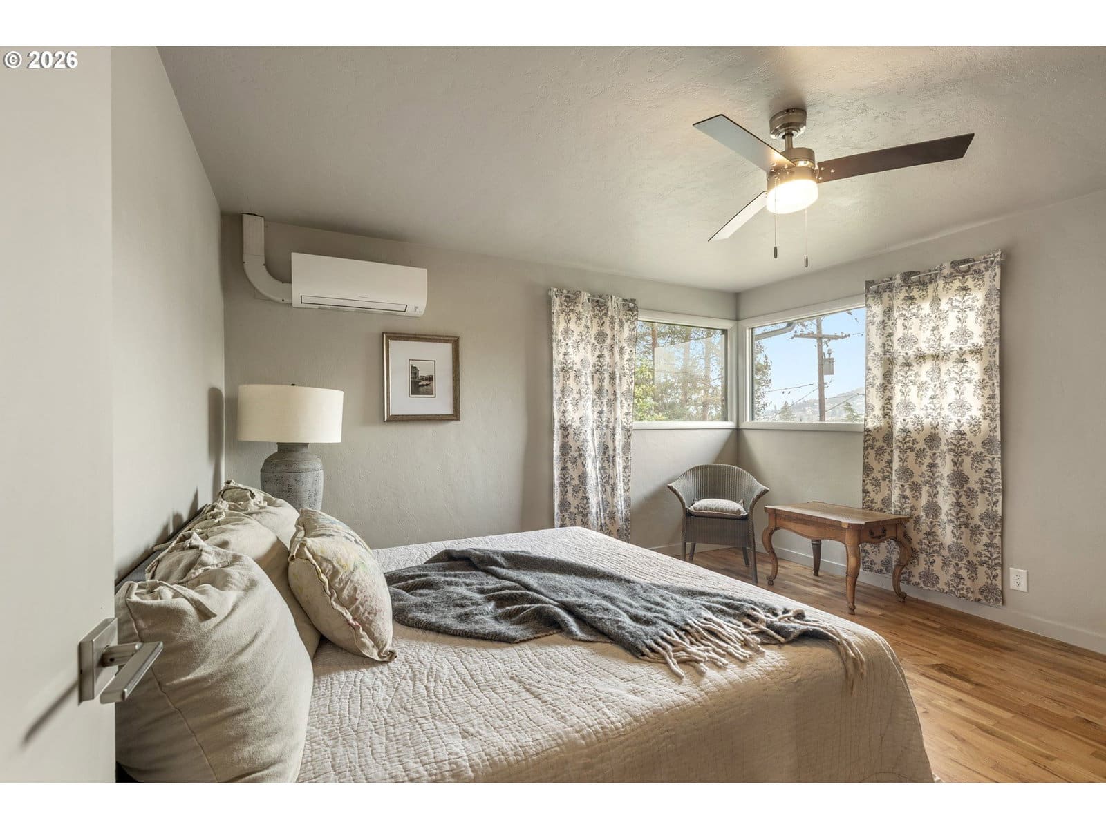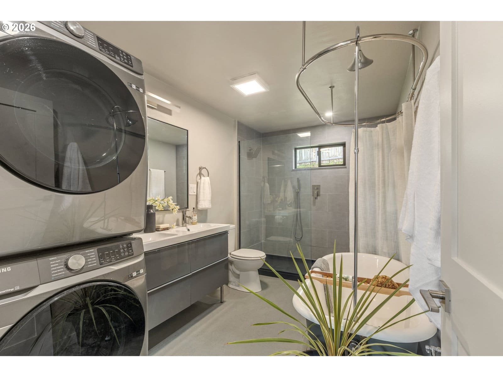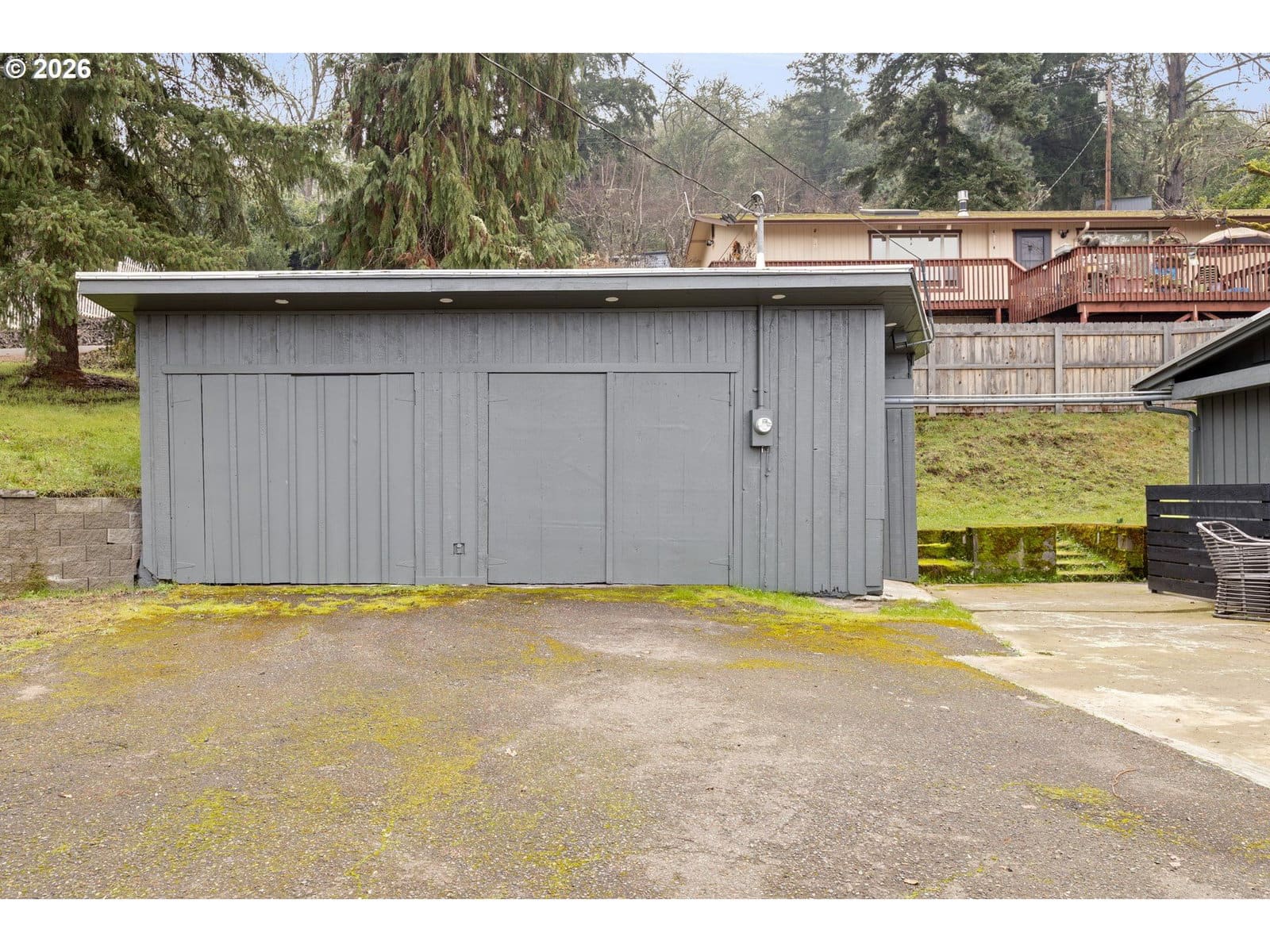 Experience the perfect blend of vintage charm and contemporary luxury in this freshly remodeled Mid-Century Modern ranch home. Situated on a spacious .30-acre lot, this single-level residence is perfectly positioned to capture stunning views of the Roseburg city lights and surrounding mountain peaks directly from your living room windows. The heart of the home features an open layout anchored by massive picture windows that flood the space with natural light. Take in the scenery while relaxing by the floor-to-ceiling stacked stone fireplace and hearth. The main living areas and hallways boast beautiful hardwood flooring, leading to a reimagined kitchen with elegant quartz countertops, a functional island, and new cabinetry featuring pull-out drawers. Modern amenities include new stainless steel appliances, a sleek range hood, and durable Marmoleum flooring that flows into the sizable dining area. The primary suite offers a private retreat with hardwood floors and those signature front-facing views. The second bedroom is bright and versatile with Marmoleum flooring and a brand-new wardrobe, while the third bedroom features hardwood floors and large windows that frame the beautiful exterior scenery. The freshly remodeled bathroom is a showstopper, featuring a double-sink vanity, a classic clawfoot soaking tub, and a brand-new walk-in tile shower, while also doubling as a convenient laundry suite with a stackable washer and dryer. Modern efficiency is ensured with a brand-new ductless heating and cooling system and fresh interior and exterior paint. Outside, you will find a large garage/workshop perfect for hobbies, a large parking area, and a lush yard with endless potential for gardening. Located just a minute from the vibrant downtown area, this home perfectly balances secluded views with urban convenience. Don’t miss your chance to own this modernized classic—schedule your private tour today! Seller is offering a 1 year home warranty to a buyer through closing.