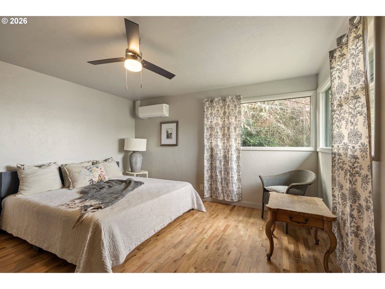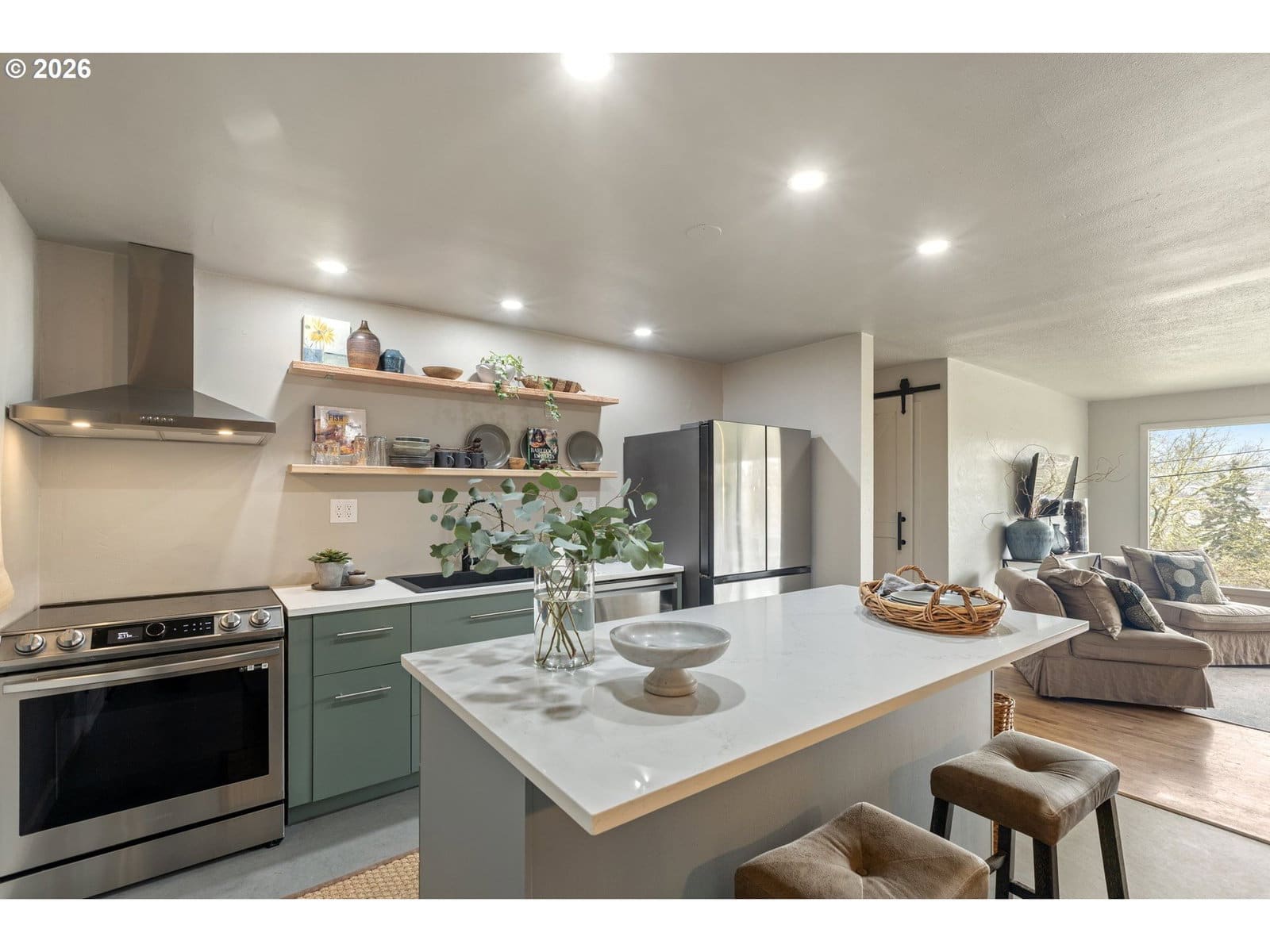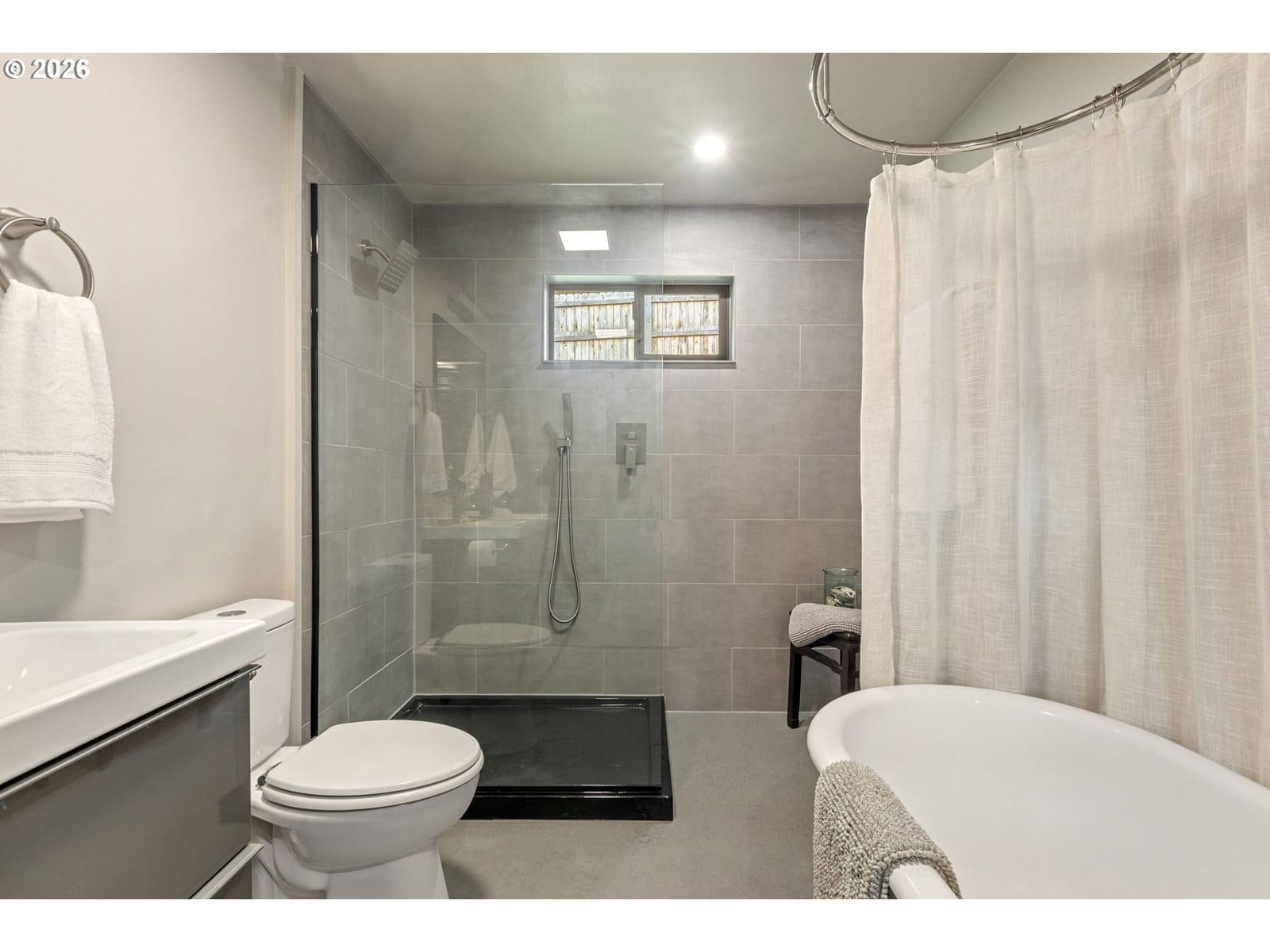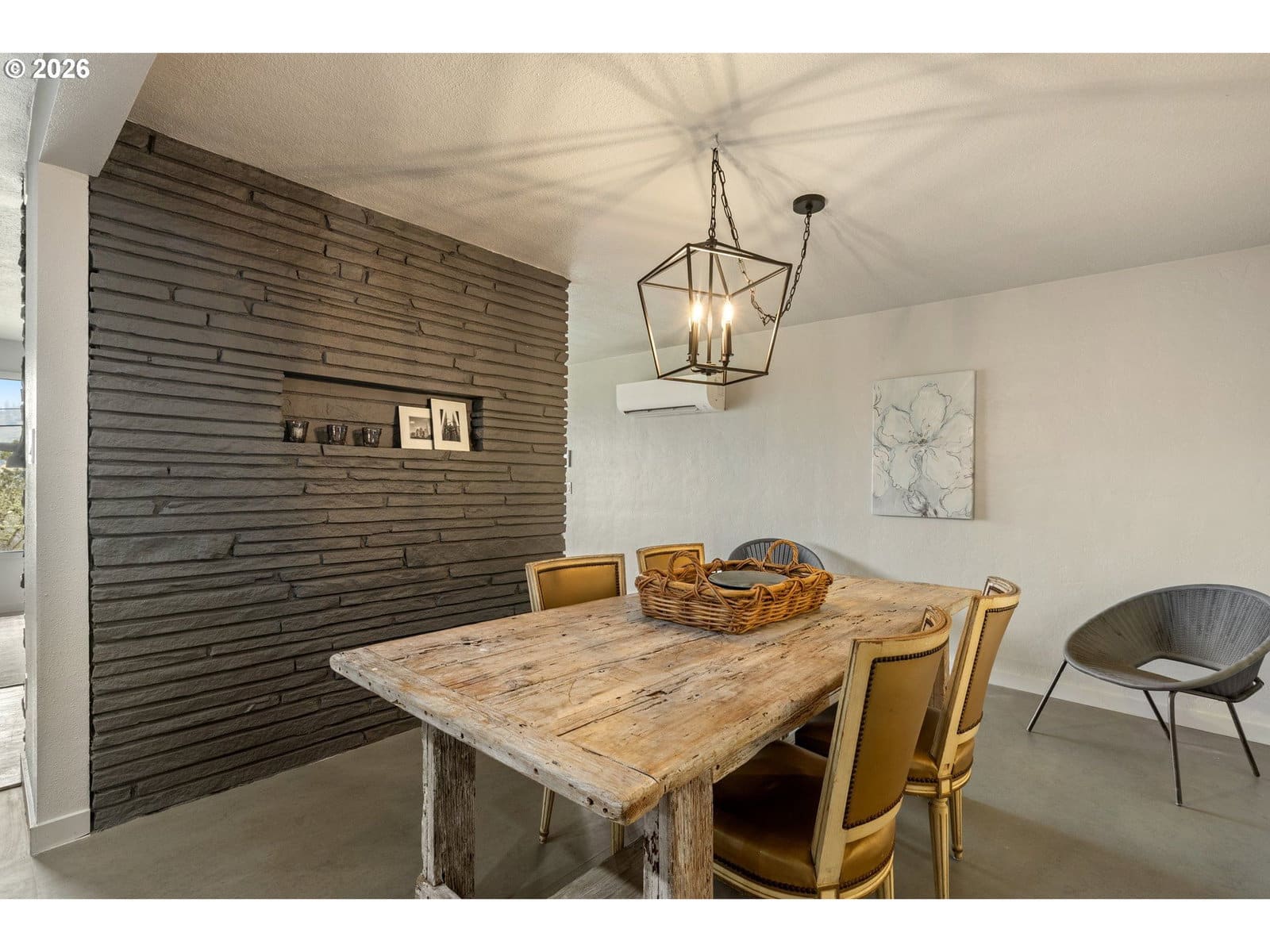 Experience the perfect blend of vintage charm and contemporary luxury in this freshly remodeled Mid-Century Modern ranch home. Situated on a spacious .30-acre lot, this single-level residence is perfectly positioned to capture stunning views of the Roseburg city lights and surrounding mountain peaks directly from your living room windows. The heart of the home features an open layout anchored by massive picture windows that flood the space with natural light. Take in the scenery while relaxing by the floor-to-ceiling stacked stone fireplace and hearth. The main living areas and hallways boast beautiful hardwood flooring, leading to a reimagined kitchen with elegant quartz countertops, a functional island, and new cabinetry featuring pull-out drawers. Modern amenities include new stainless steel appliances, a sleek range hood, and durable Marmoleum flooring that flows into the sizable dining area. The primary suite offers a private retreat with hardwood floors and those signature front-facing views. The second bedroom is bright and versatile with Marmoleum flooring and a brand-new wardrobe, while the third bedroom features hardwood floors and large windows that frame the beautiful exterior scenery. The freshly remodeled bathroom is a showstopper, featuring a double-sink vanity, a classic clawfoot soaking tub, and a brand-new walk-in tile shower, while also doubling as a convenient laundry suite with a stackable washer and dryer. Modern efficiency is ensured with a brand-new ductless heating and cooling system and fresh interior and exterior paint. Outside, you will find a large garage/workshop perfect for hobbies, a large parking area, and a lush yard with endless potential for gardening. Located just a minute from the vibrant downtown area, this home perfectly balances secluded views with urban convenience. Don’t miss your chance to own this modernized classic—schedule your private tour today! Seller is offering a 1 year home warranty to a buyer through closing.