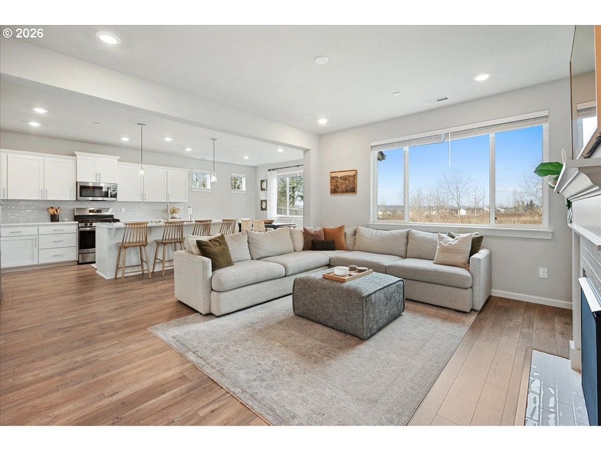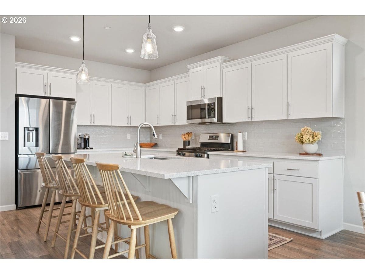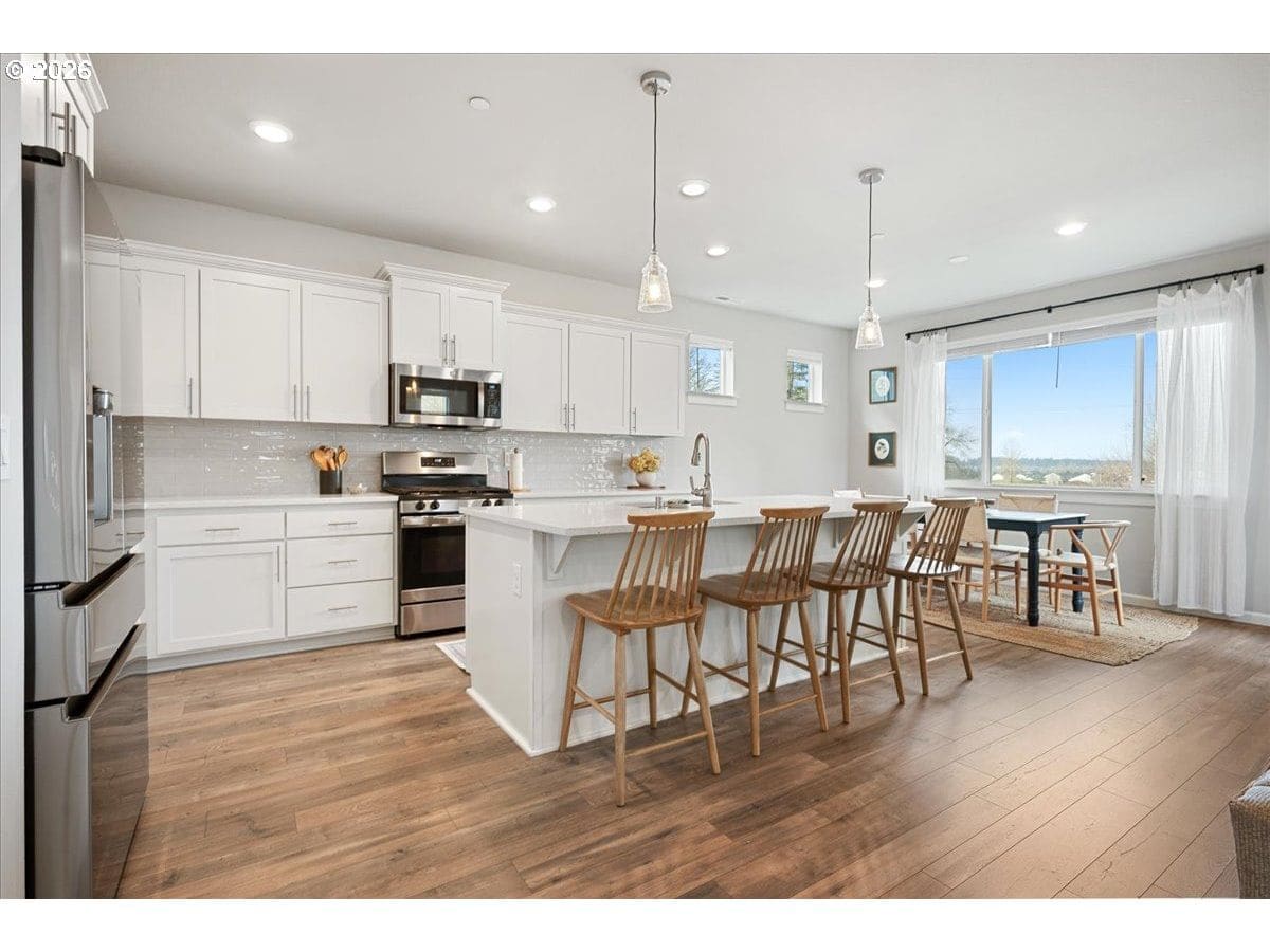 Here it is, that perfect combination you’ve been searching for! Eye catching street appeal with craftsman designs including exterior shutters, decorative pillars, grid style windows, shaker doors, gable brackets and distinct siding details. And it’s located on a premium lot in a cul-de-sac that backs up to a wetland buffer/ green space so there is a nice peaceful view to enjoy all the time! Amazing open and light great room with large dining area, ideal for comfort and gatherings. Like to cook? This kitchen is a dream, ample countertop space with a huge island perfect for food prep, serving and a perfect breakfast eating bar. There’s also a wonderful pantry and gas range too! All bedrooms are generous in size and there’s a great nook in the entry designed as a small work space/ office or can be used as a coat and shoe landing area. Primary suite also views the green space and has a large bathroom and walk in closet. Other upgrades include: stylish and practical laminate flooring through out main floor, beautiful quartz countertops in kitchen and primary bathroom, dual sinks in both upstairs baths, subway tile backsplash in kitchen, attractive tile floors in baths and laundry room, hi-efficiency gas furnace and central AC, tankless hot water heater and a gas fireplace with tile & mantle. Enjoy the privacy and easy maintenance in the fenced backyard with the patio, in-ground sprinklers, a variety of perennials and a couple of raised garden beds. HOA includes walking trails, recreational park, basketball court, outdoor pool/ hot tub and BBQ area. This home is just inside the Evergreen School District but many residents get a Camas School boundary exception, it’s located near the bus stop for both districts. Refrigerator and Ring doorbell are included!