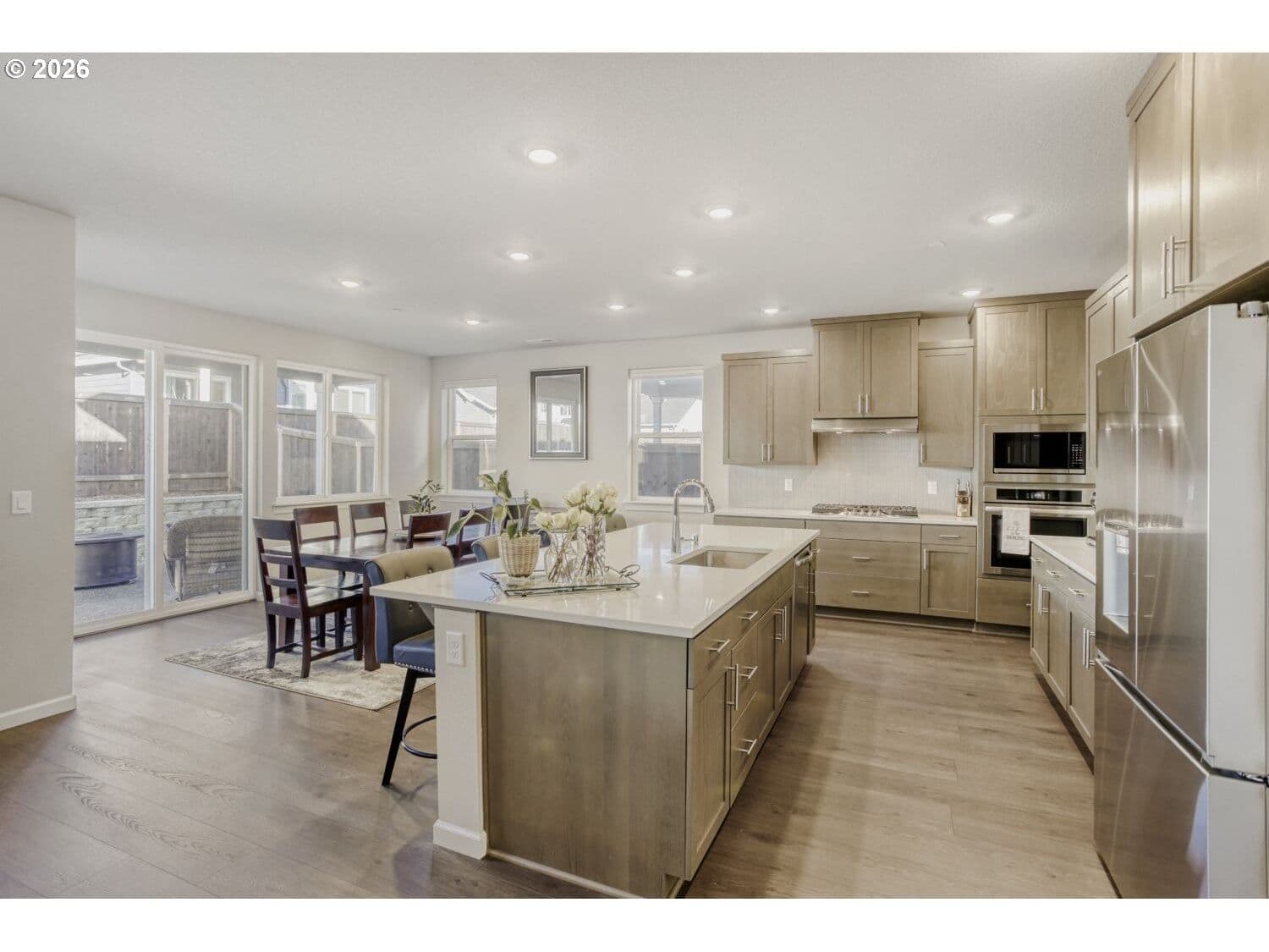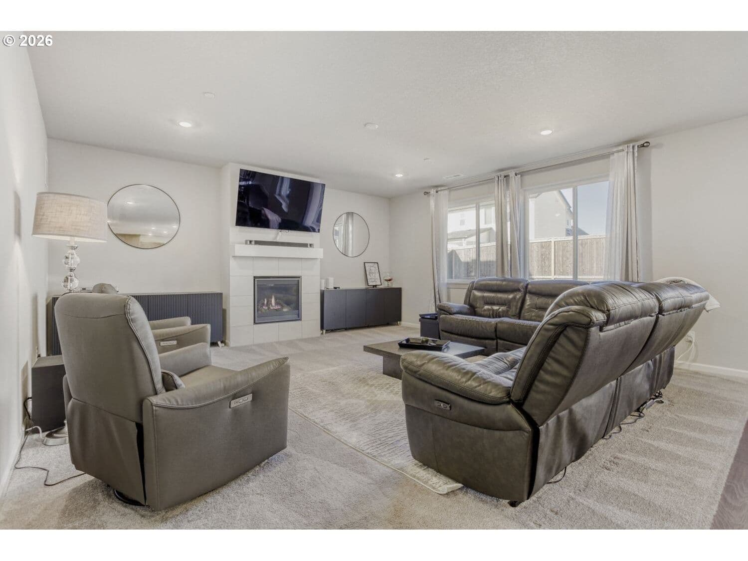 Better than new construction in Ridgefield Heights, this beautifully upgraded Bainbridge Next Gen® home offers flexible multigenerational living with premium finishes already in place. The private attached suite features its own living room, kitchenette, bedroom, bathroom, and dedicated laundry with stackable washer and dryer — ideal for guests, multigenerational living, or a private home office. The main home showcases an open-concept great room with cozy fireplace, quartz countertops, shaker-style cabinetry, picket tile backsplash, luxury vinyl plank flooring in the entry and kitchen, and luxury vinyl tile in bathrooms and laundry. The spacious primary suite offers a spa-inspired bath with dual vanities, soaking tub, separate shower, and generous walk-in closet. Thoughtful upgrades continue with wood shelving in closets and pantry. Enjoy an elevated outdoor living experience with a professionally installed retaining wall and concrete pad for a shed — a rare backyard improvement not found in most neighboring homes! Desirable community with playgrounds, trails, basketball court, amphitheater, pavilion, and minutes to top-rated schools, Costco, In-N-Out, wineries, outdoor recreation, and freeway access. Fully equipped, thoughtfully upgraded, and truly turnkey, this resale stands out as one of the best values in Ridgefield Heights.