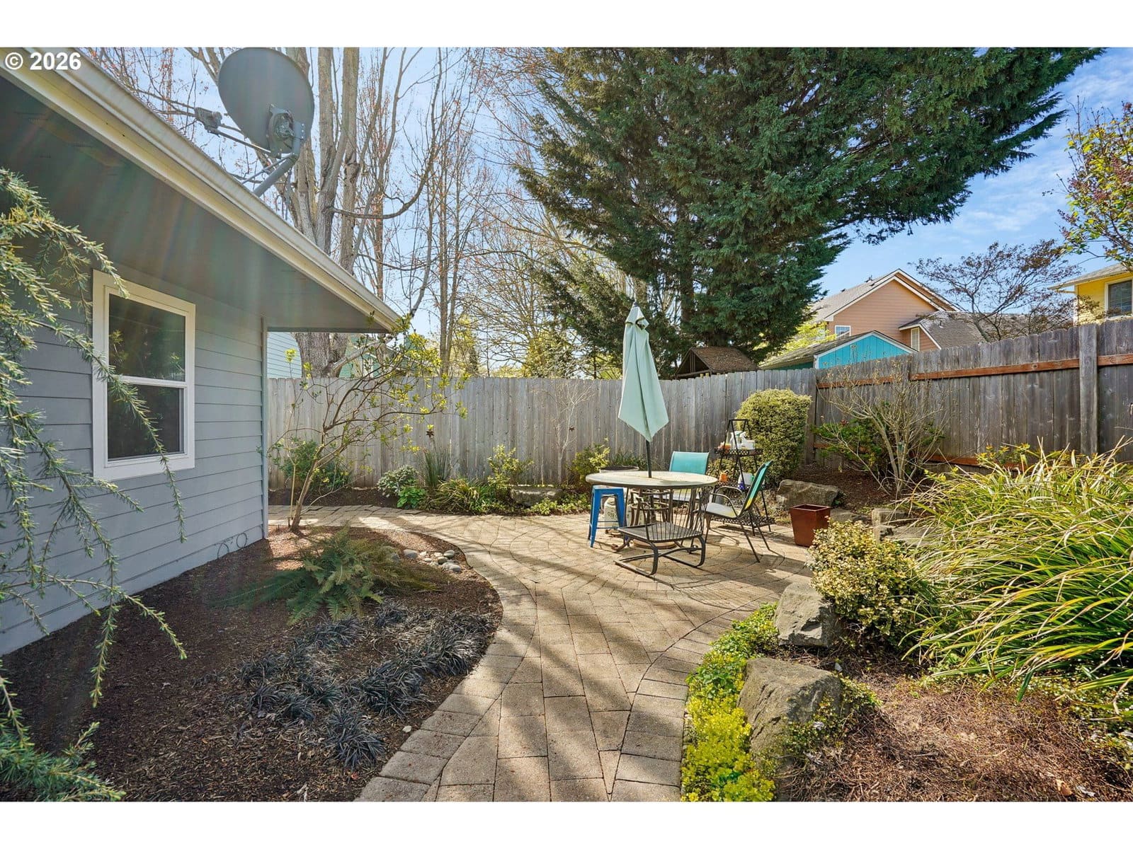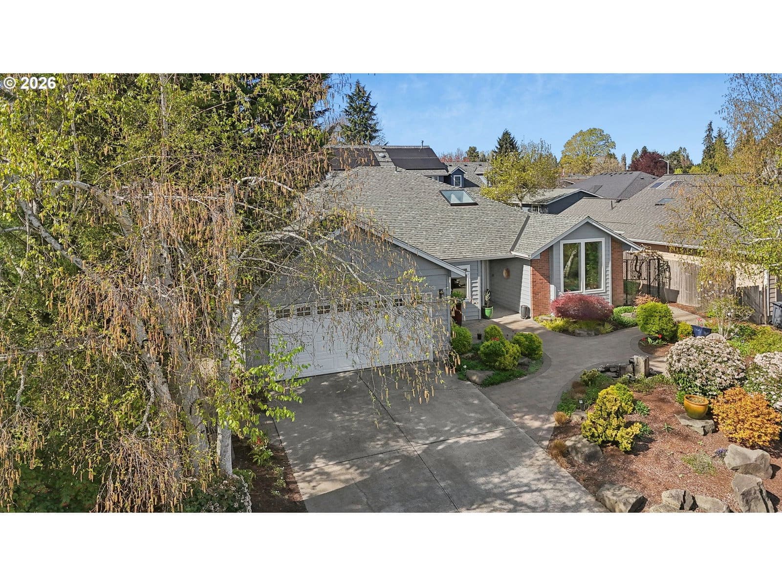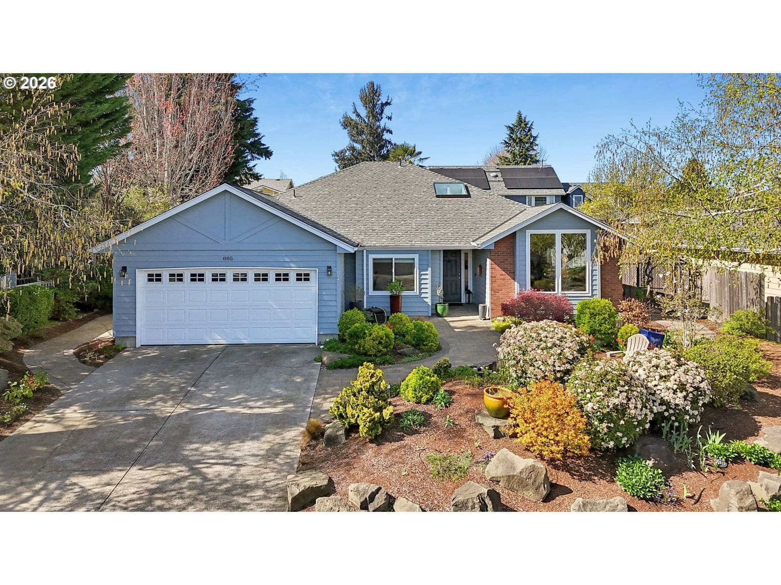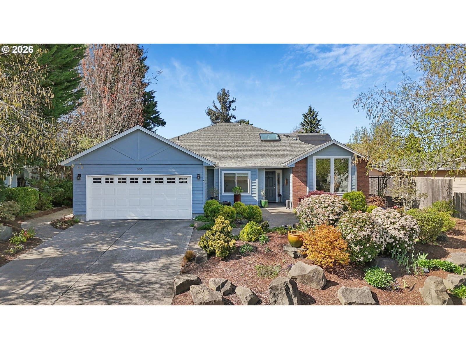 Tucked into a quiet North Keizer cul-de-sac, this well-maintained single-level home offers comfort, updates, and a thoughtfully designed, spacious layout. Vaulted ceilings and skylights bring in natural light, creating a bright, open feel in the front living and dining spaces. Refinished hardwood floors, new carpet, and updated surfaces add a clean, refreshed look.The den features a trendy refinished brick fireplace and built-in storage, adding both warmth and function while being open to the kitchen. Recent improvements include new windows, exterior paint, furnace, water heater, and fencing—providing peace of mind for the next owner.The primary suite is situated in the back of the house for added privacy and includes double door entry, L-shaped vanity with double sinks and built-in shelf storage, and an oversized closet. The third bedroom functions well as an office but is still practical with a built-in Murphy bed. The yard is a true highlight with lush landscaping and vibrant pops of color throughout. Flowering plants create a private, garden-like setting, while a welcoming fountain in the front adds charm and a sense of calm. Hardscaped pathways wrap around the home, making it easy to enjoy every corner of this outdoor space—an inviting oasis for relaxing or entertaining.Located close to schools, shopping, dining, and community events, with easy access to I-5 for commuting north or south. All on one level, this home offers flexibility, comfort, and long-term appeal in one of North Keizer’s most desirable locations.