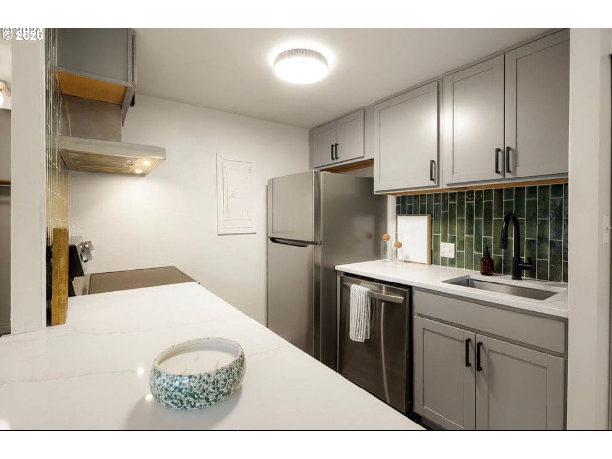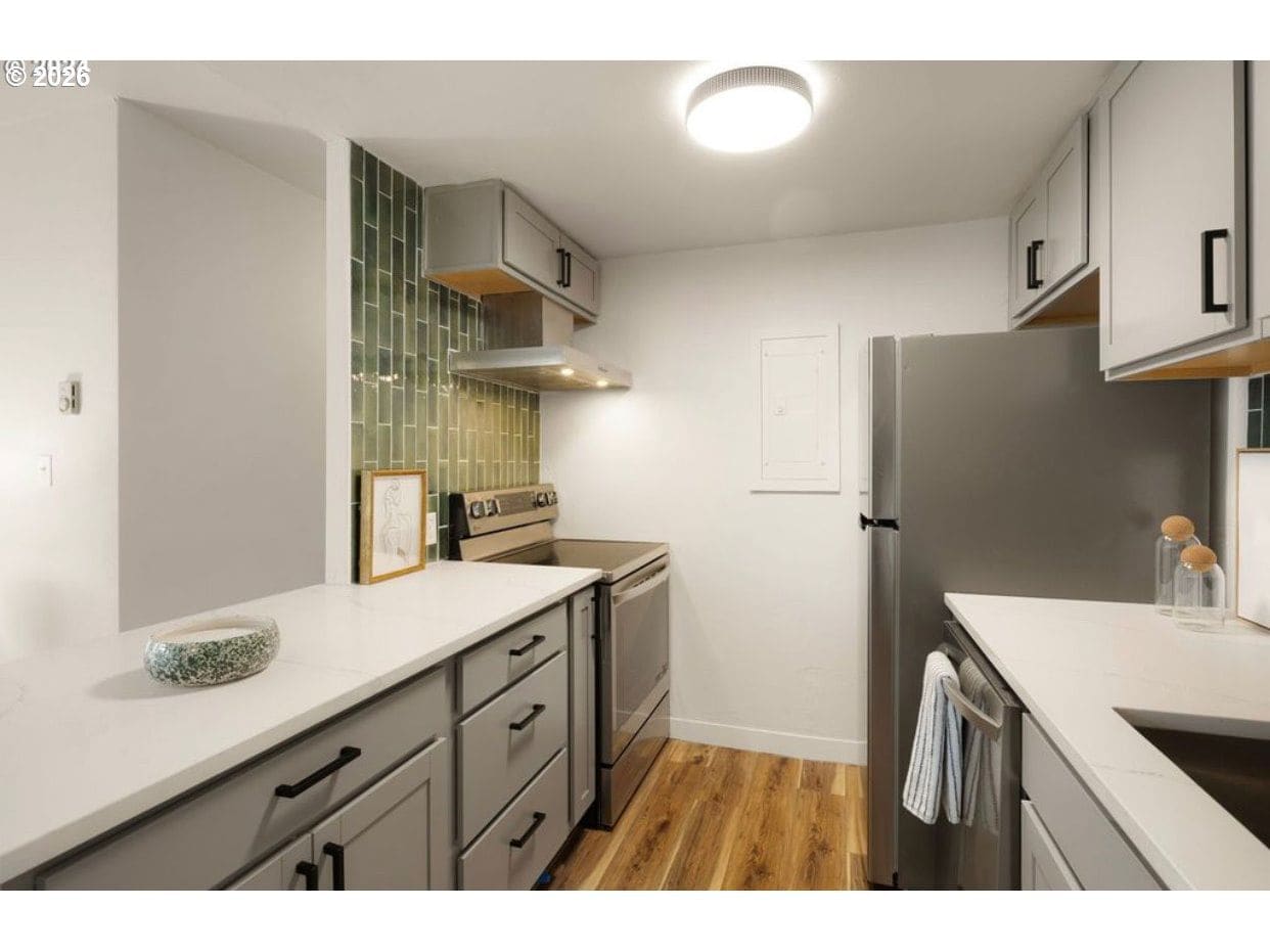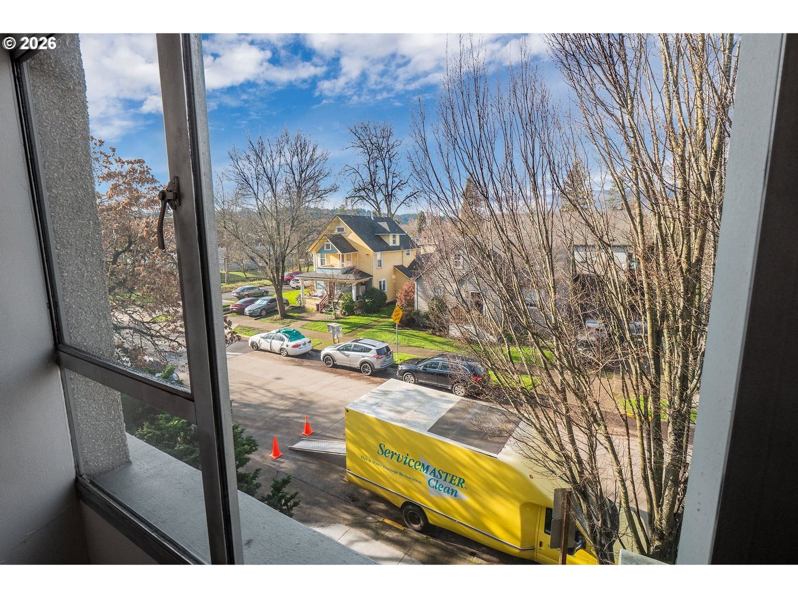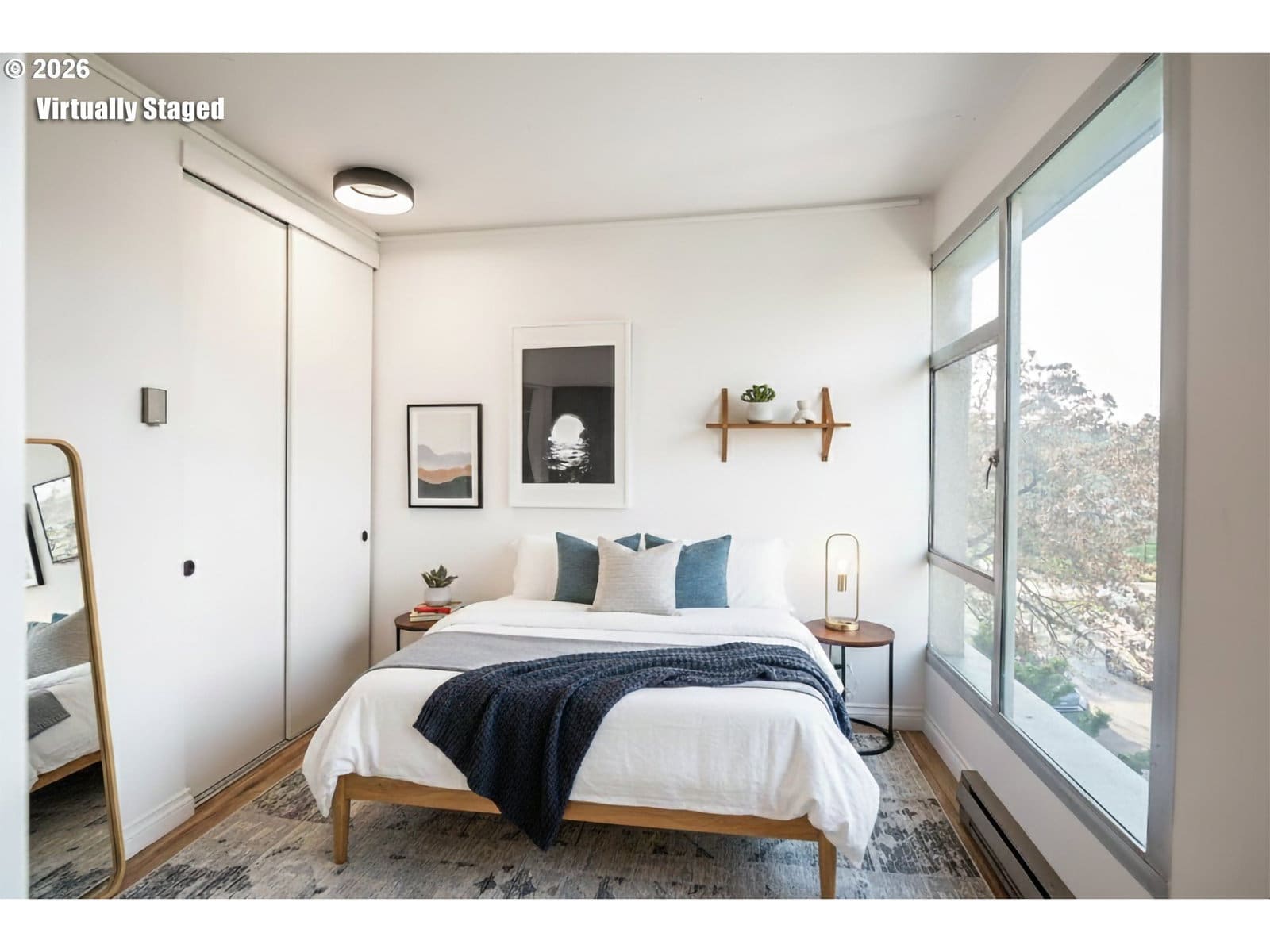 Overflowing with light, this corner condo is comfortable, convenient and surprisingly spacious. High ceilings and expansive windows create a bright, airy atmosphere and easy lifestyle. The key-fob operated front door leads past the onsite manager, offering multiple layers of security as you make your way home. Inside you'll find fresh paint and upgraded luxury vinyl plank flooring, custom cabinets, quartz countertops, tile backsplash, rubbed bronze fixtures and hardware, lighting and new stainless steel kitchen appliances. The revived bathrooms have new vanities, sinks, rubbed bronze fixtures and mirrors, inviting you to relax and enjoy in modern bliss. Step outside and experience everything Eugene has to offer right outside. Also included is deeded parking behind a secure gate, enhancing the sense of a private retreat within the city. Your front door is just steps from both the elevator and stairwell. With onsite accessible laundry, bicycle parking, and additional storage options, this condo truly has it all. Schedule your tour today. You won’t want to miss it!