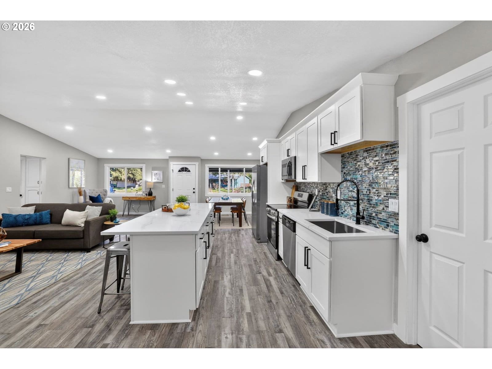 Welcome to this impeccably renovated single-level residence, where every detail has been elevated- New 30 year roof, new windows, new LVP flooring, new LED lighting, new exterior and interior paint, new interior door and molding, new mini splits w/AC, new wall heaters, new hot water heater, new french drains in backyard, new exterior rain drains, new crawl space drainage with sump pump and new vapor barrier. The kitchen is equipped with all-new appliances, quartz countertops, a deep undermount sink, a large island, and custom cabinetry. The living area centers around a striking electric fireplace set against a modern accent wall- perfect for entertaining or enjoying a quiet night in. Large primary suite with a walk-in closet, an obscured sliding door that leads to the backyard, a private bathroom with a new walk-in shower, a new vanity with quartz countertops, and his and her undermounted sinks. New main bathroom with new tile, valves, cabinets, and quartz countertops. This gem is situated on a desirable corner lot with a large backyard, providing extra privacy ideal for relaxation or entertaining. Just minutes away from shops, restaurants, schools, and more! Schedule your showing today!* Seller is a licensed Broker in OR