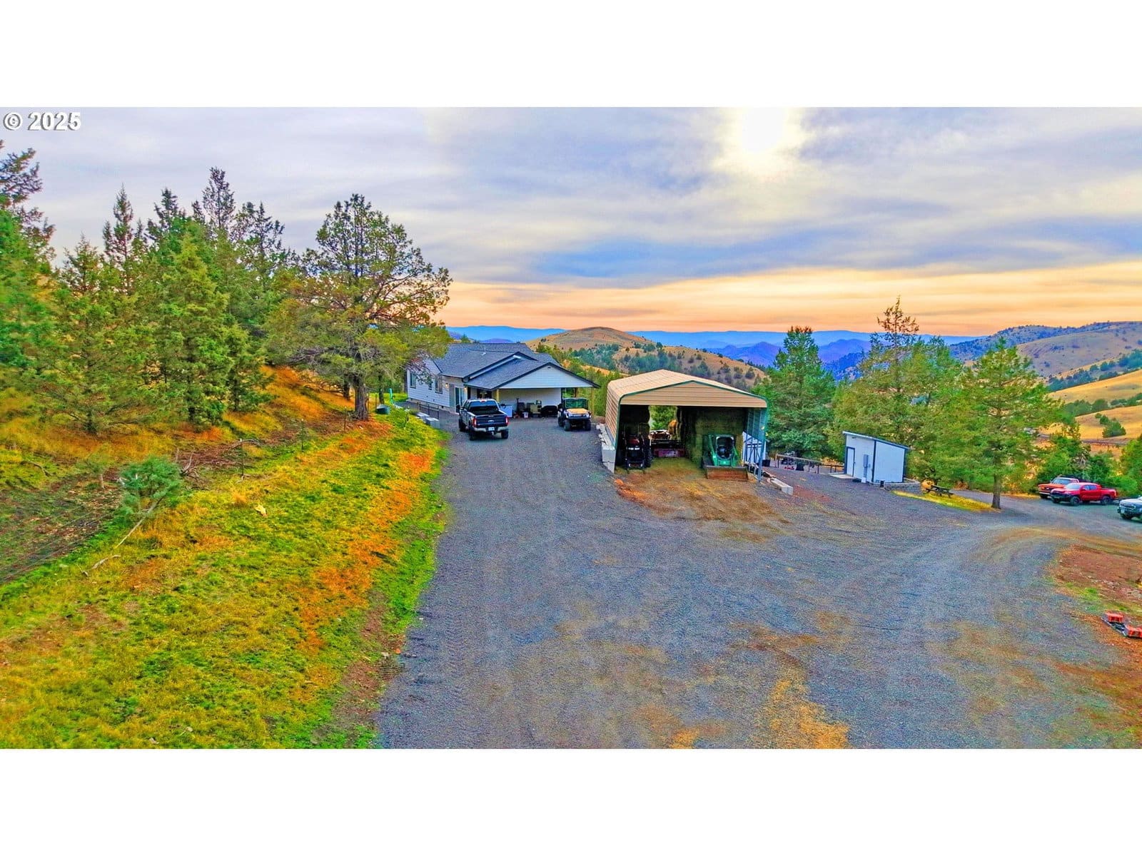 Windy Ridge Ranch ~ Pristine 778 acres juniper covered rangeland 2 homes,shop,barn,arena,hayshed,chicken house.Grazing/Hunting ranch, mountain views.This scenic setting offers privacy and endless 360-degree territorial views of the horizon with a beautiful driveway entrance behind a locked gate.The silhouette of Mount Jefferson peaks above the ridgeline as a statuesque backdrop.This is an expansive landscape with a palette of a seemingly endless oasis of breathtaking topography.The main stem of the John Day River is about a ten-mile trek to the west.This well-known channel offers some of the finest bass and steelhead fishing in the state and is renowned for its river rafting adventures along the pristine waterway.The custom-built 3/2 log home with loft was constructed locally in 1998 and boasts panoramic views from the wrap around deck overlooking the canyon and mountain scenery below. Tastefully decorated in rustic charm, the seller could offer this turnkey and fully furnished.The 2/1 Hiline Home was placed in 2020 and shares 60 GPM well along with DEQ approvals on both homes and separate septic systems.The garage was converted into an exercise room and storage area with outside access to the adjoining carport.Either of these homes would make a great VRBO for extra income, managers dwelling or full-time residences.Wood heat, mini splits, propane instant hot water and appliances provide cost efficiency. Both homes have dog kennels and runs and have audio/video surveillance.There are raised garden beds with asparagus and raspberries with an underground sprinkler system.Prolific springs that are developed are well scattered throughout the three pastures where more are undeveloped for future resources for wildlife and cattle. 3 miles of seasonal Lone Pine Creek traverses the boundary line close to John Day National Monument in Clarno with a wealth of history and vast geological formations.Current use is grazing, equine and hunting. Must see to appreciate. Appt. only. Numerous springs!Stunning mtn views! Private. Recreation galore & LOP tags in North Fossil Unit. Current use is cattle/horse ranch. Near JD River. 2 homes. One could be VRBO or rental/manager home.Pride of ownership evident. MUST SEE TO APPRECIATE! Second residence is 46459 Hwy 402 with 2/1 Hiline Home + carport. Garage has been renovated into a laundry/office space w/384 sq ft. Concrete foundation. Front and back porch. See PDF's of all other building improvements.