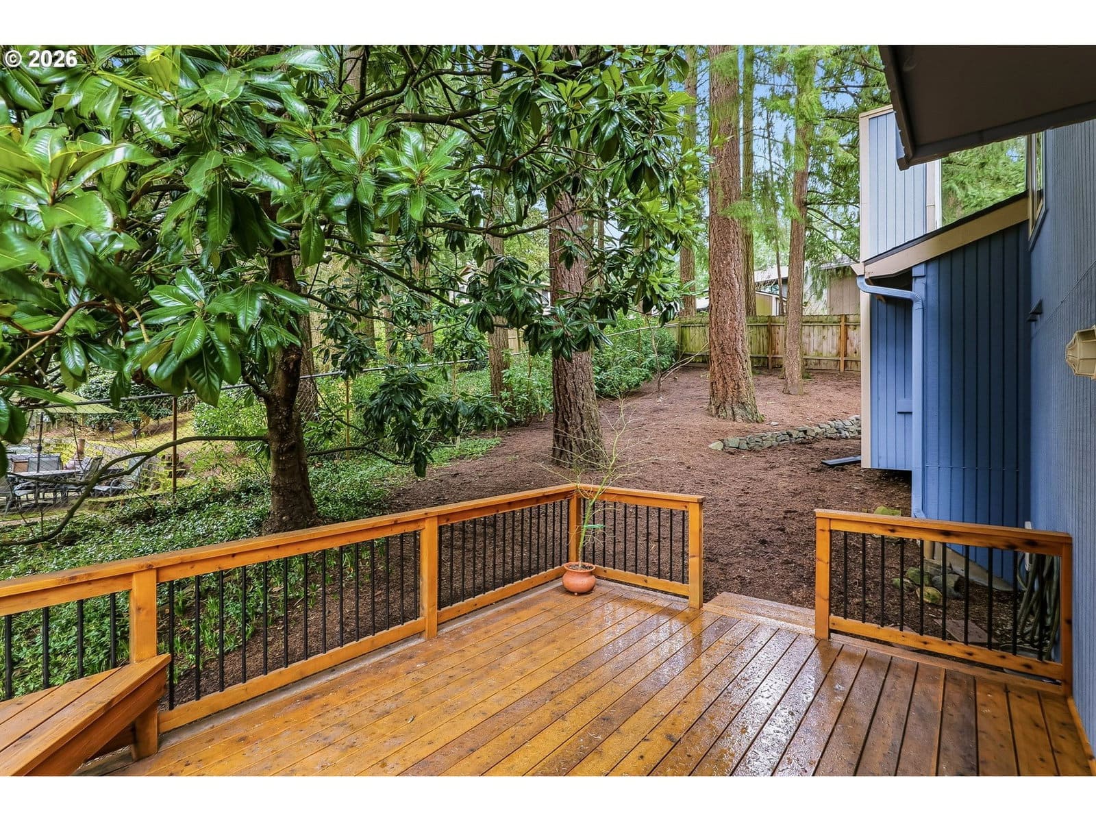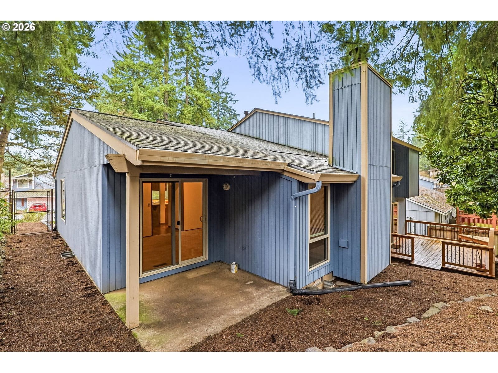 Tri-level with contemporary flair in wooded setting. Front deck to the right of front entrance. Foyer with Italian tile. Open, airy living room & dining room combo with vaulted ceilings. Living area with wood burning fireplace. Dining area with slider to covered porch & backyard. Kitchen with bamboo floors, large eating area, pantry, & breakfast bar. Upper level with primary suite plus two additional bedrooms & a bathroom. Lower level with flex space/family room, fireplace, & slider to back deck. New furnace & AC in 2024. Roof replaced in 2015. New exterior paint in 2021. All new Milgard windows. Newer front & back decks. Great storage. Washer, dryer, refrigerator stay. Oversized 2 car garage with built in work bench & storage cabinets. Excellent neighborhood with easy access to parks, paths, & greenways.