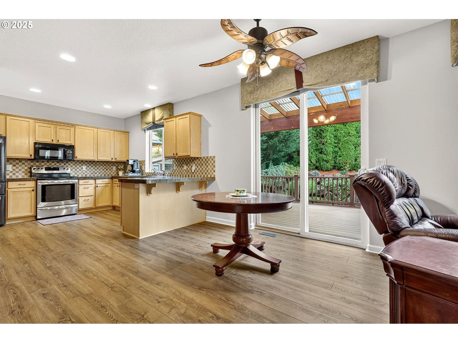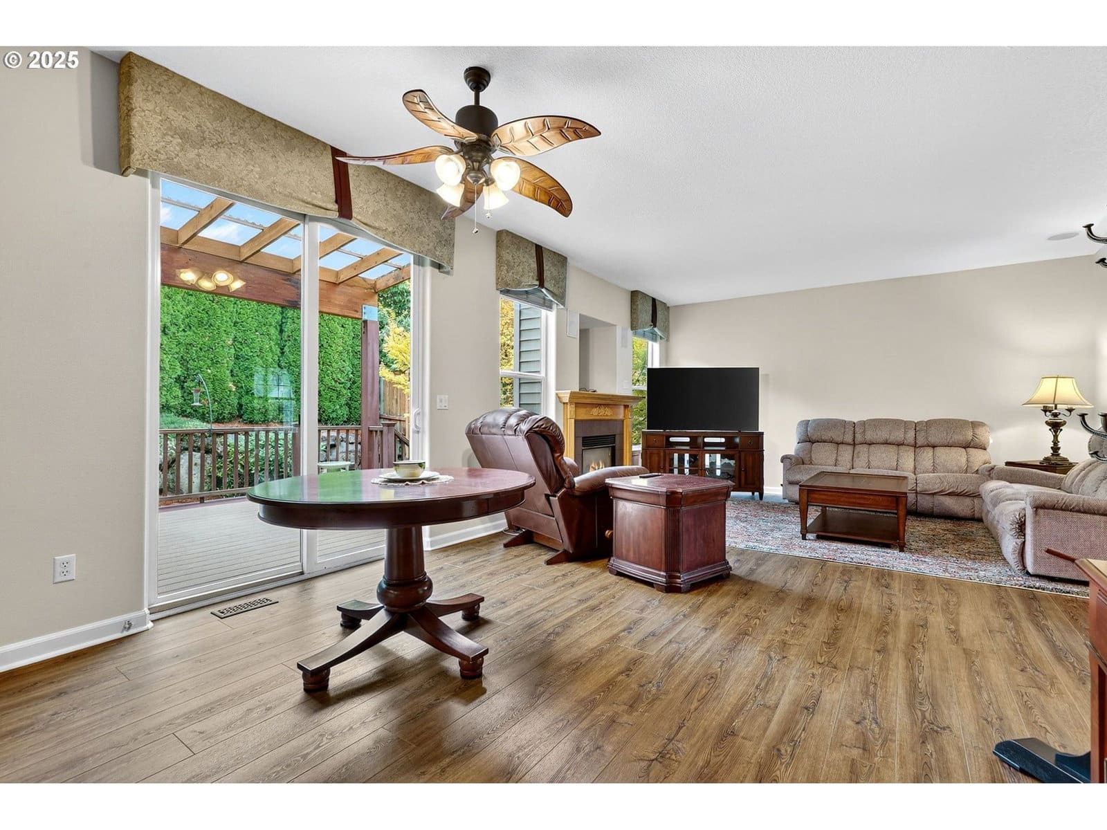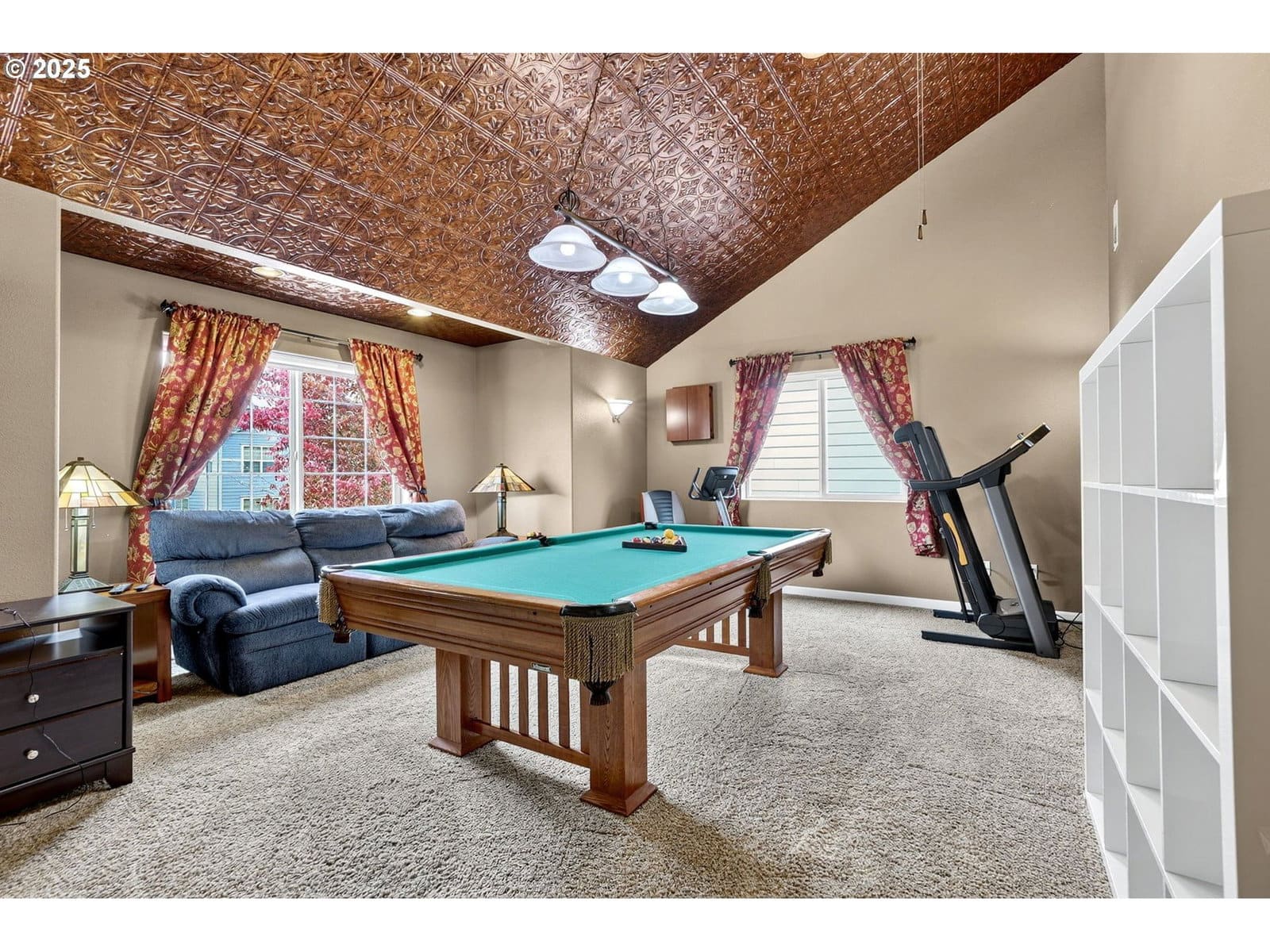Beautiful large home in desirable Alderbrook neighborhood with gorgeous bonus room! All bedrooms on upper level with newer carpet, main level features wood-style floors and open layout. Living room at entry leads to spacious kitchen, dining, and family room area. Family room includes cozy gas fireplace. Dining area has ceiling fan and slider to large covered Trex deck – perfect for year-round entertaining! Kitchen features granite counters, pantry and all appliances included. Convenient half bath on main. Upstairs offers amazing bonus/game room with stunning stamped copper vaulted ceiling – pool table stays! Primary suite includes ceiling fan, walk-in closet and ensuite bath. Upstairs laundry room with washer and dryer included. Enjoy comfort and efficiency with gas heat and central A/C. Major updates: new roof and new flooring & bathrooms remodeled in 2023! Private, low-maintenance fenced backyard surrounded by trees for added privacy. Storage shed stays. Attached 2-car garage with opener provides plenty of storage and parking. Fantastic location just ½ block to neighborhood park. Minutes to schools, McKay Creek Golf Course, multiple Intel campuses, downtown Hillsboro dining, shopping, entertainment, and MAX light rail.Move-in ready, beautifully maintained, and full of features for today’s lifestyle. Enjoy open living spaces, indoor/outdoor entertaining, and easy access to everything Hillsboro has to offer! [Home Energy Score = 6. HES Report at https://rpt.greenbuildingregistry.com/hes/OR10242552]