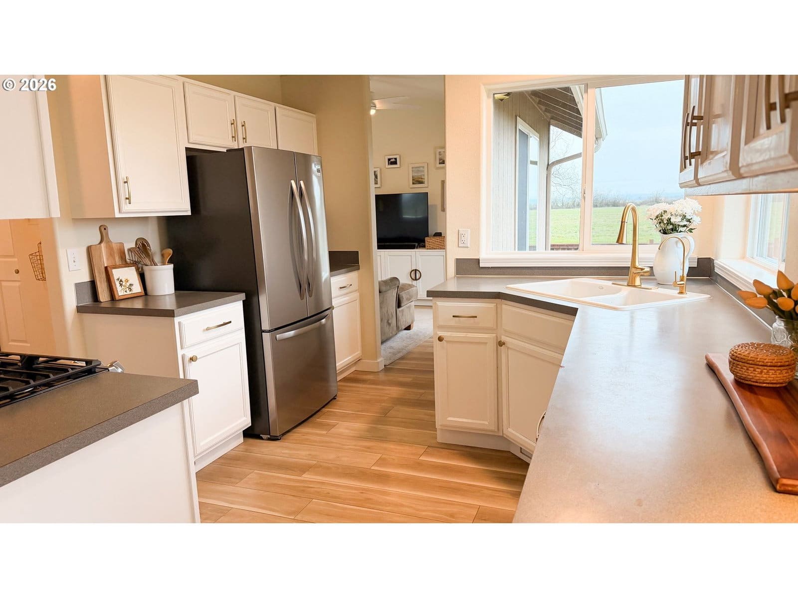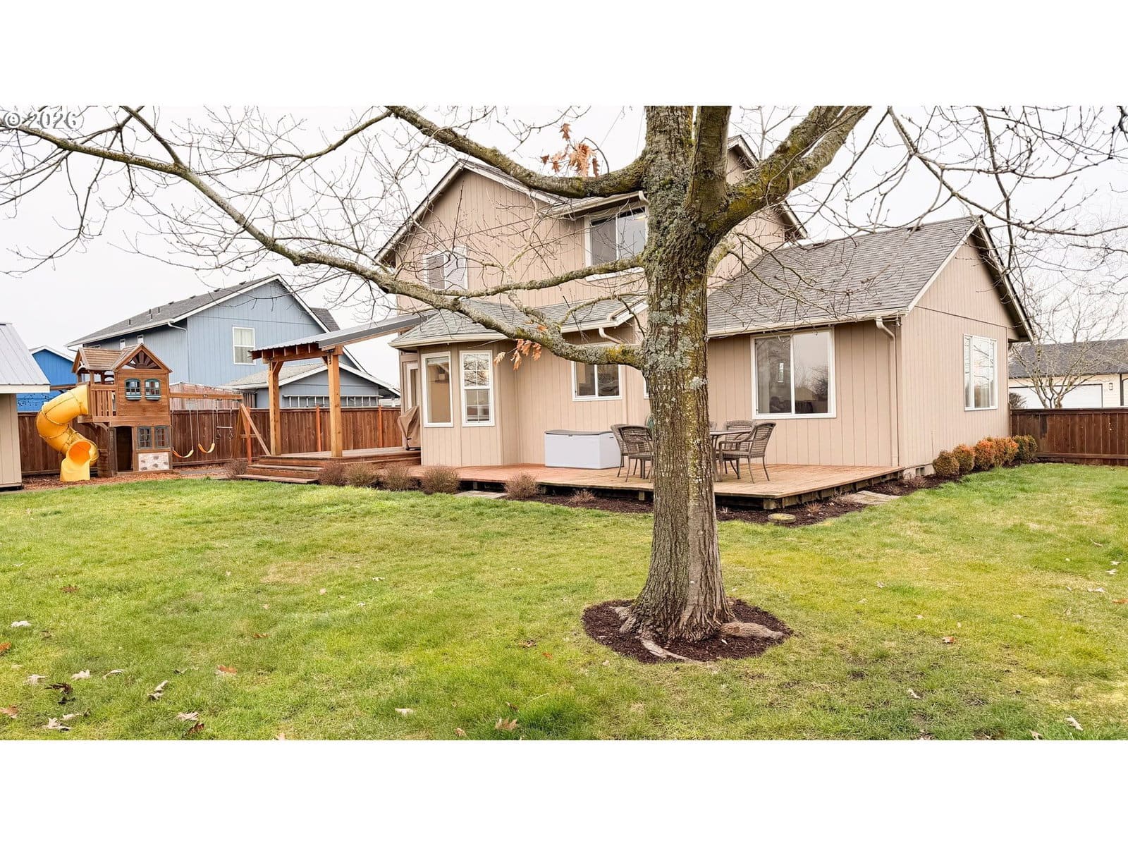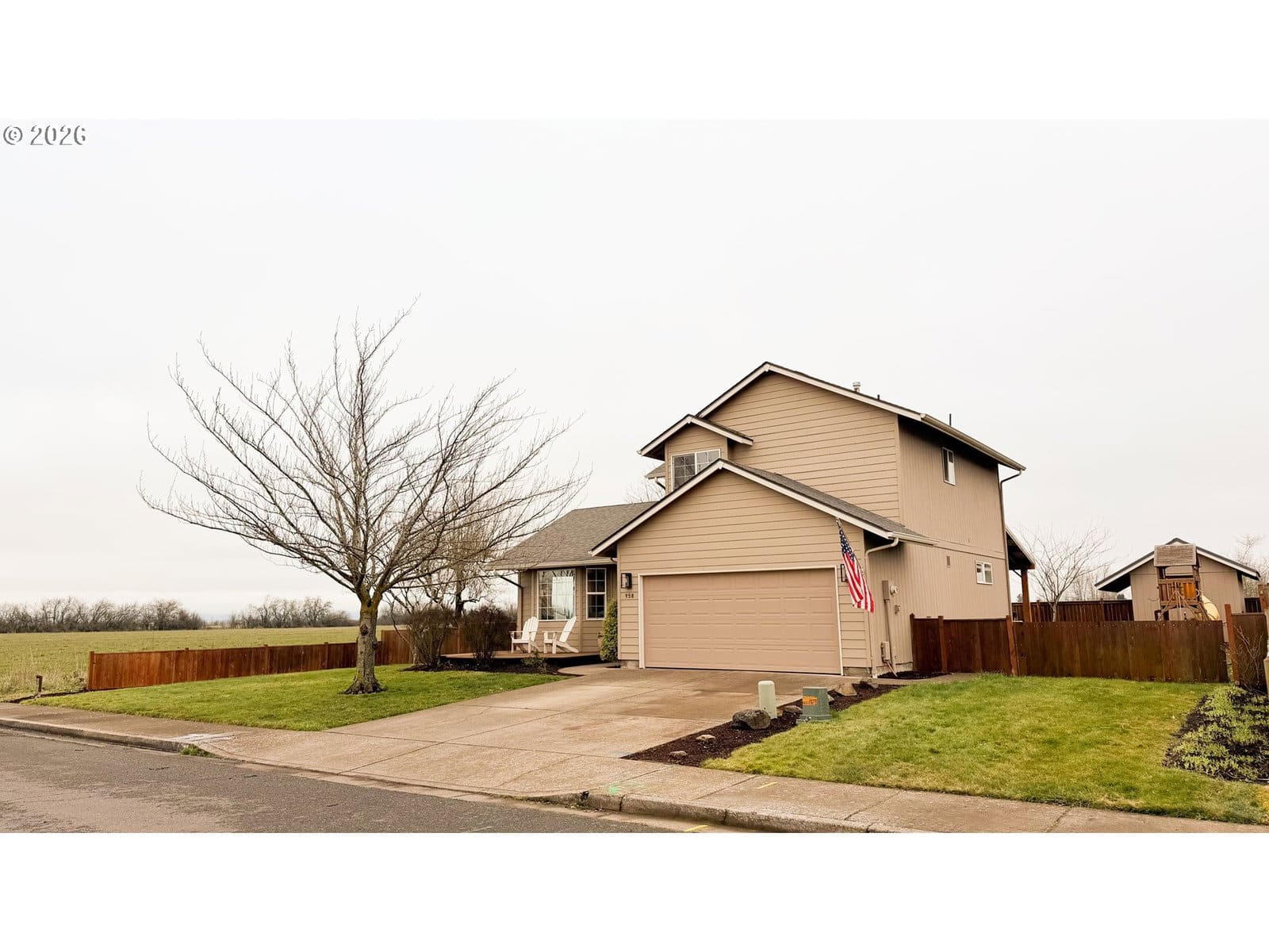 Rare opportunity in Harrisburg at the end of a dead end street. This meticulously cared for home has great privacy as it borders a farm field and has great peaceful views of the sunrise over the valley and the Coburg hills. The well appointed kitchen is perfectly centralized to the family room, dining room, and living room. Up the stairs, you will find three bedrooms and two full baths, including an ensuite primary bedroom. There is an extra half bath located on the main floor. The home is nicely updated with newer LVP flooring, a brand new furnace and AC unit last summer, a whole house water filtration system and reverse osmosis for drinking water, and a newer roof. Step out back through your French doors to a beautiful timber framed cover over your back deck. Enjoy the large fenced backyard with underground sprinklers, raised beds and blueberry plants, as well as a very nice 10 x 14 stick built shed with a metal roof. Top it off with an RV parking area and everything in place for electric hook up, and you have a wonderful private family home with all of the bases covered.