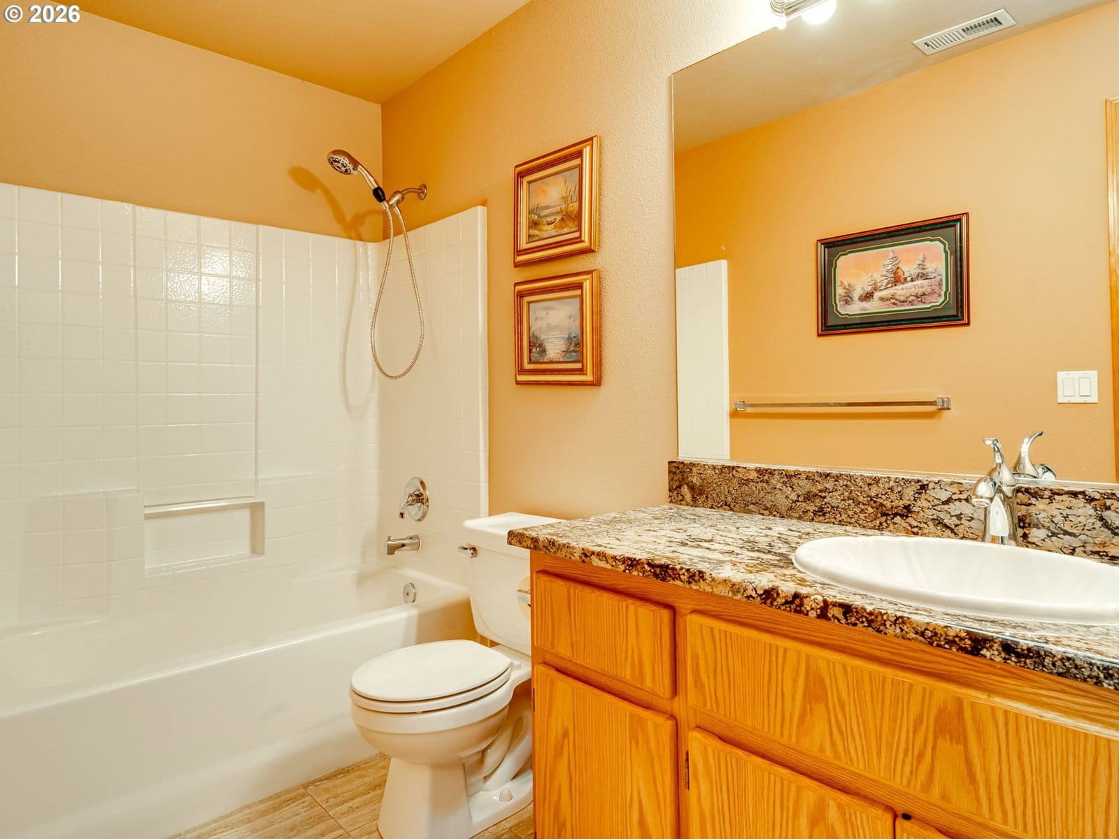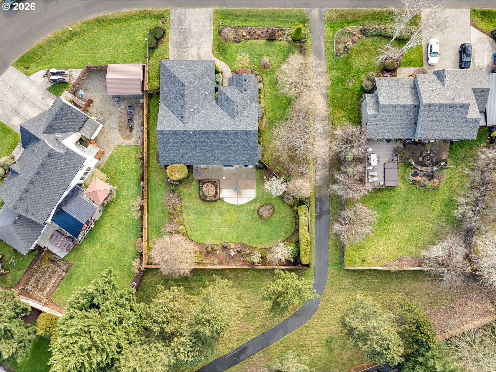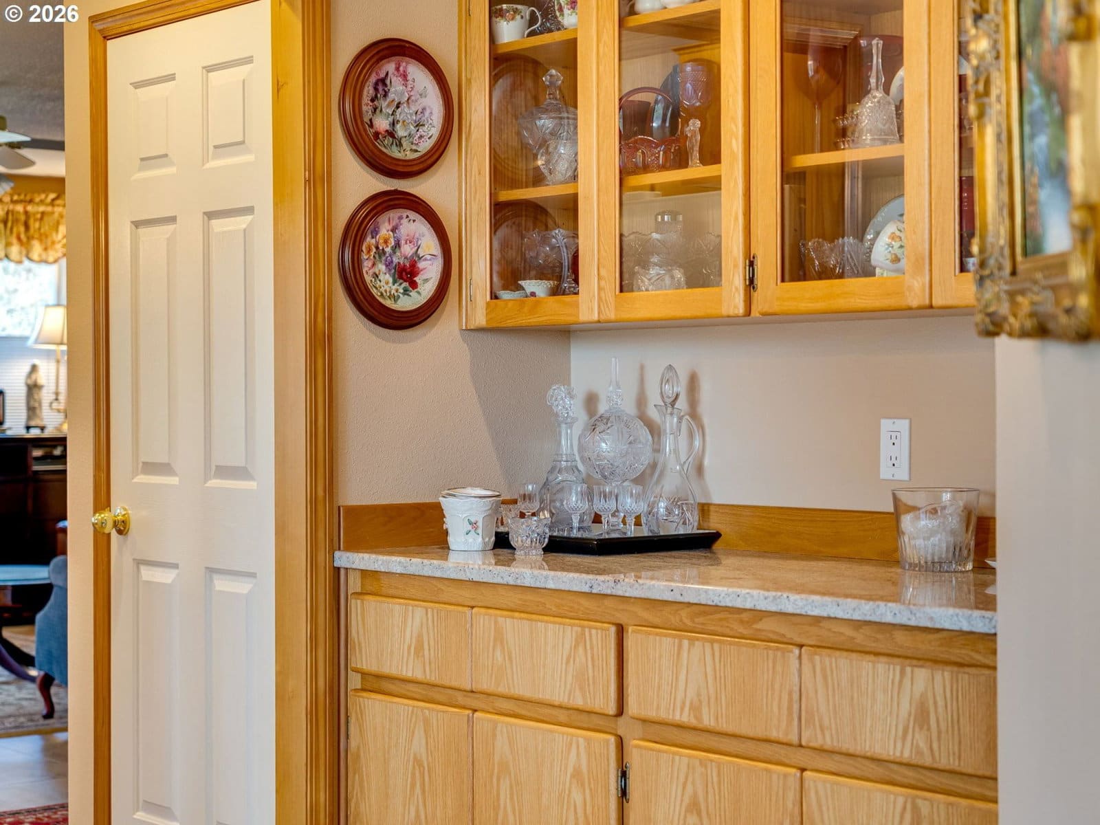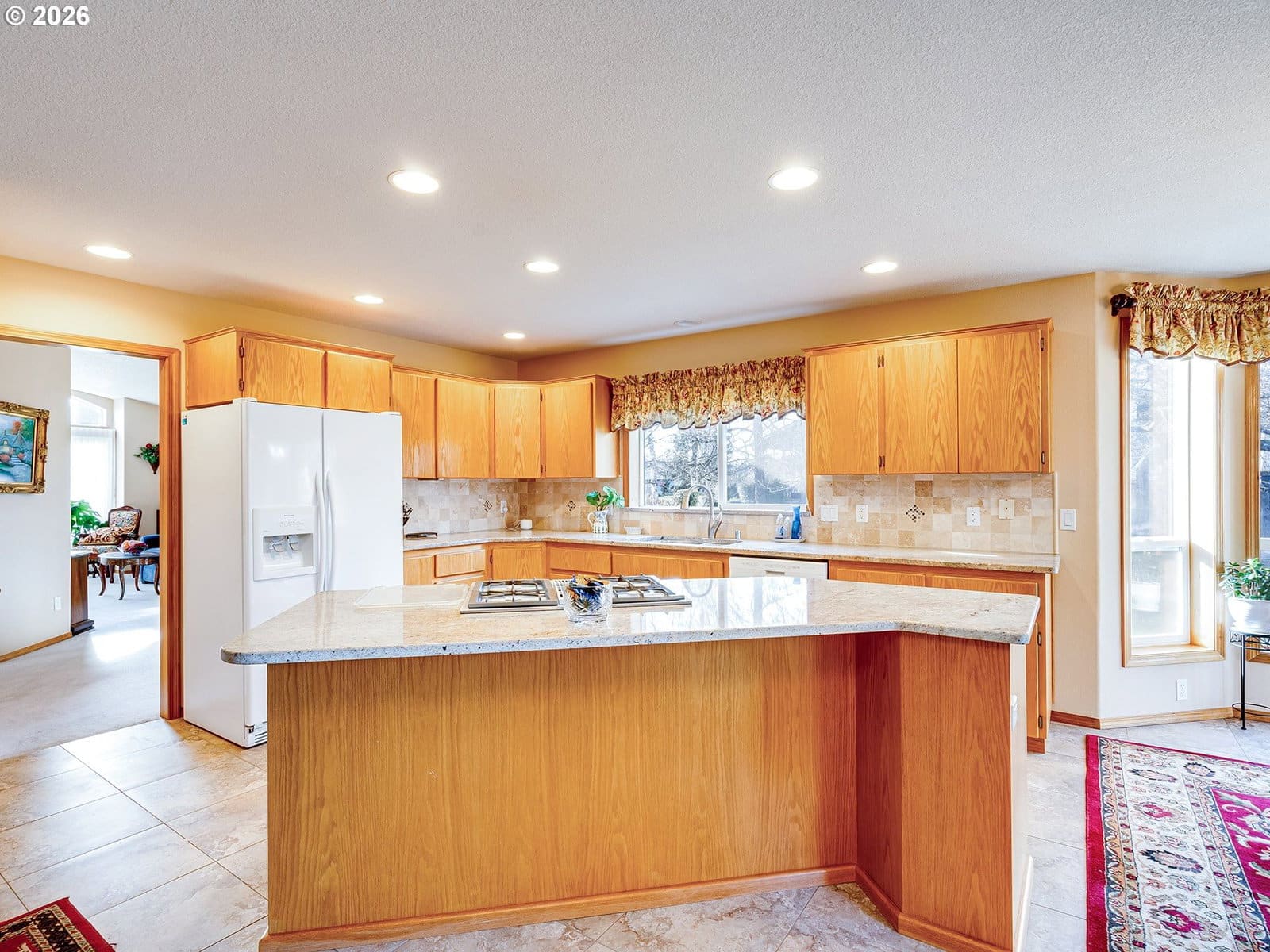 Positioned on a flat, oversized corner lot, this beautiful single-story home offers generous space, thoughtful design, and multiple living and dining areas ideal for the whole family. The formal living room welcomes you with vaulted ceilings and expansive windows that fill the space with natural light. Just beyond, the formal dining room features a built-in banquette and charming bay window, an inviting setting for hosting gatherings. The kitchen feels impressively spacious, offering a large island, abundant cabinetry, and extensive counter space to support all your cooking and entertaining needs. A second dining area sits just off the kitchen and overlooks the backyard, creating a seamless flow for everyday meals. Completing the back of the home is a comfortable family room with fireplace, an ideal spot to unwind and is perfectly positioned within view of the kitchen to keep everyone connected. A large office framed by French doors provides a quiet place to work or study, while the laundry room adds convenience with additional storage and a utility sink. The primary suite is a true retreat, featuring vaulted ceilings, private access to the back patio, and an ensuite with double sinks, a jetted tub, walk-in shower, and a spacious walk-in closet. Step outside to a massive patio that overlooks meticulously maintained landscaping, offering plenty of room for outdoor dining, relaxation, and play. The community enhances daily living with paved walking trails and a convenient location near shopping, parks, and medical facilities.