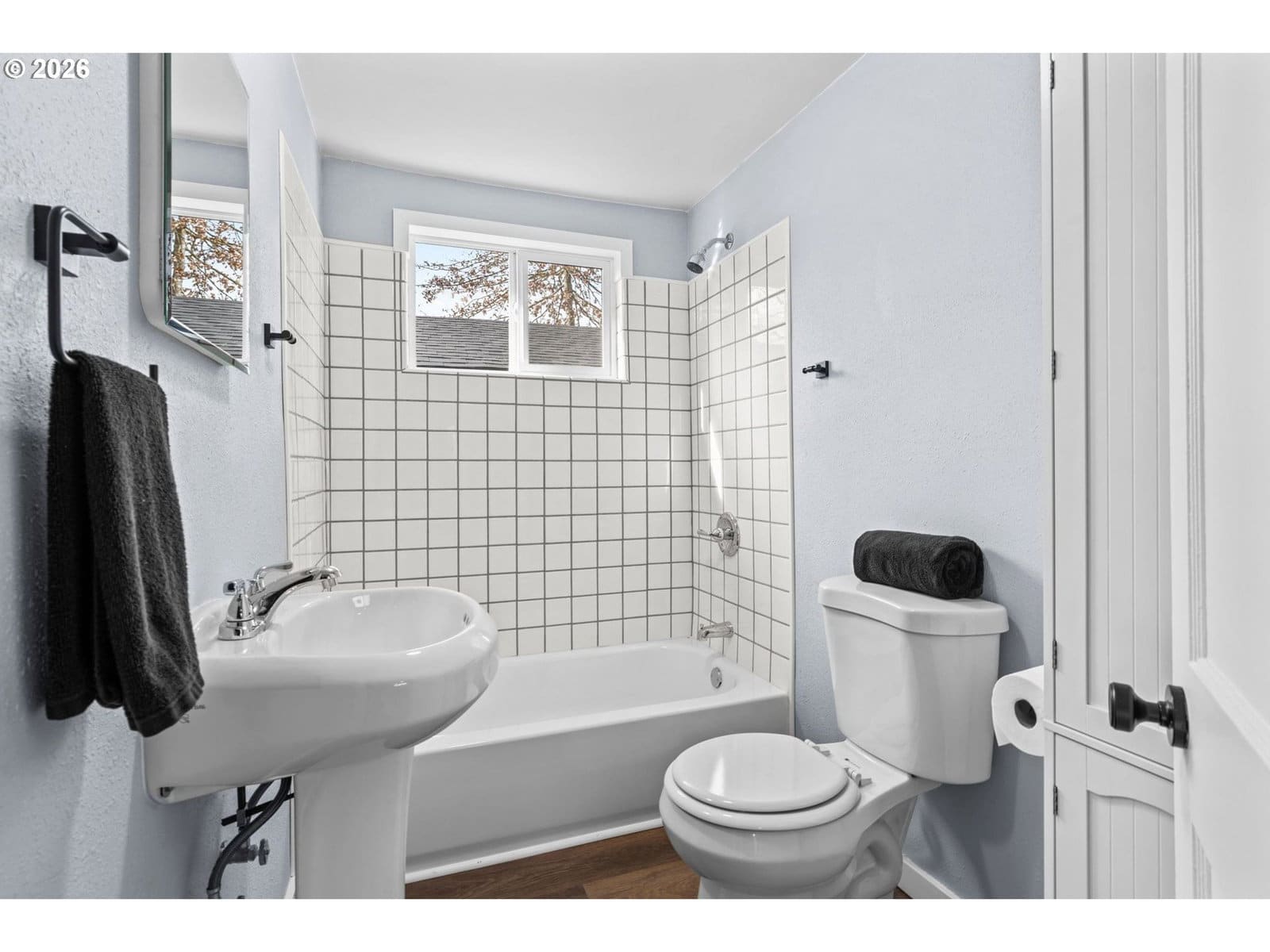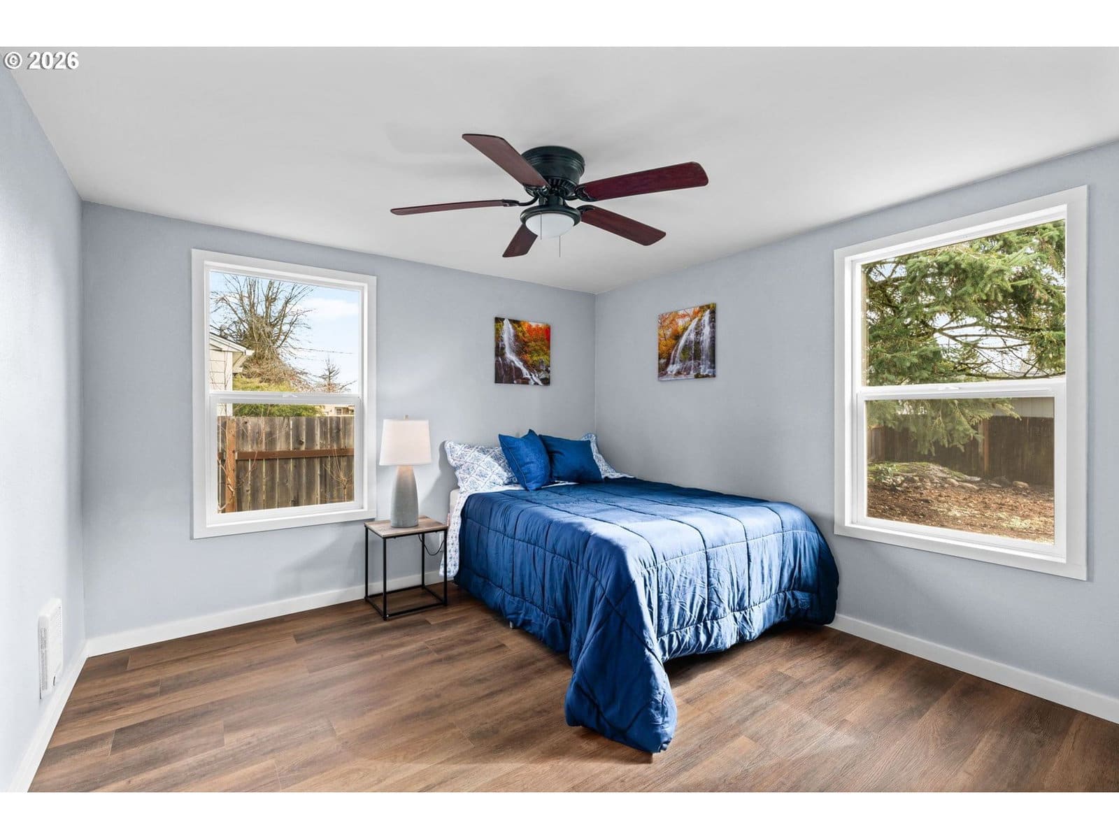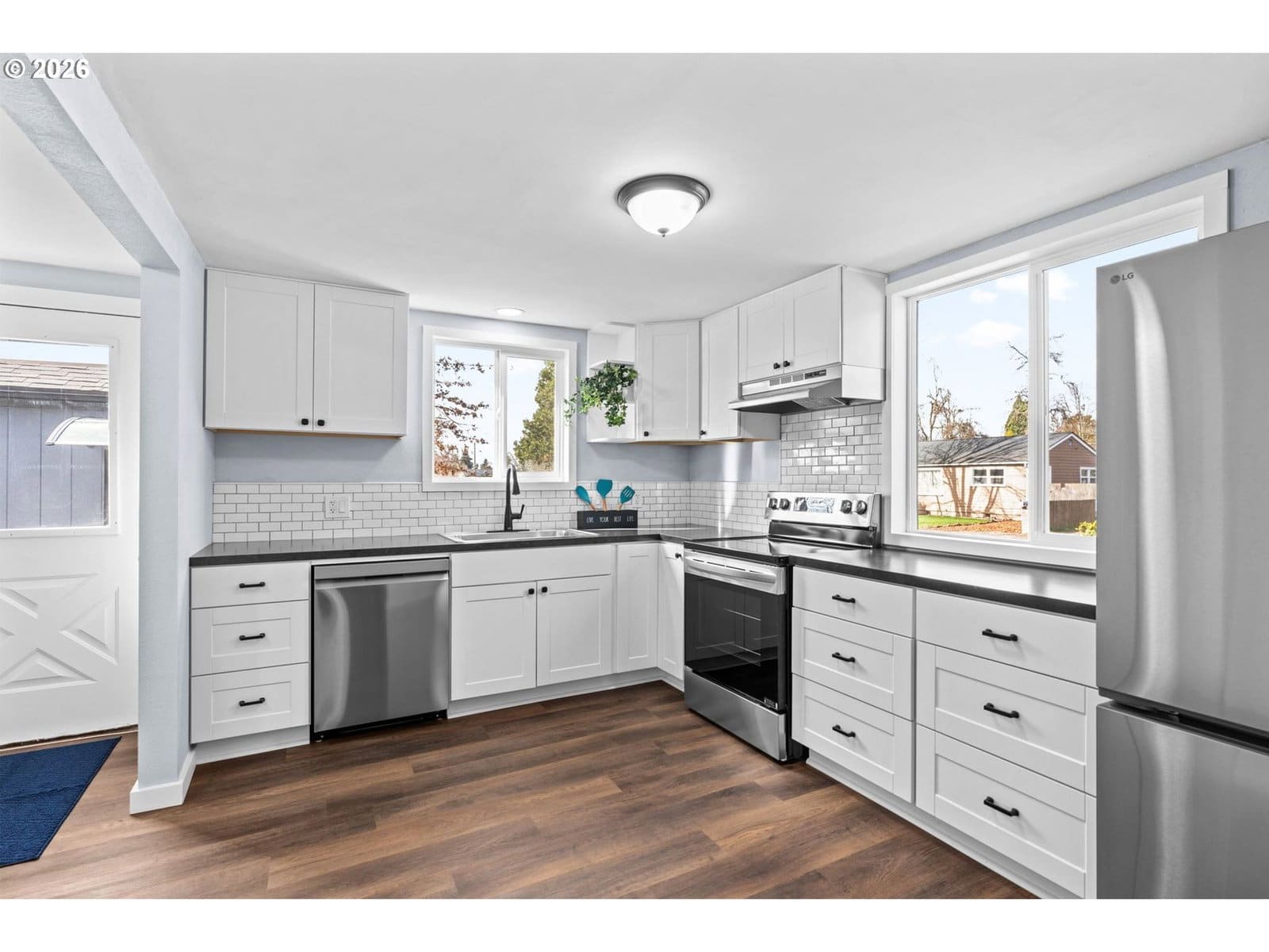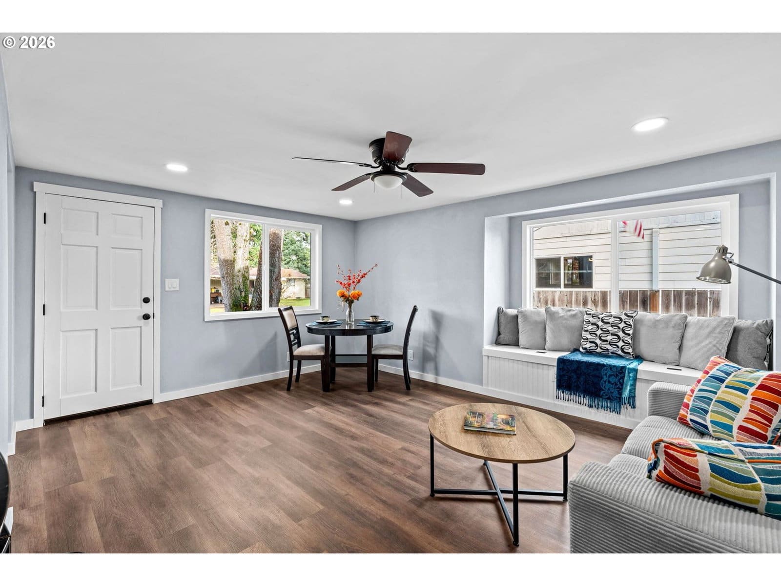 This thoughtfully renovated home offers updated finishes and functional living throughout. The kitchen features new appliances, cabinetry, pantry storage, and modern lighting, opening comfortably into the living room with window seating, built-in storage, a gas stove with tile surround, and ceiling fan. The bathroom has been refreshed with updated tile work and fixtures, and both bedrooms include added closets, ceiling fans, and efficient cadet heaters. A practical mudroom provides washer and dryer space, utility storage, and expanded access to the kitchen.Situated on a large, private lot, the exterior includes a new roof, siding, windows, doors, and updated landscaping. A couple of large trees add character and shade, while the detached one-car garage provides flexibility for parking, storage, or workspace. The spacious backyard offers plenty of room to relax, garden, entertain, or customize to your needs.