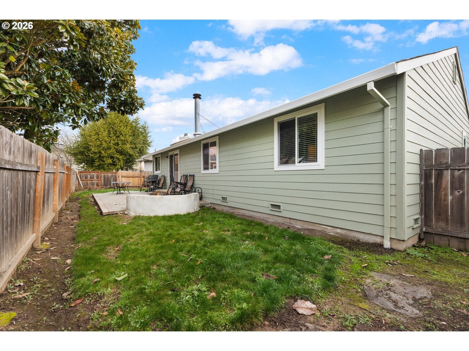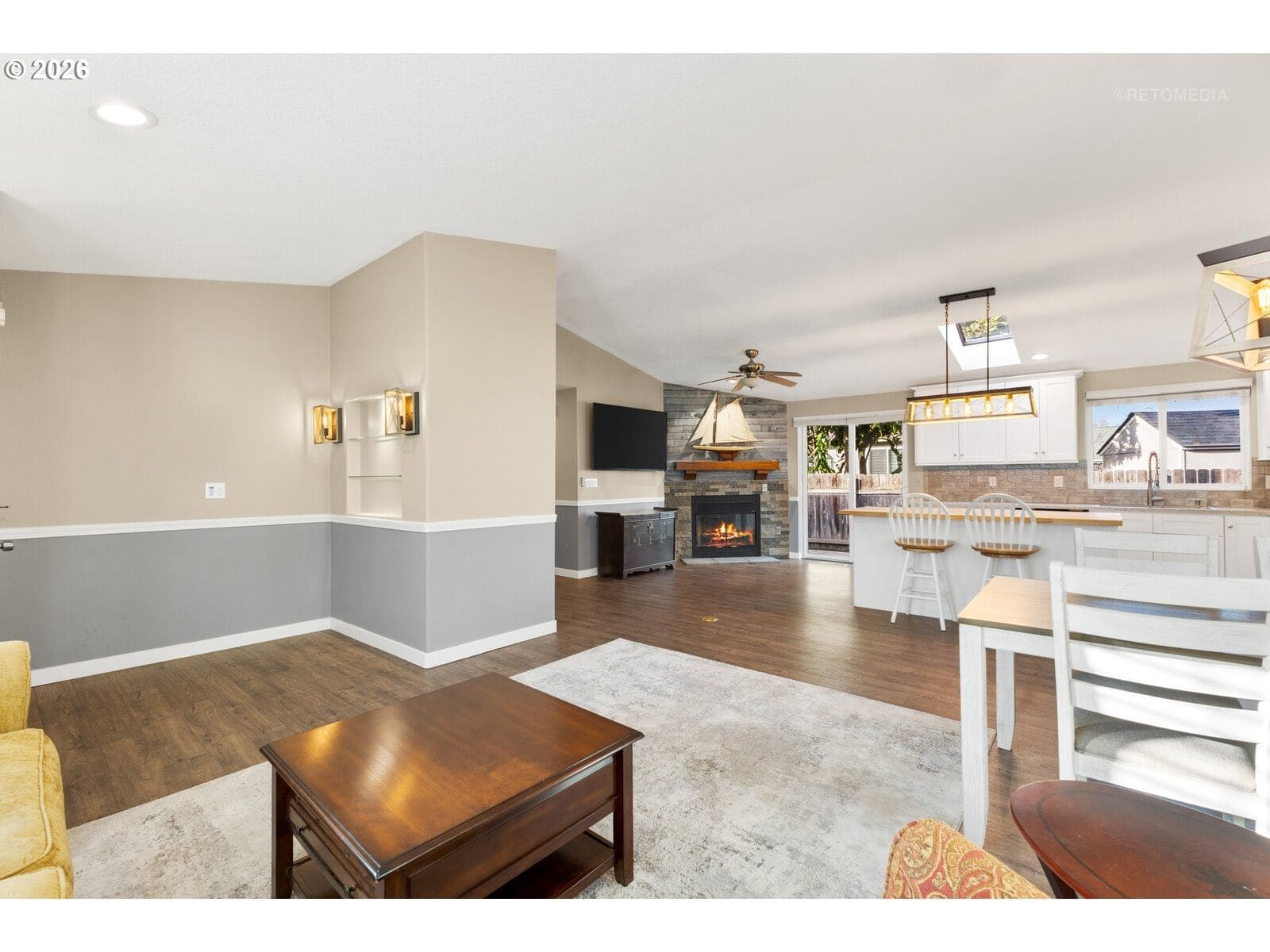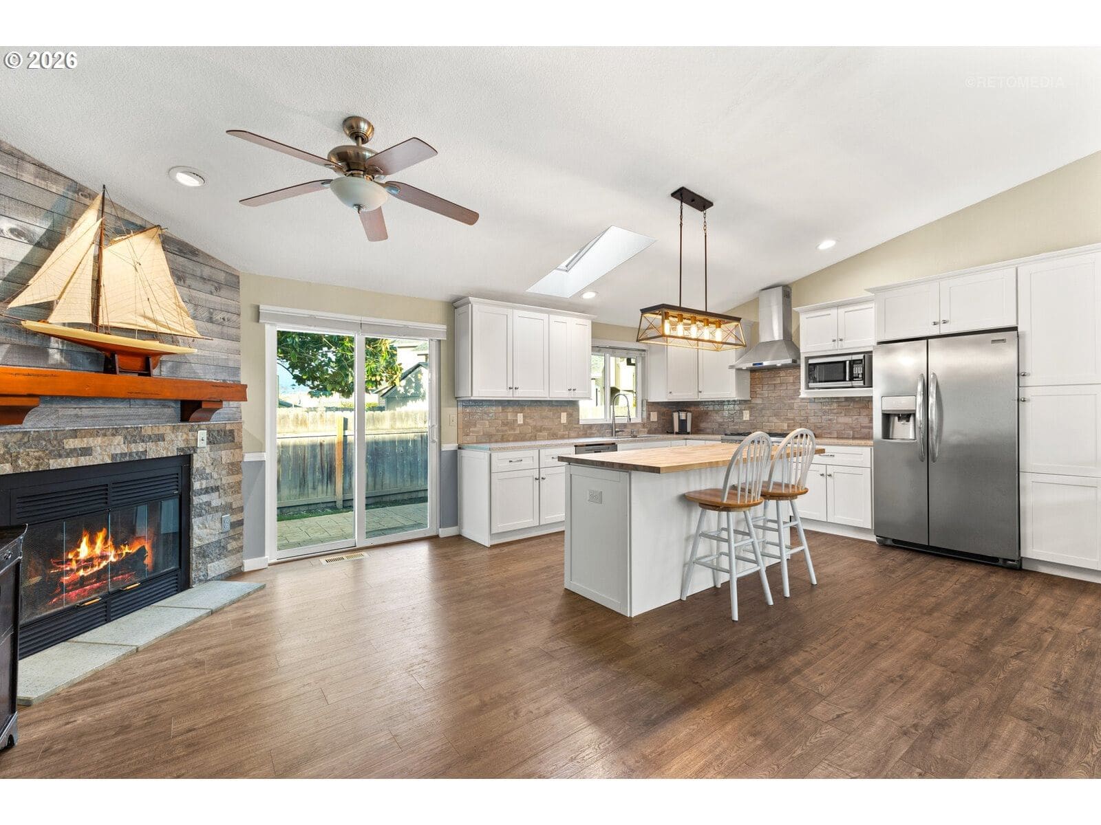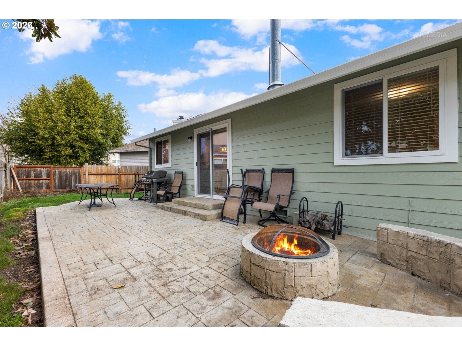 Bright, refreshed, and truly move-in ready, this Rock Creek home delivers stylish one-level living designed for comfort and connection! Just inside, a well-organized entry with a convenient drop zone keeps the daily essentials organized. Vaulted ceilings, bay windows, and plantation shutters fill the living room with natural light, while the adjacent dining area provides a welcoming space to gather. The chef’s kitchen impresses with quartz surfaces, a full-height tile backsplash, custom cabinetry, a statement Bertazzoni range, and a Miele dishwasher. Everyday ease with generous counter space, pantry storage, and a large island with eat-bar seating, perfect for casual meals and conversation. The family room centers around a showpiece fireplace with floor-to-ceiling tile and a reclaimed wood mantel, opening to effortless indoor-outdoor living through a slider to the extended patio. Luxury vinyl plank flooring runs throughout the main living areas. The private primary suite offers a relaxing retreat with a walk-in closet and refreshed bath featuring a dual-sink vanity and tile-wrapped walk-in shower. Two additional well-sized bedrooms and a stylishly updated hall bath with beadboard accents provide flexibility for family and guests. A laundry closet with built-ins includes the washer and dryer. Outside, enjoy a fully fenced backyard with stamped concrete patio, firepit, and built-in seating, ideal for relaxing evenings and entertaining. Additional highlights include central air conditioning, a 2-car garage, and recent updates such as exterior paint and driveway (2024), along with kitchen cabinets, quartz counters, and skylight (2023). Ideally located in the coveted Rock Creek neighborhood, convenient to HWY 26, schools, shopping, dining, parks, and trails, this is one-level living done right!