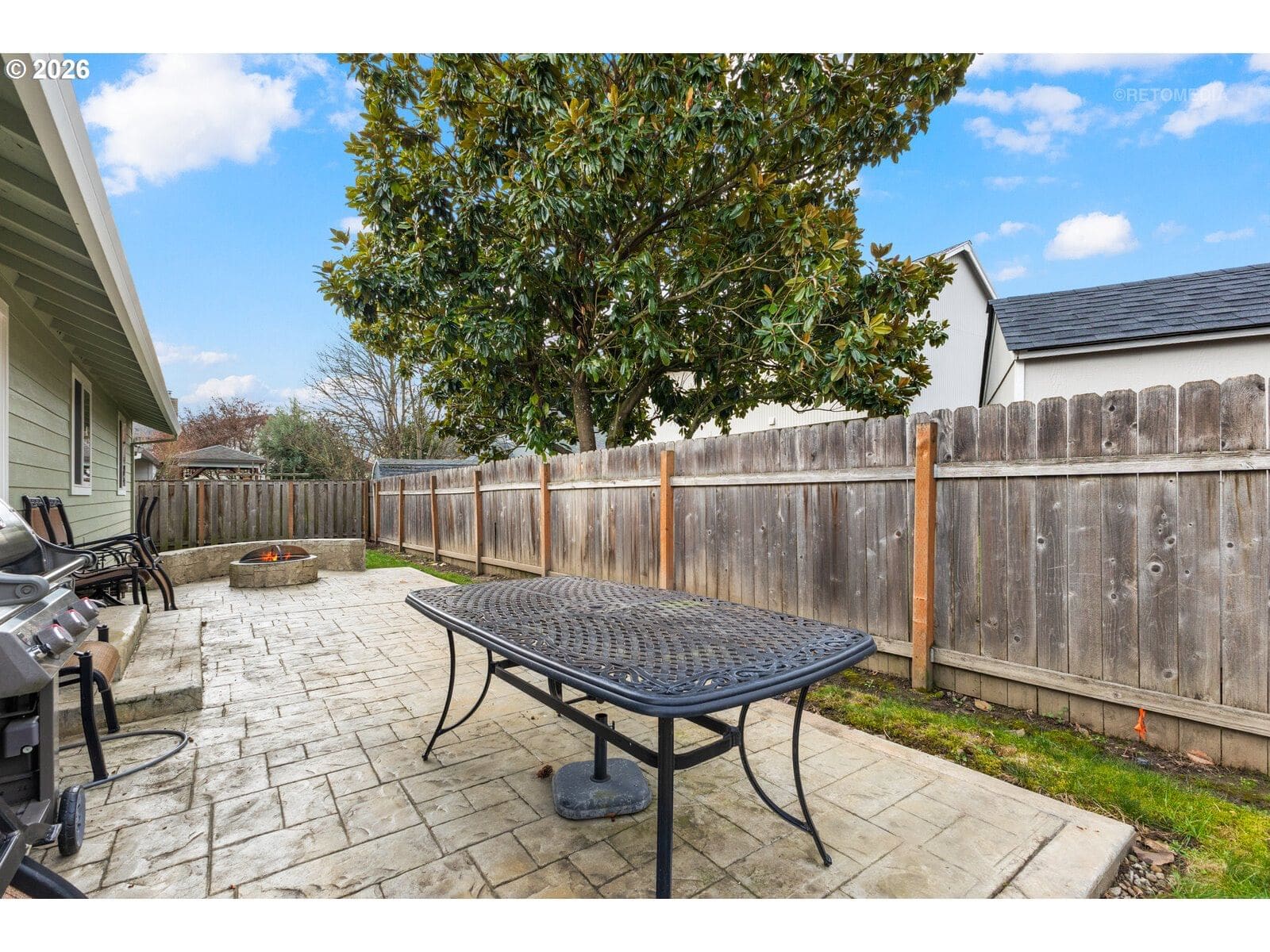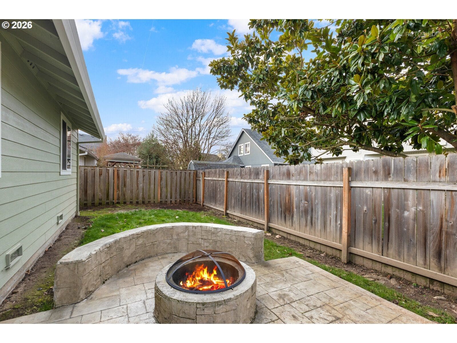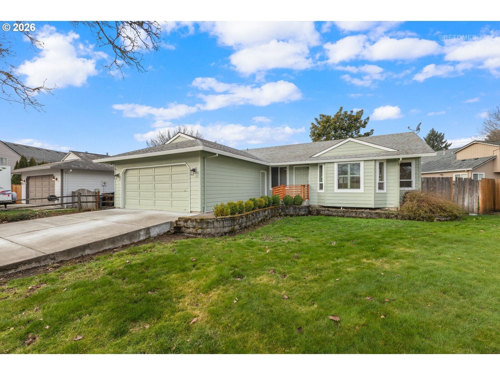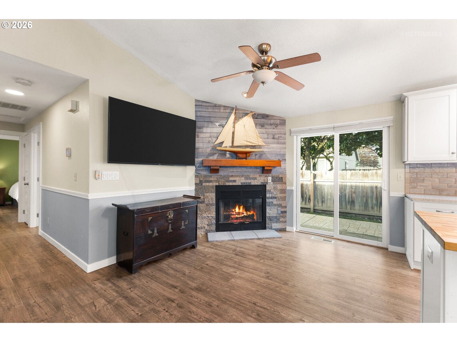 Bright, refreshed, and truly move-in ready, this Rock Creek home delivers stylish one-level living designed for comfort and connection! Just inside, a well-organized entry with a convenient drop zone keeps the daily essentials organized. Vaulted ceilings, bay windows, and plantation shutters fill the living room with natural light, while the adjacent dining area provides a welcoming space to gather. The chef’s kitchen impresses with quartz surfaces, a full-height tile backsplash, custom cabinetry, a statement Bertazzoni range, and a Miele dishwasher. Everyday ease with generous counter space, pantry storage, and a large island with eat-bar seating, perfect for casual meals and conversation. The family room centers around a showpiece fireplace with floor-to-ceiling tile and a reclaimed wood mantel, opening to effortless indoor-outdoor living through a slider to the extended patio. Luxury vinyl plank flooring runs throughout the main living areas. The private primary suite offers a relaxing retreat with a walk-in closet and refreshed bath featuring a dual-sink vanity and tile-wrapped walk-in shower. Two additional well-sized bedrooms and a stylishly updated hall bath with beadboard accents provide flexibility for family and guests. A laundry closet with built-ins includes the washer and dryer. Outside, enjoy a fully fenced backyard with stamped concrete patio, firepit, and built-in seating, ideal for relaxing evenings and entertaining. Additional highlights include central air conditioning, a 2-car garage, and recent updates such as exterior paint and driveway (2024), along with kitchen cabinets, quartz counters, and skylight (2023). Ideally located in the coveted Rock Creek neighborhood, convenient to HWY 26, schools, shopping, dining, parks, and trails, this is one-level living done right!