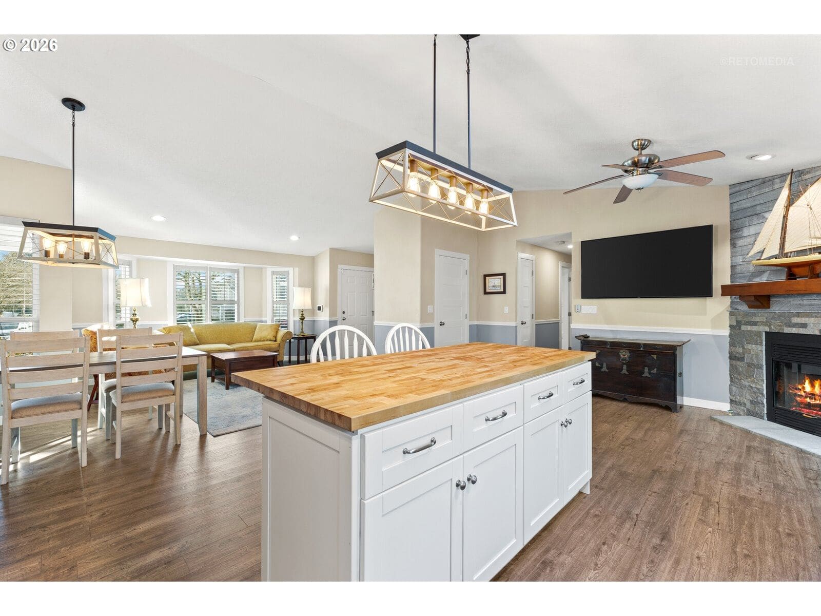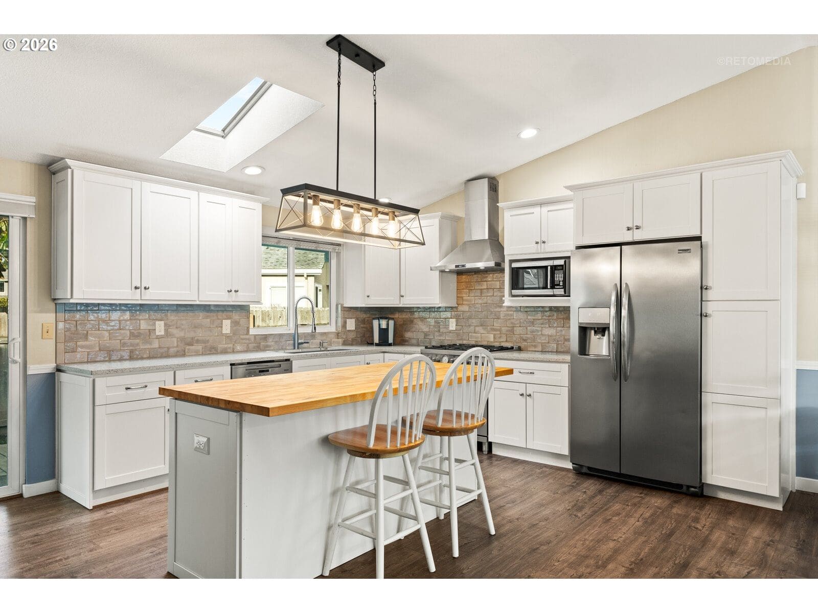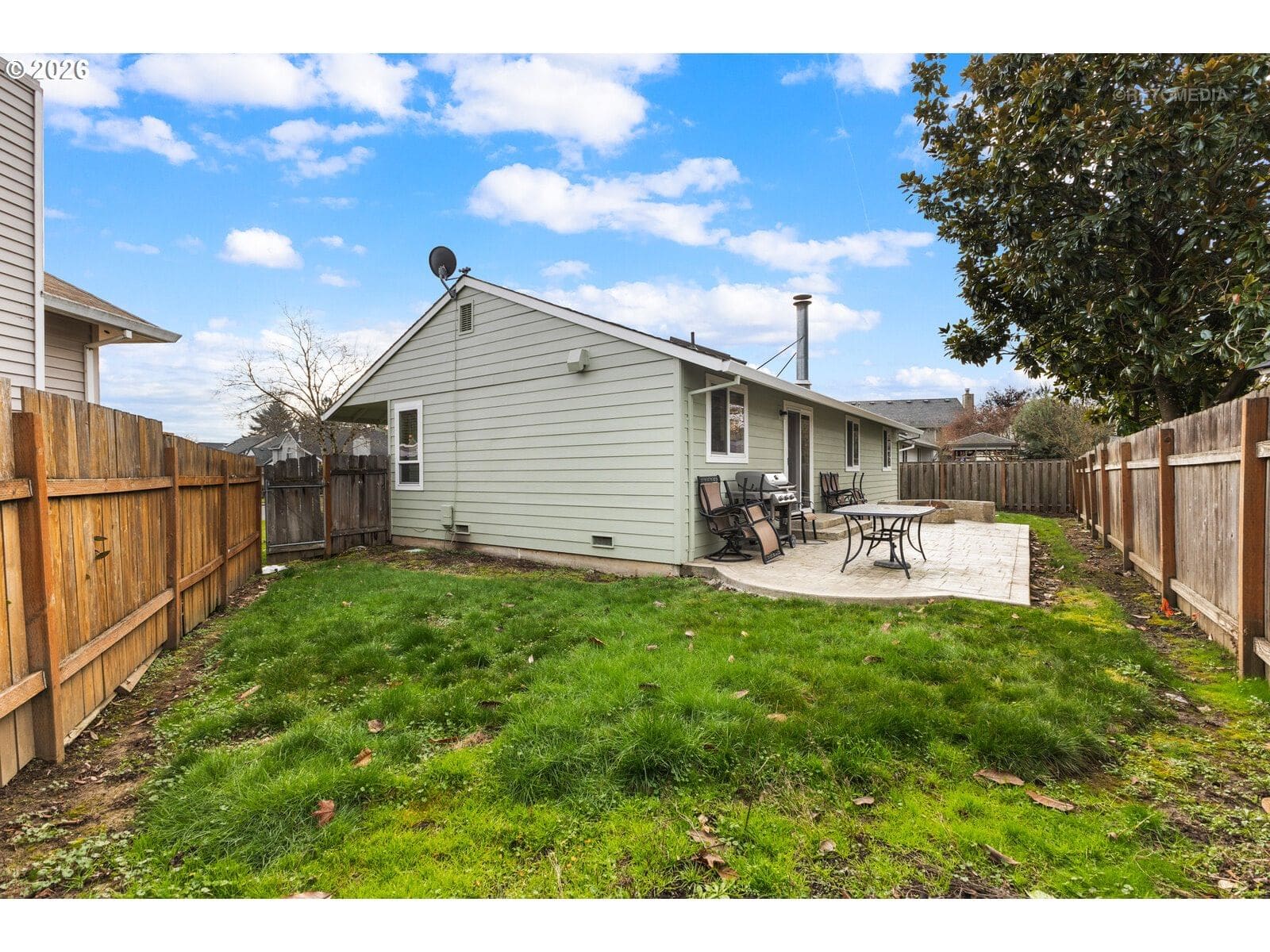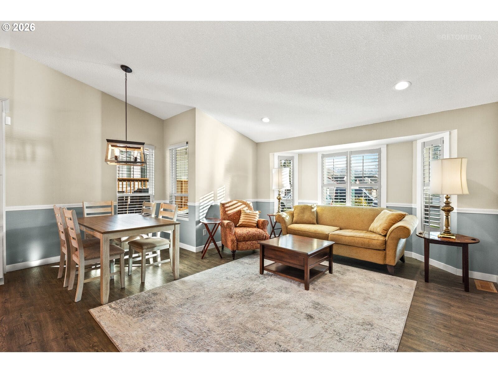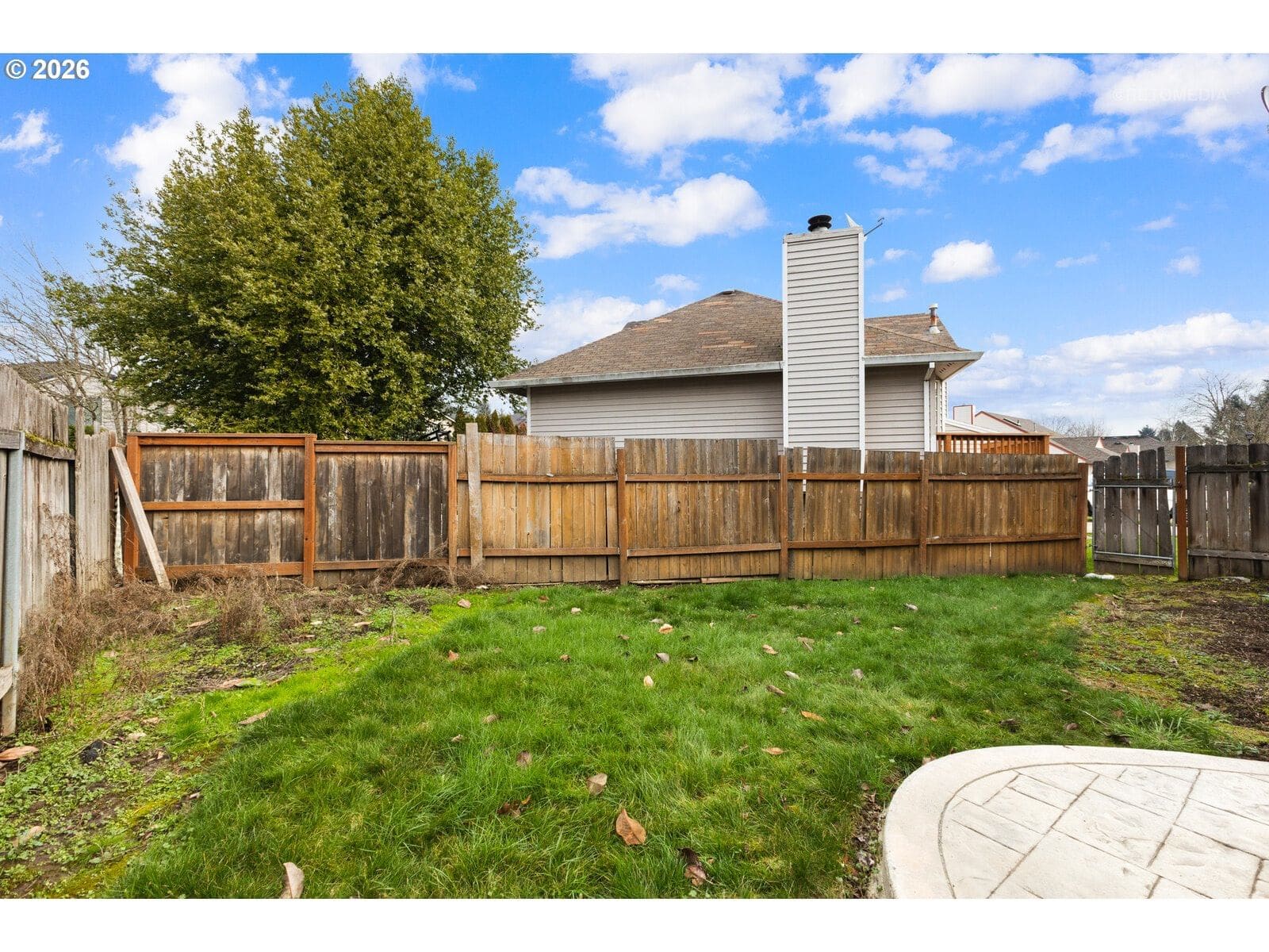 Bright, refreshed, and truly move-in ready, this Rock Creek home delivers stylish one-level living designed for comfort and connection! Just inside, a well-organized entry with a convenient drop zone keeps the daily essentials organized. Vaulted ceilings, bay windows, and plantation shutters fill the living room with natural light, while the adjacent dining area provides a welcoming space to gather. The chef’s kitchen impresses with quartz surfaces, a full-height tile backsplash, custom cabinetry, a statement Bertazzoni range, and a Miele dishwasher. Everyday ease with generous counter space, pantry storage, and a large island with eat-bar seating, perfect for casual meals and conversation. The family room centers around a showpiece fireplace with floor-to-ceiling tile and a reclaimed wood mantel, opening to effortless indoor-outdoor living through a slider to the extended patio. Luxury vinyl plank flooring runs throughout the main living areas. The private primary suite offers a relaxing retreat with a walk-in closet and refreshed bath featuring a dual-sink vanity and tile-wrapped walk-in shower. Two additional well-sized bedrooms and a stylishly updated hall bath with beadboard accents provide flexibility for family and guests. A laundry closet with built-ins includes the washer and dryer. Outside, enjoy a fully fenced backyard with stamped concrete patio, firepit, and built-in seating, ideal for relaxing evenings and entertaining. Additional highlights include central air conditioning, a 2-car garage, and recent updates such as exterior paint and driveway (2024), along with kitchen cabinets, quartz counters, and skylight (2023). Ideally located in the coveted Rock Creek neighborhood, convenient to HWY 26, schools, shopping, dining, parks, and trails, this is one-level living done right!