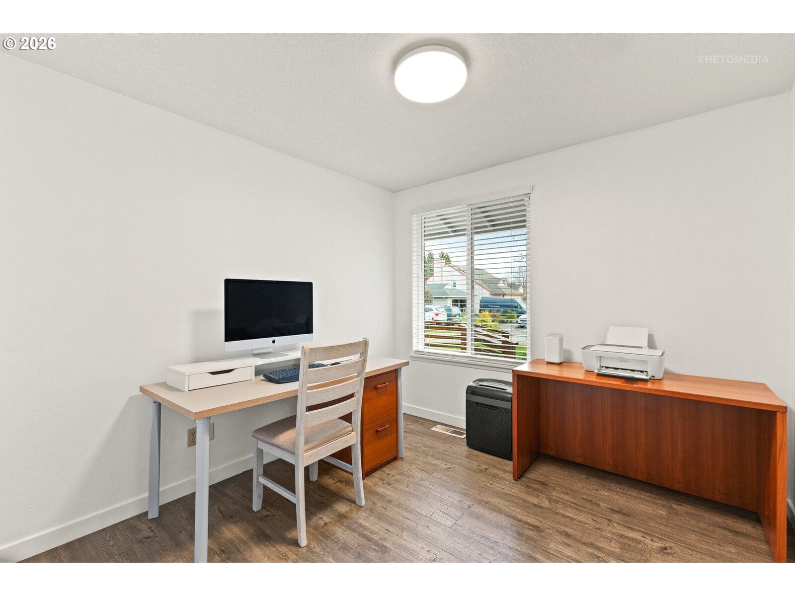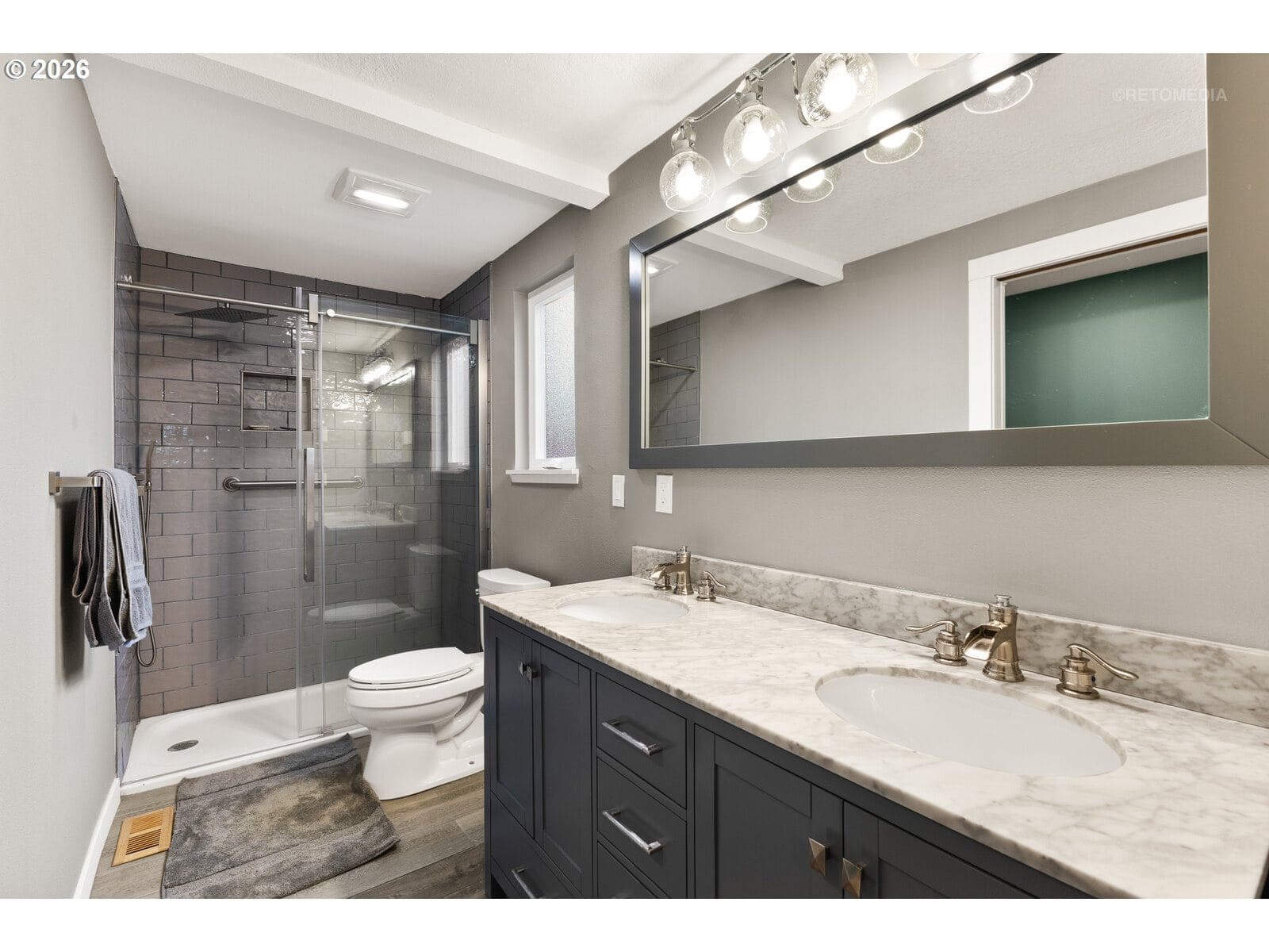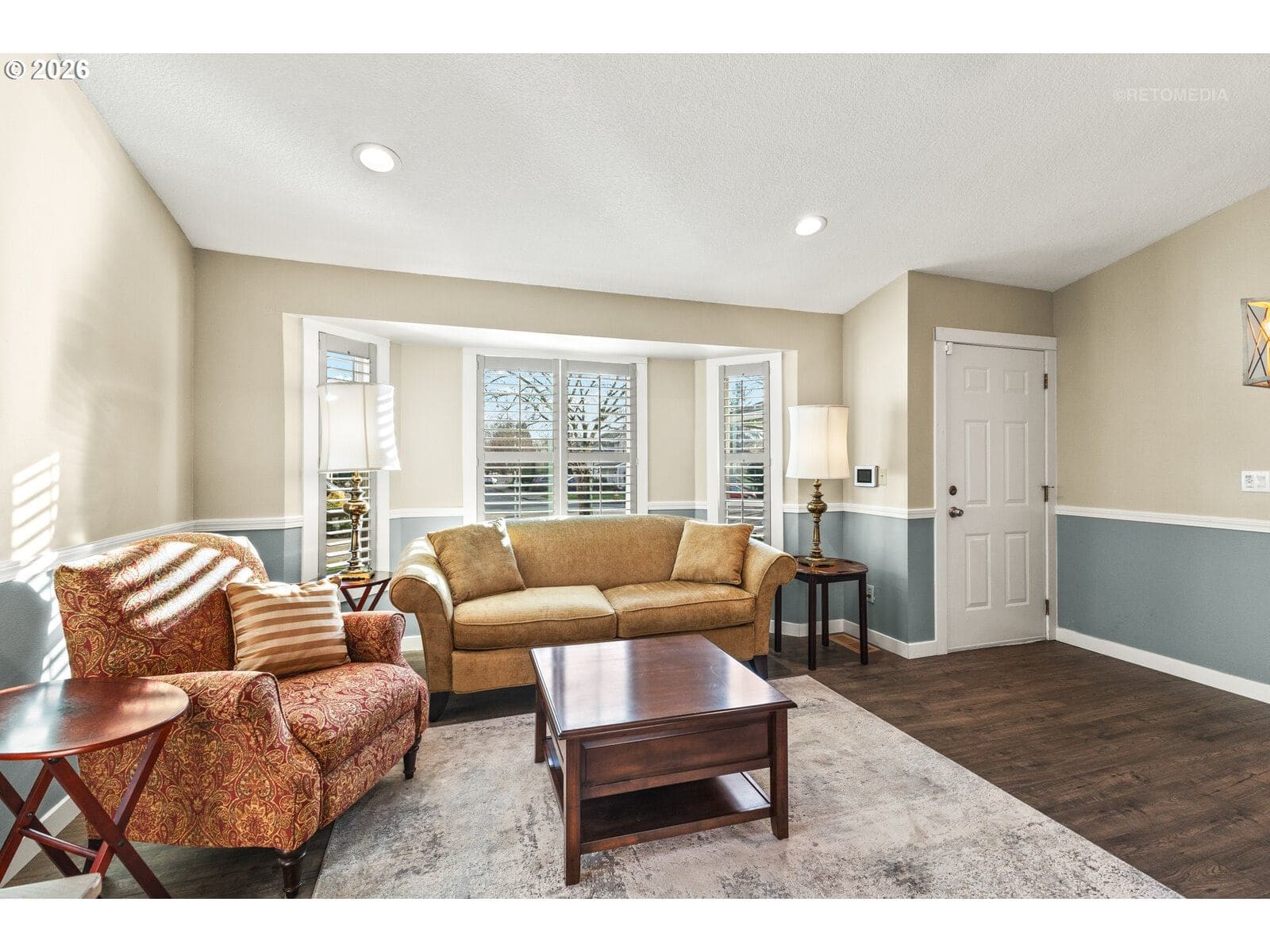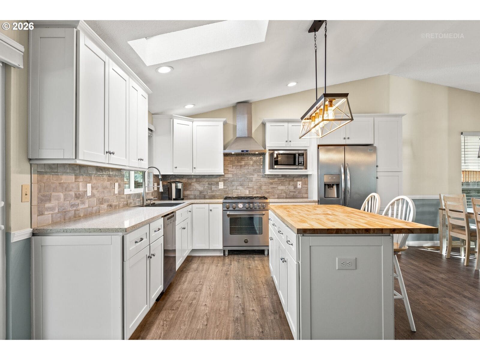 Bright, refreshed, and truly move-in ready, this Rock Creek home delivers stylish one-level living designed for comfort and connection! Just inside, a well-organized entry with a convenient drop zone keeps the daily essentials organized. Vaulted ceilings, bay windows, and plantation shutters fill the living room with natural light, while the adjacent dining area provides a welcoming space to gather. The chef’s kitchen impresses with quartz surfaces, a full-height tile backsplash, custom cabinetry, a statement Bertazzoni range, and a Miele dishwasher. Everyday ease with generous counter space, pantry storage, and a large island with eat-bar seating, perfect for casual meals and conversation. The family room centers around a showpiece fireplace with floor-to-ceiling tile and a reclaimed wood mantel, opening to effortless indoor-outdoor living through a slider to the extended patio. Luxury vinyl plank flooring runs throughout the main living areas. The private primary suite offers a relaxing retreat with a walk-in closet and refreshed bath featuring a dual-sink vanity and tile-wrapped walk-in shower. Two additional well-sized bedrooms and a stylishly updated hall bath with beadboard accents provide flexibility for family and guests. A laundry closet with built-ins includes the washer and dryer. Outside, enjoy a fully fenced backyard with stamped concrete patio, firepit, and built-in seating, ideal for relaxing evenings and entertaining. Additional highlights include central air conditioning, a 2-car garage, and recent updates such as exterior paint and driveway (2024), along with kitchen cabinets, quartz counters, and skylight (2023). Ideally located in the coveted Rock Creek neighborhood, convenient to HWY 26, schools, shopping, dining, parks, and trails, this is one-level living done right!