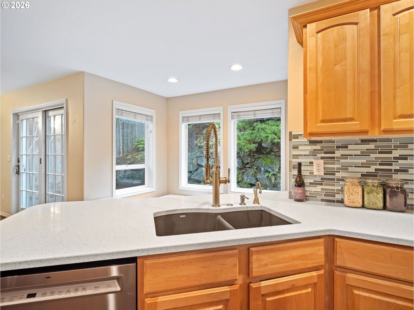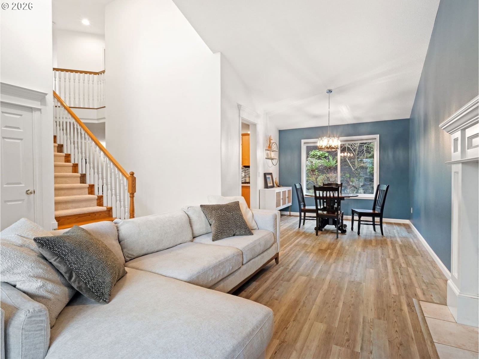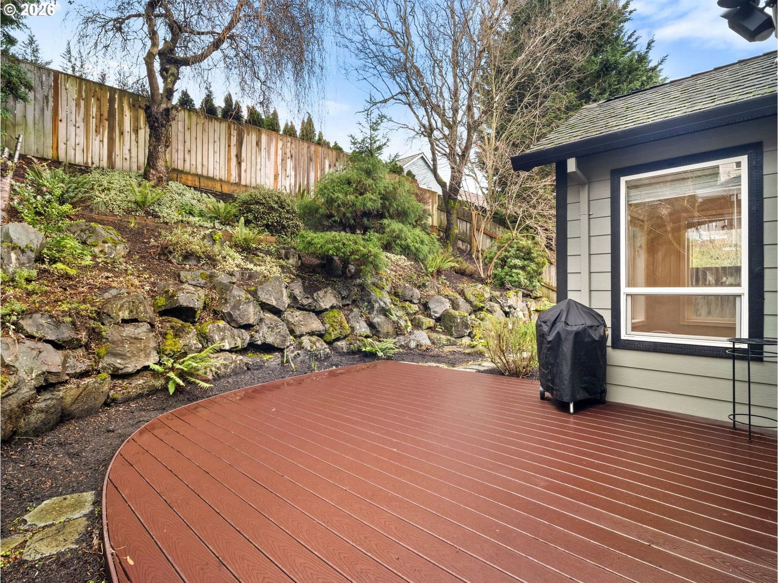 Nestled in the idyllic Bull Mountain community, this charming abode offers comfort, privacy, and an unbeatable location. Vaulted ceilings highlight the spacious living and dining rooms, creating an open, welcoming atmosphere. Every room including living areas, kitchen, family room, and bedrooms shine with natural light. The kitchen features quartz counters, stainless steel appliances, ample storage, and surrounding views of the peaceful backyard. On the upper level, the large primary suite includes vaulted ceilings, a walk-in closet, dual sinks, and a jetted tub. Two additional bedrooms are generously sized, each with vaulted ceilings and backyard views. Step outside to a tranquil, private backyard with a low-maintenance Trex deck and chiminea—perfect for relaxing or entertaining. Enjoy a walkable neighborhood and a prime location less than a mile from Progress Ridge shopping, restaurants, and cinema. Numerous updates provide peace of mind, including a newer gas furnace, dishwasher, air conditioner, microwave, washer/dryer, water heater, new flooring, and new carpet. This Bull Mountain beauty blends style, charm, and modern convenience in an ideal Portland metro-area location. Don’t miss it!