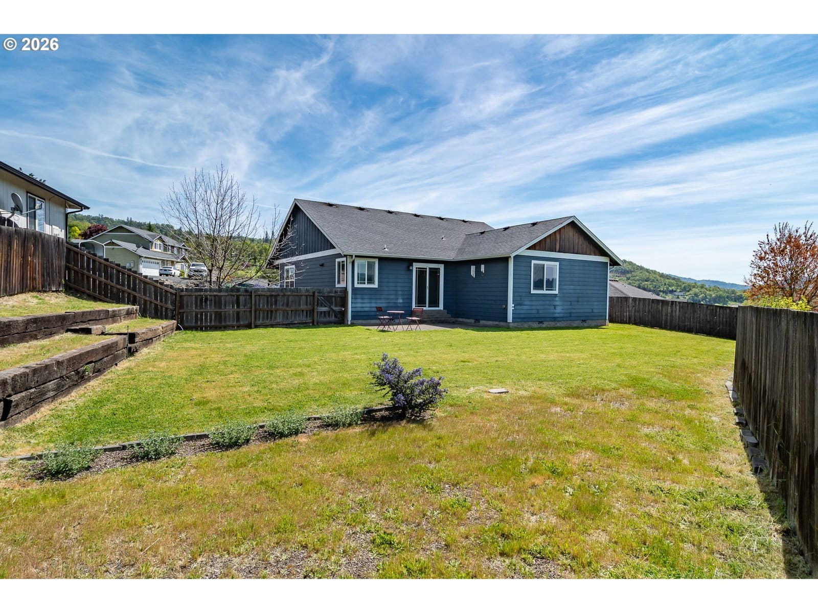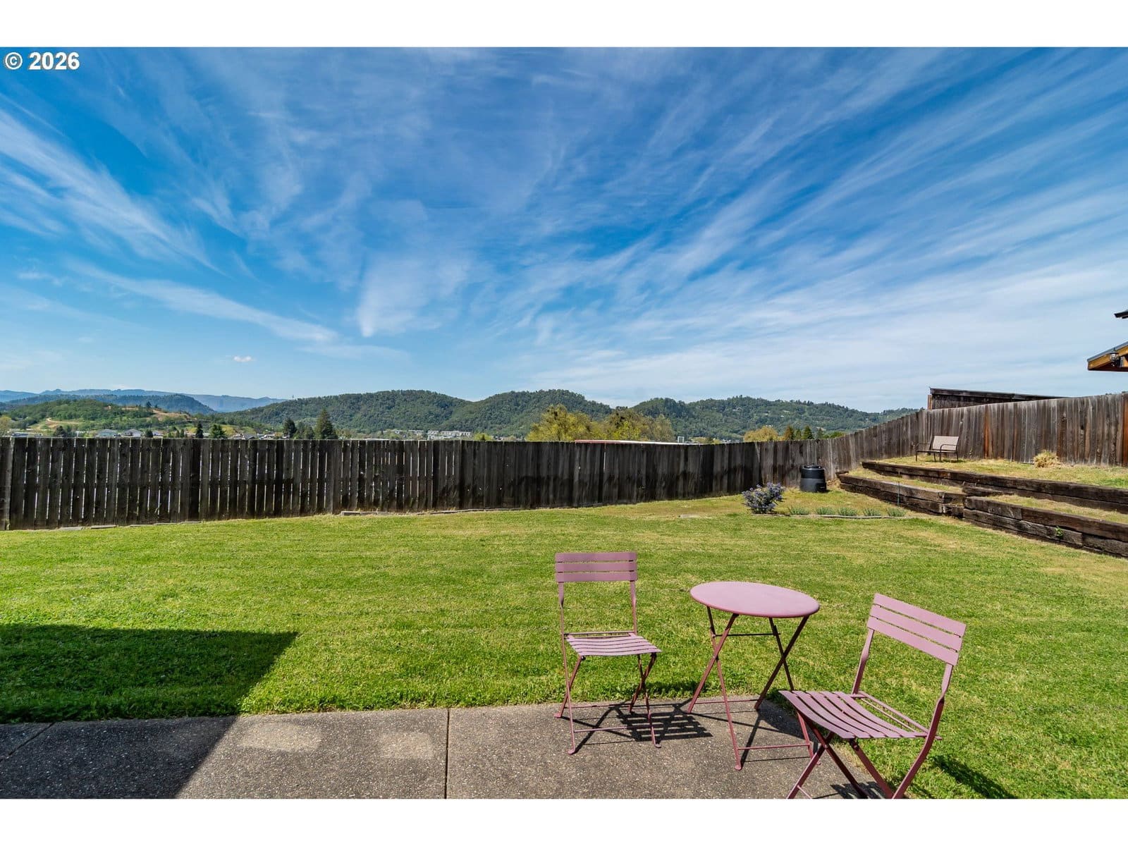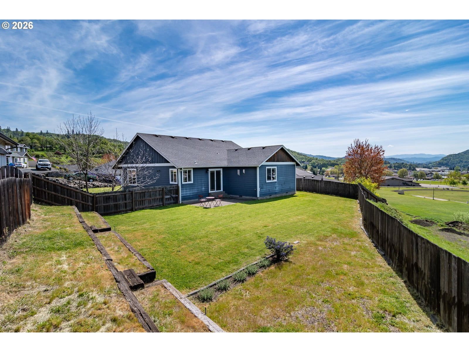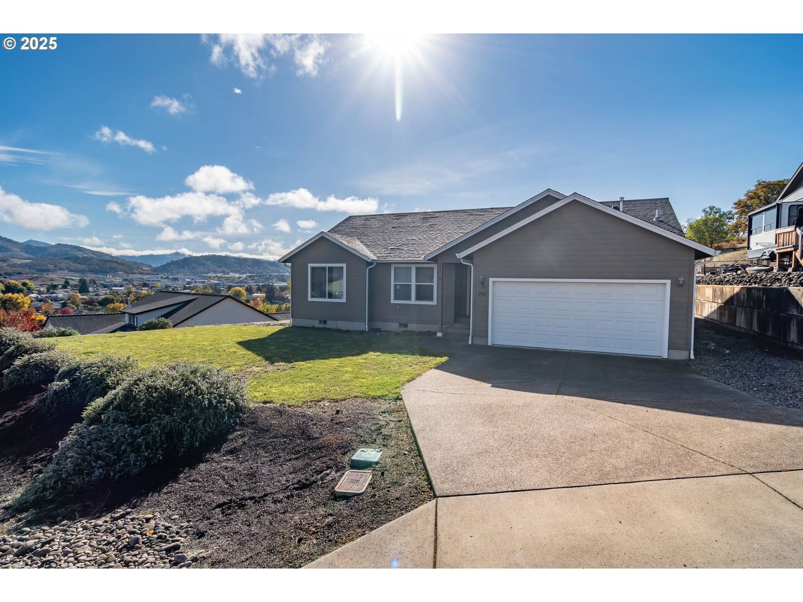 Welcome to this unique view home in the highly sought-after Sunset View neighborhood, featuring spectacular 360-degree views of the city and natural landscape. The efficient floor plan offers 3 bedrooms including owner’s suite, 2 baths, a 2-car garage, and a wonderful open concept living area. Stunning ebony floors, vaulted ceilings and warm neutral walls create a memorable first impression upon entry, and the covered front porch, rear patio, and giant level fenced yard provide opportunities for indoor-outdoor living near all of Roseburg’s amenities and shopping. A newer neighborhood with sidewalks and safe nearby walking routes, friendly neighbors and the best views in town wrap everything up in a hard-to-find package. Complete interior remodel in 2024 included an updated minimalist kitchen and bathroom design with quartz counters, Kohler sinks, all new appliances and chic black hardware, lighting, and giant medicine cabinets for storage. Other 2024 upgrades include interior paint, gorgeous LVP flooring in the bedrooms, blackout up-down/down-up cellular blinds and curtains, front entry and security doors, and a brand new $13K HVAC system with smart thermostat. All appliances, including the new washer-dryer, stay with the house. Site is notable for auspicious feng-shui bringing good vibes to the property. This location is midway down a south-facing slope on a U-shaped meandering street, all underground utilities to enhance the amazing views, and an indirect pathway to the front door buffered by evergreen vegetation. Current owner planted flowering perennials out back and 100 beautiful all-white daffodils in the front planter bed just last Fall! Step outside to the back yard and see the Spanish tile rooftop of the Classical Revival US Veteran’s Hospital, the Callahan Mountains, I-5, Winston, city lights at night, over-the-top sunrises and sunsets, airport landings and take-offs, and one of the best spots in the whole county to enjoy fireworks!! Welcome!!
