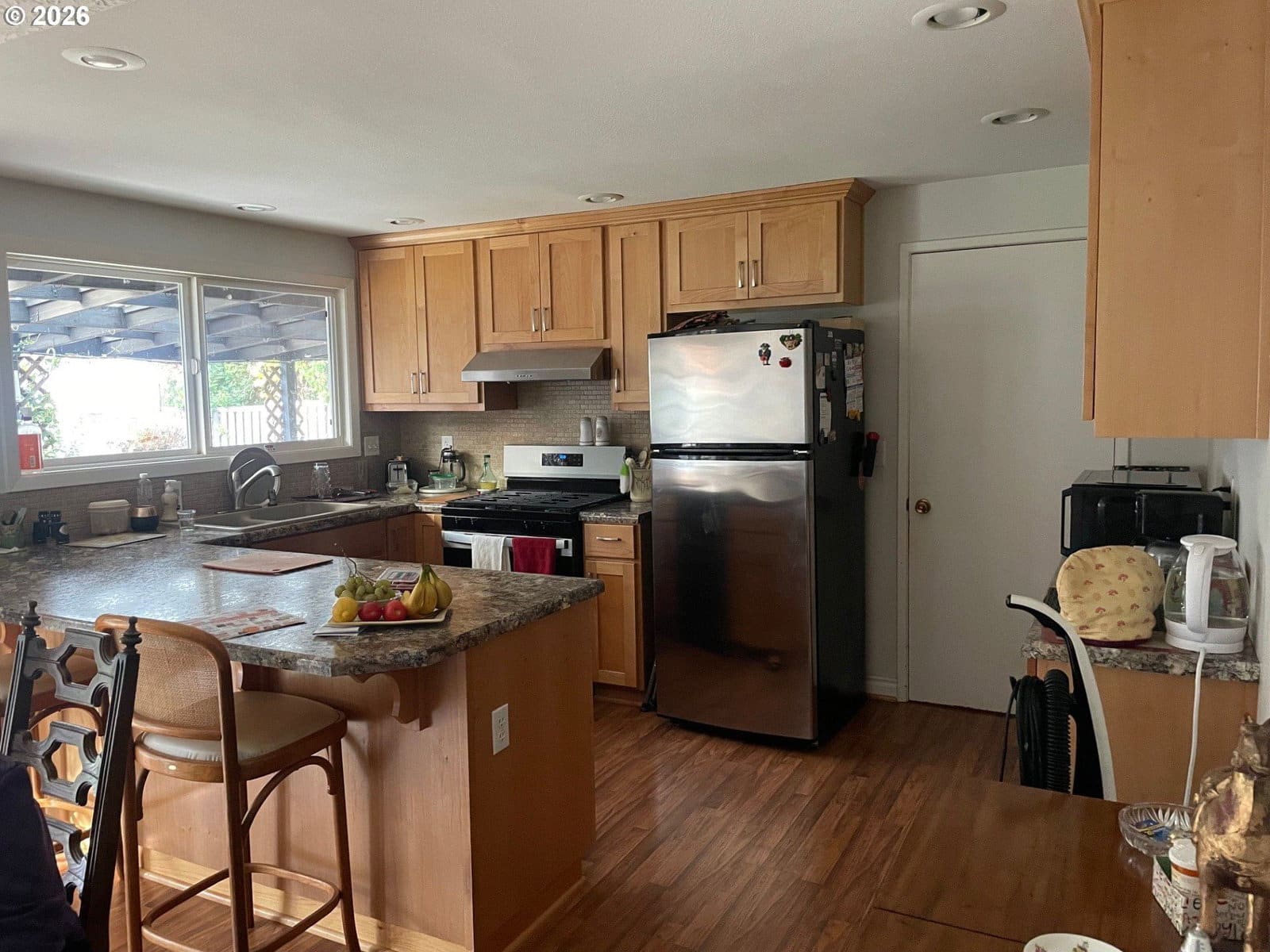 Nice floor plan. Not recently, but updated kitchen with eating bar. Dining room leading to sliding glass doors to large covered patio. Nice size living room with gas insert. Newer roof.
