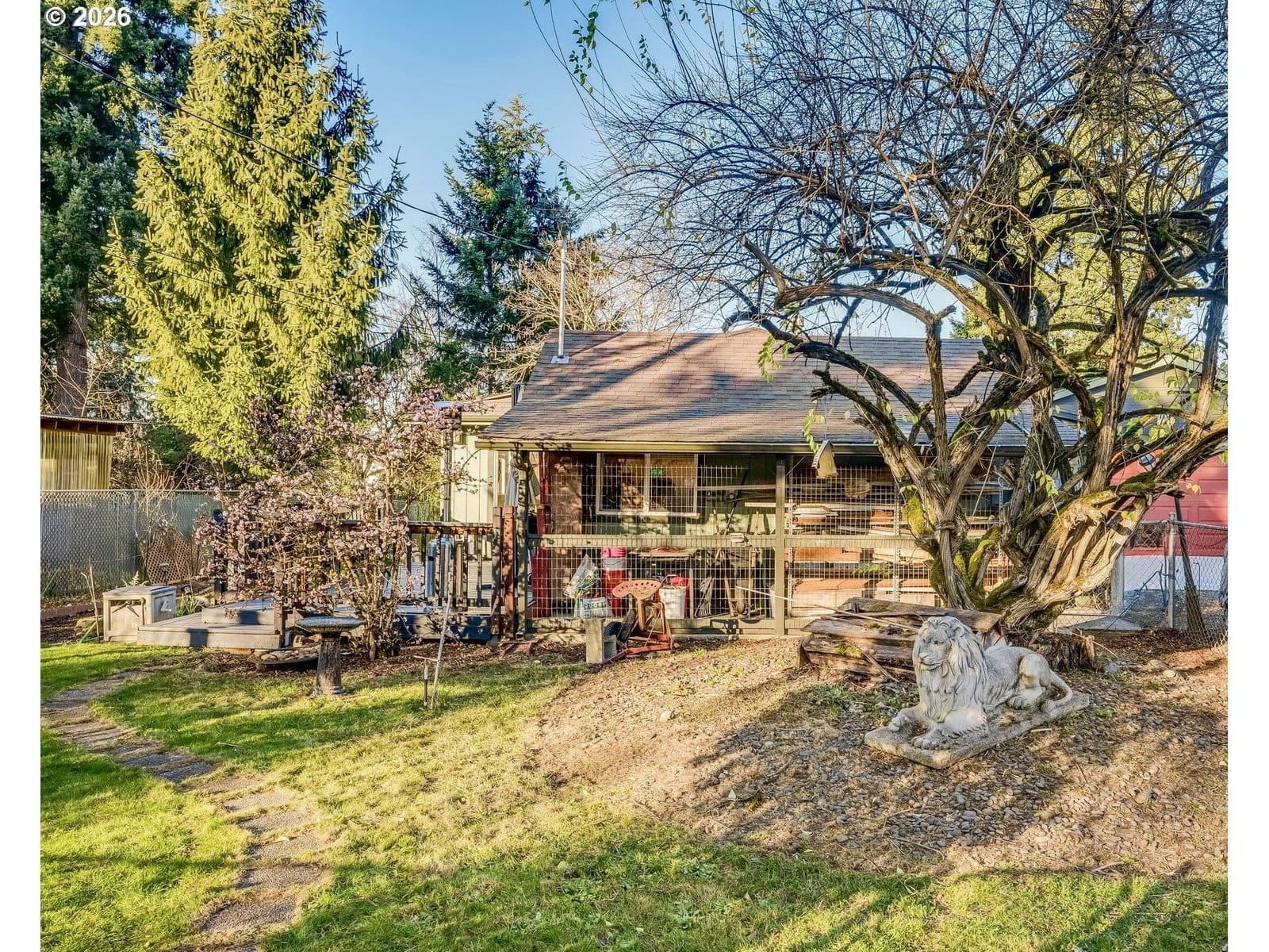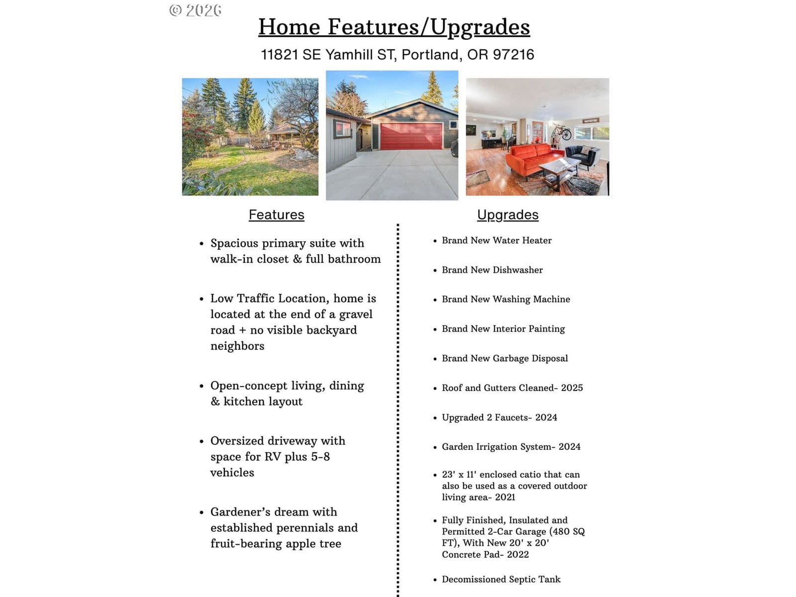 A truly rare opportunity to own a private end-of-road home with features rarely found at this price point. Set in a peaceful, low-traffic location with no direct neighbors behind, this property offers an open, quiet setting that is increasingly hard to find. Exceptional parking includes dedicated RV space and room for 6-9 vehicles, along with a fully finished and insulated two-car garage.The outdoor setting is a standout, offering a true gardener’s dream with established perennials, a fruit-bearing apple tree, an updated irrigation system, and a 23’ x 11’ enclosed catio that provides covered outdoor living year-round.Recent updates include a brand new water heater, dishwasher, washing machine, interior paint, and garbage disposal. Additional improvements include roof and gutters cleaned in 2025, upgraded faucets, and a decommissioned septic tank.Inside, the 2-bedroom, 2-bath, 1,142-sq-ft home features an open concept living, dining, and kitchen layout ideal for everyday living. The spacious primary suite includes a walk-in closet and full bathroom, while a functional mudroom provides convenient entry with washer and dryer. Buyer to confirm on 3-buildable tax lots. This home truly has it all! [Home Energy Score = 4. HES Report at https://rpt.greenbuildingregistry.com/hes/OR10243303]