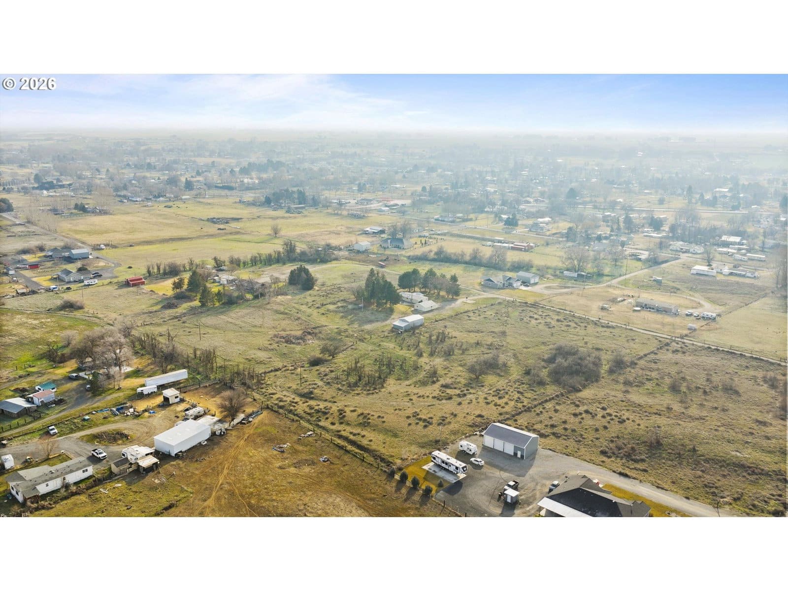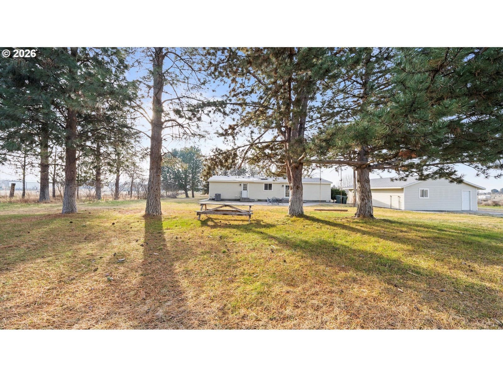 Country living at its finest, with subdividing potential, and only 10 minutes to town! This 4-bed, 2-bath home features an open layout that connects the living, dining, and kitchen areas at the center, with bedrooms on each side for comfort and privacy. The fourth bedroom, with double glass doors, could also make a great office space. There is a 220-foot well with a water softener and a new UV filter. Enjoy the outdoors in your own park-like setting with mature deciduous and pine trees and UGS. The large covered front porch connects to paved pathways that wrap around to a spacious back patio, perfect for BBQs and entertaining. The property also includes a rec room converted from a 2.5-car, 780-sqft garage. These two rooms offer endless possibilities such as movie nights, a game room, homeschooling space, a workspace, or simply additional living areas. In addition, there is a 24×32 pole-barn-style shop with three garage doors, a side porch, and storage above. Cross-fenced areas are perfect for a hobby farm, gardening, dogs, goats, or chickens. Rarely do properties offering acreage, shop space, and development potential come available in Hermiston!