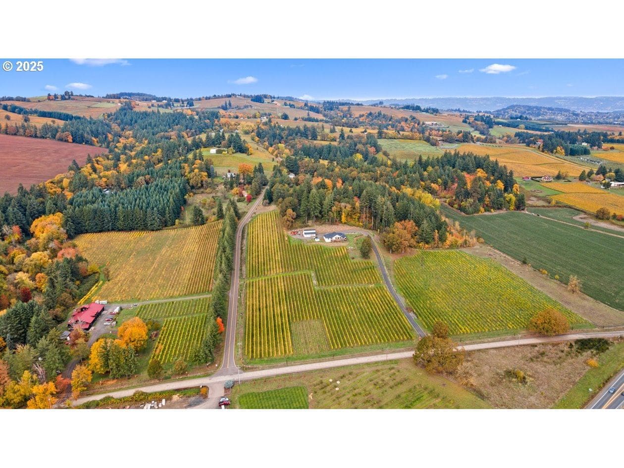 Looking for a private, unique, nature-rich setting, surrounded by rolling hills and vineyards, in the very heart of wine country? Inhale the scent of stately trees while strolling this sylvan, park-like estate. Offering a rare chance to acquire a coveted address, this property is located in the famous Dundee Hills AVA, south of Dundee, minutes to McMinnville, Carlton & Newberg. Enjoy quick access to Hwy99w & Hwy18, easily connecting to Portland, Salem & the Oregon Coast. >>Lots of infrastructure is already here: well & newer pressure tank, newer septic, six out-buildings (including an oversized, high-door 2-bay shop, a 5-bay machine shed with office and half bath, a critter barn & a chicken coop), fenced-in equipment yard, double power meter drops, plentiful paved parking & winding driveways, and a 3,100+ sf 'blank slate' residence, ready for your custom touches. Recent repairs include a 2020 Heat Pump/Air Handler, 2006 Electrical & mechanical repair, and 2011 Septic System major repair. >>This mid-century modern floorplan could really pop with a bold remodel. The solid structure might also make an exotic tasting room or bed & breakfast*, with large gathering spaces, two kitchens, two decks and an 'infinity view' patio area overlooking south facing valley & vineyard views. Alternative, private building sites are also available on this sprawling wooded acreage. *Please don't enter the property without an appointment. *Buyer to do all due diligence to support the intended use. Ask your broker to send you the details including maps, floorplan & developer's packet available with this listing. >>Finally, take a drive along Breyman Orchards Road and soak in the rolling countryside, passing along the way world-renown destinations including Remy Wines, Durant Vineyards & Olive Mill, White Rose Estate, De Ponte Cellars, Resonance Dundee Hills, Domain Drouhin & Domaine Serene. What a magical, wonderful location! 1.6-bay equipment shed incl. office w/ half bath, h2O pressure tank & commercial meter drop. 2. 2-bay high-ceiling shop w/large overhead doors. 3."Critter" barn for livestock, ponies, poultry. 4. Poultry coop & pen. 5. Well pump house & tool sheds.