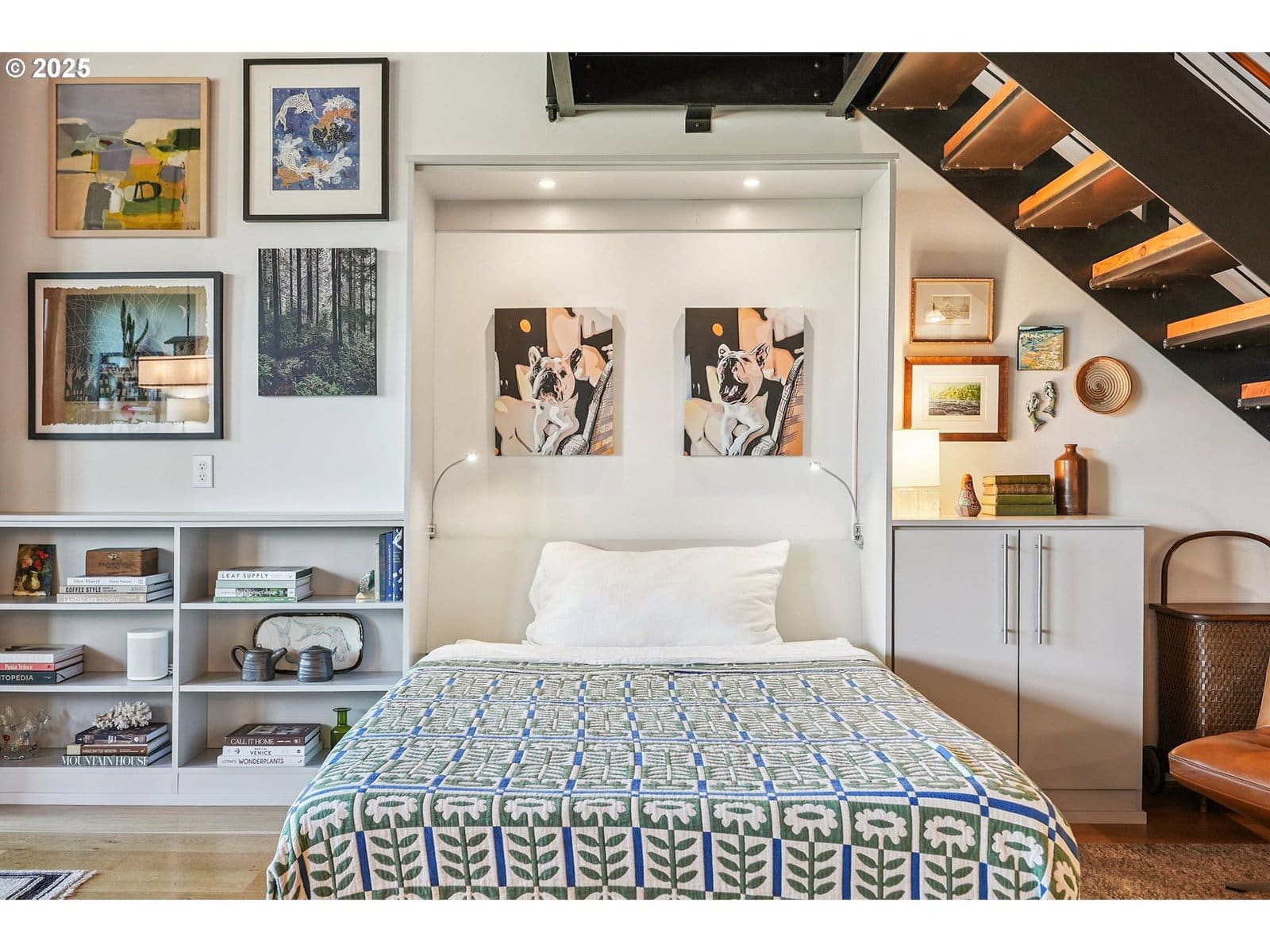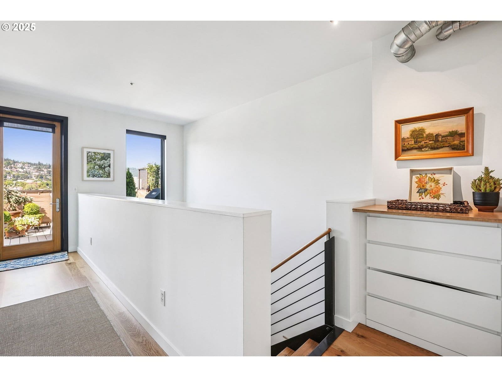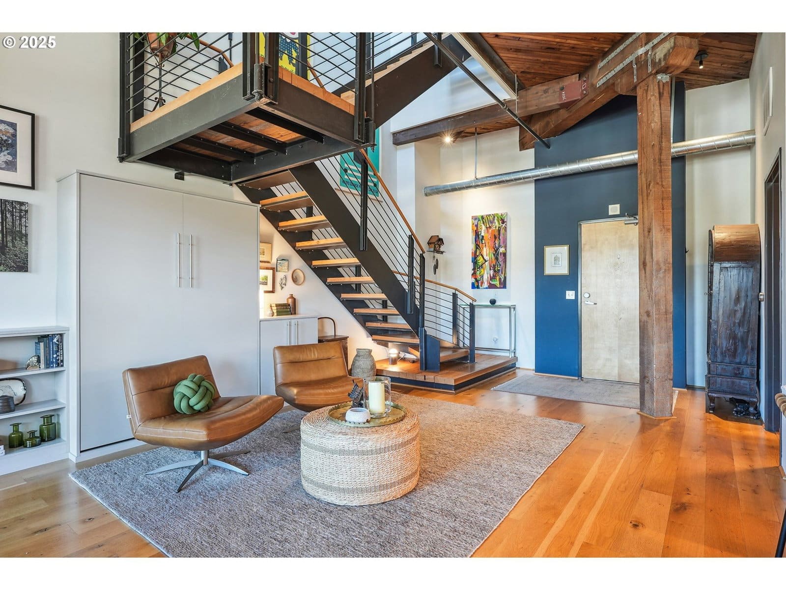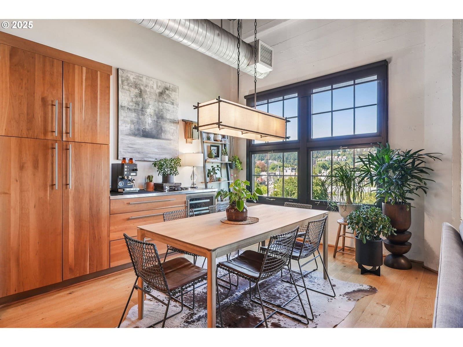 This authentic industrial loft penthouse features soaring ceilings, wood floors, and huge windows that flood the space with natural light. New separately zoned heating and air conditioning units for each level ensure year round comfort. The open-concept main floor is perfect for entertaining, featuring a beautifully updated kitchen with quartz countertops, a gas range with a vented hood, and a spacious kitchen island with seating. A cozy gas fireplace anchors the living area, while a third sleeping area with a custom wall bed and a full bathroom provides flexibility and convenience. Upstairs, the wood floors continue into the private quarters, which include two bedrooms, a large bathroom with a double vanity, a full laundry room, and a spacious walk-in closet. Enjoy expansive views of the neighborhood and West Hills, as well as stunning sunsets and the changing colors of the seasons from the large terrace, primary bedroom, and the main level. The building provides a beautifully landscaped courtyard and a handsome lobby with exposed old-growth beams. Tandem parking for 2 cars and a storage unit are included.