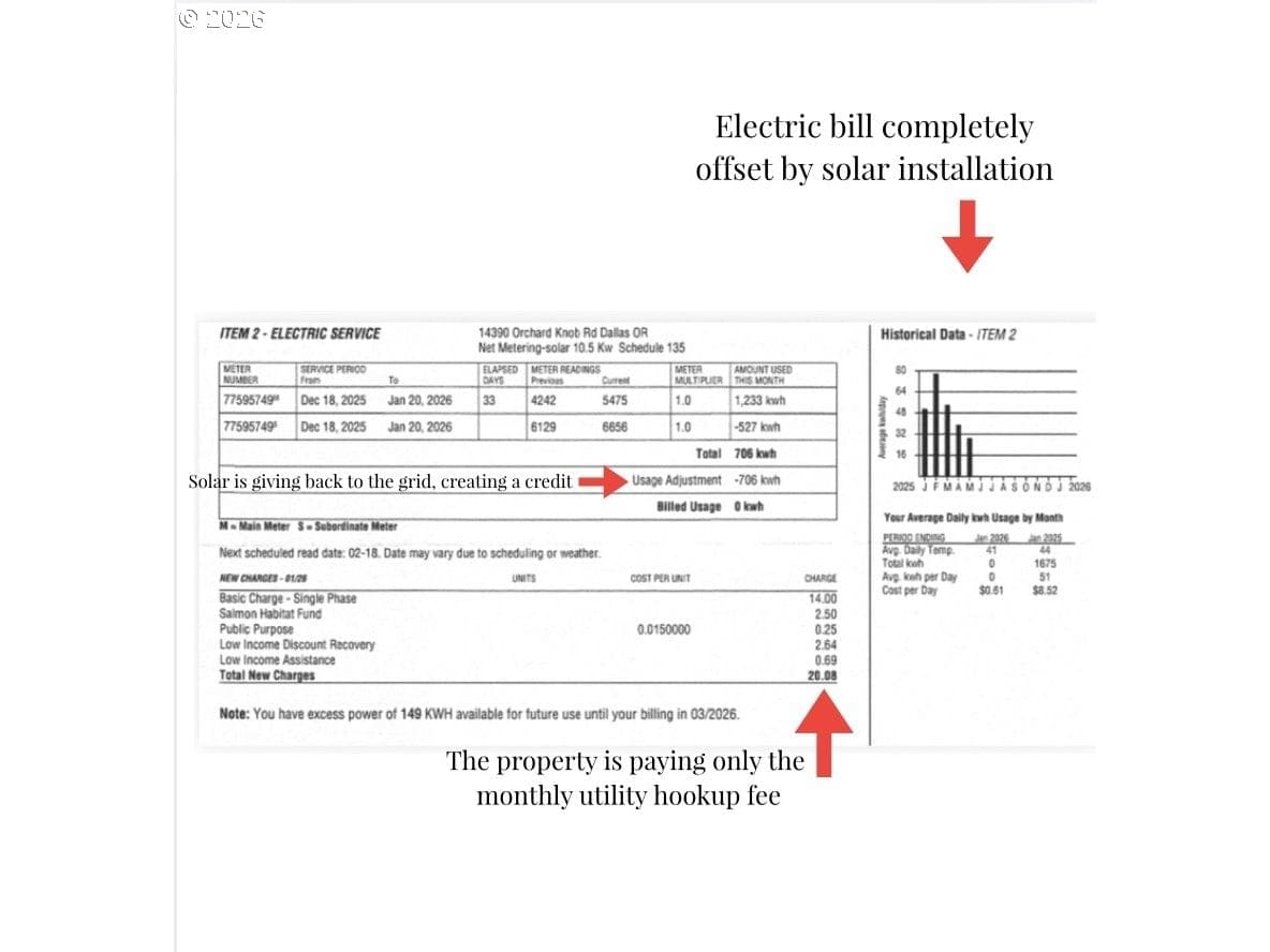 The best of all possible worlds--what does that look like? Consider this: a house facing south on a 5.08-acre parcel, with vast Contemporary-style windows looking out to an expansive meadow starry and fragrant with wildflowers, welcoming to deer, rabbits, and an astonishing variety of birds, from the bald eagle to the burrowing owl. From the wraparound deck, you can see the mountains; sunrise and sunset paint the sky. The house is a delightful blend of dramatic and homey, with a huge and stunning vaulted living room that leads to a cozy dining room and well-designed kitchen with a ton of storage. The main level has two sizeable bedrooms in addition to the wonderful primary suite, with its custom built-in shelves and attached bath. The lower level gives you studio or office space, a media room, another bedroom, and direct access to a patio shaded by the deck, a convenient hangout on sunny days. Speaking of sunny days, you'll be so grateful for the state of the art solar panels, installed on the metal roof of the shop. The system is fully owned and works so well that it gives back to the grid--if you're concerned about rising electricity costs, you'll be buying inflation-proof power. Along with the attached double garage, there is a separate drive-through shop, 1471 SF waiting for your projects...it has 15- and 20-amp circuits, and unlike most shops, it also has its own heat pump and is fully insulated, so you can work in complete comfort. All this, plus a magical location; it feels like the countryside, but it's so convenient to Dallas that you can still order DoorDash; and if you feel like cooking, you're in the heart of farm-to-table bounty. Benedetto Winery is down the road, and Eola Hills/Amity 20 min away. You're 3 minutes from the legendary Baskett Slough National Wildlife Refuge. You're less than an hour from the ocean and a little more than an hour to Portland or Eugene. Still looking for the best of all possible worlds? It's right here.
