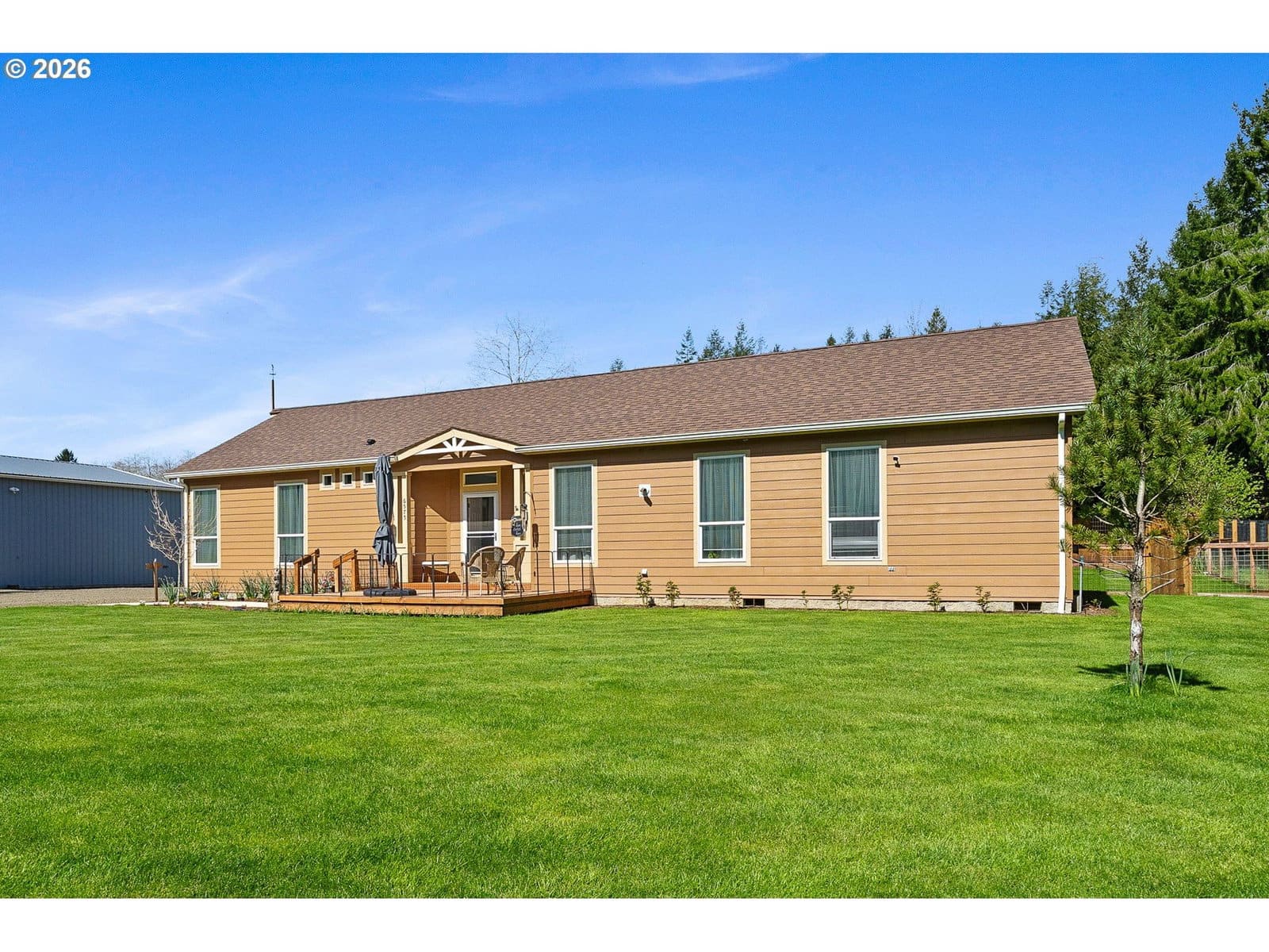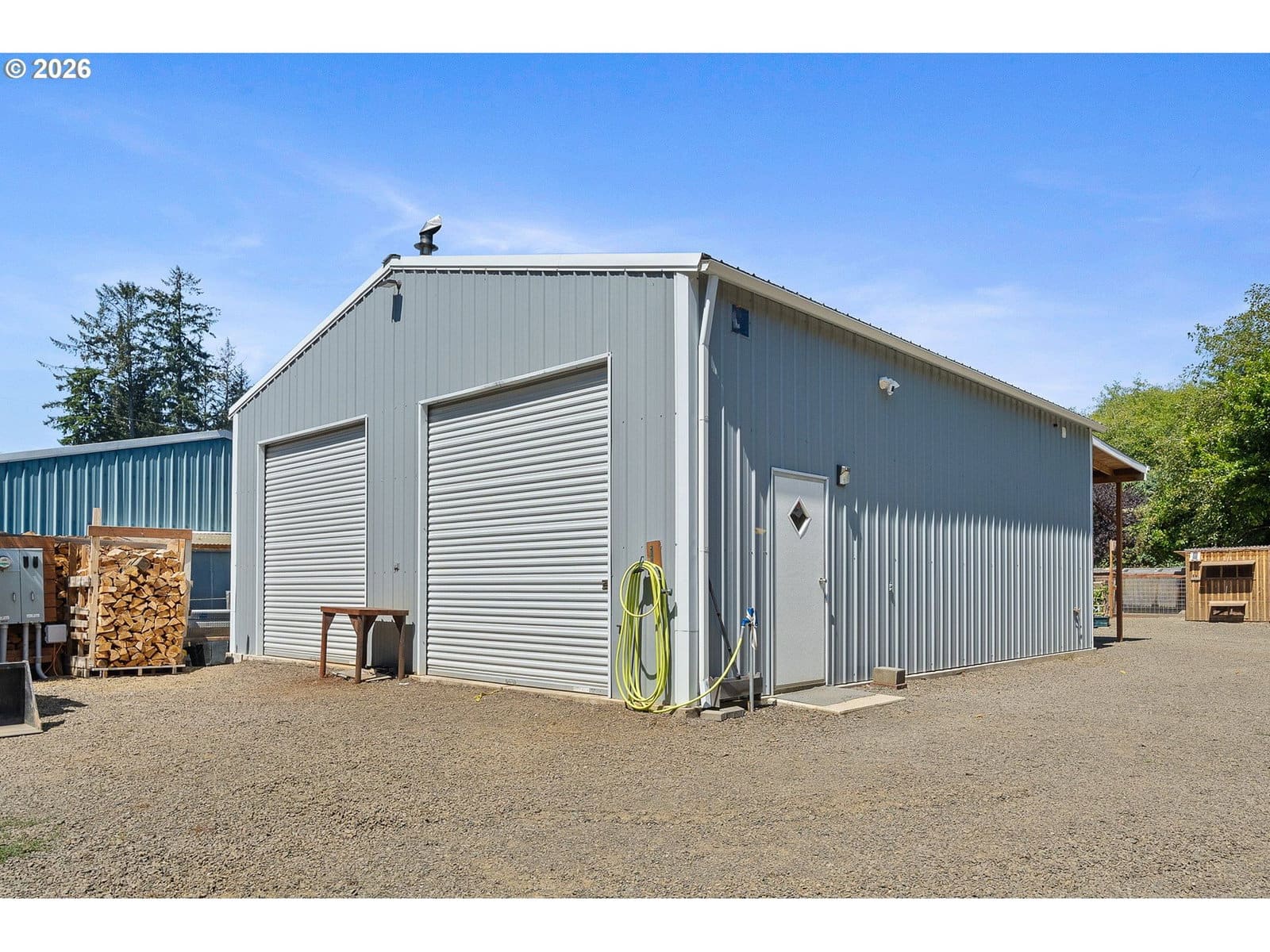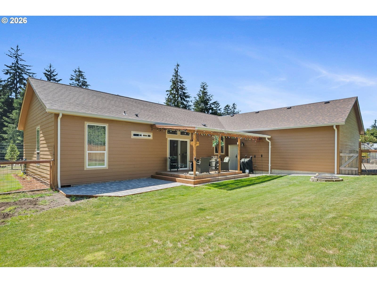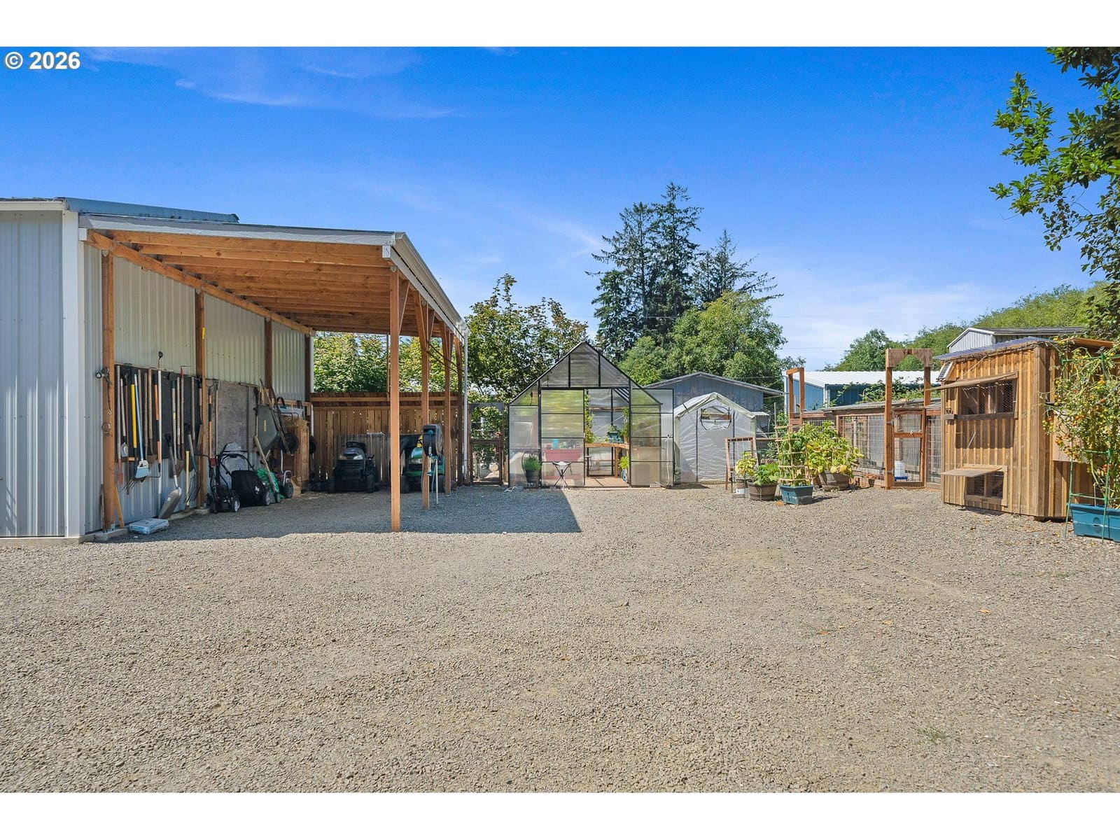 Welcome to this beautifully maintained 2021 home, where modern comfort meets thoughtful design. 9-foot ceilings with crown molding blend seamlessly with the home's neutral color palette, creating a light and airy atmosphere throughout the main living spaces. The layout flows effortlessly from the living room into the kitchen and dining area, offering a comfortable and functional space for both everyday living and entertaining. The kitchen features stainless steel appliances, a large island with breakfast bar seating, and ample cabinetry; all positioned to keep you connected to the heart of the home. Just off the dining area, a sliding glass door leads to a covered outdoor sitting area and a fully fenced backyard—perfect for relaxing or hosting year-round. The primary suite is spacious and private, complete with a large ensuite bathroom featuring double sinks, a walk-in shower, a separate soaking tub, and generous storage. An oversized walk-in closet adds even more functionality to the space. Outside, the property is well-equipped for hobbies, projects, or small-scale homesteading. Highlights include hot and cold water at the exterior spigot, a 30x35 shop with two bays and a wood stove, a covered carport, a 10x12 greenhouse, and a chicken coop with an enclosed run. The level lot provides usable space with a sense of privacy, surrounded by a peaceful, forested backdrop.