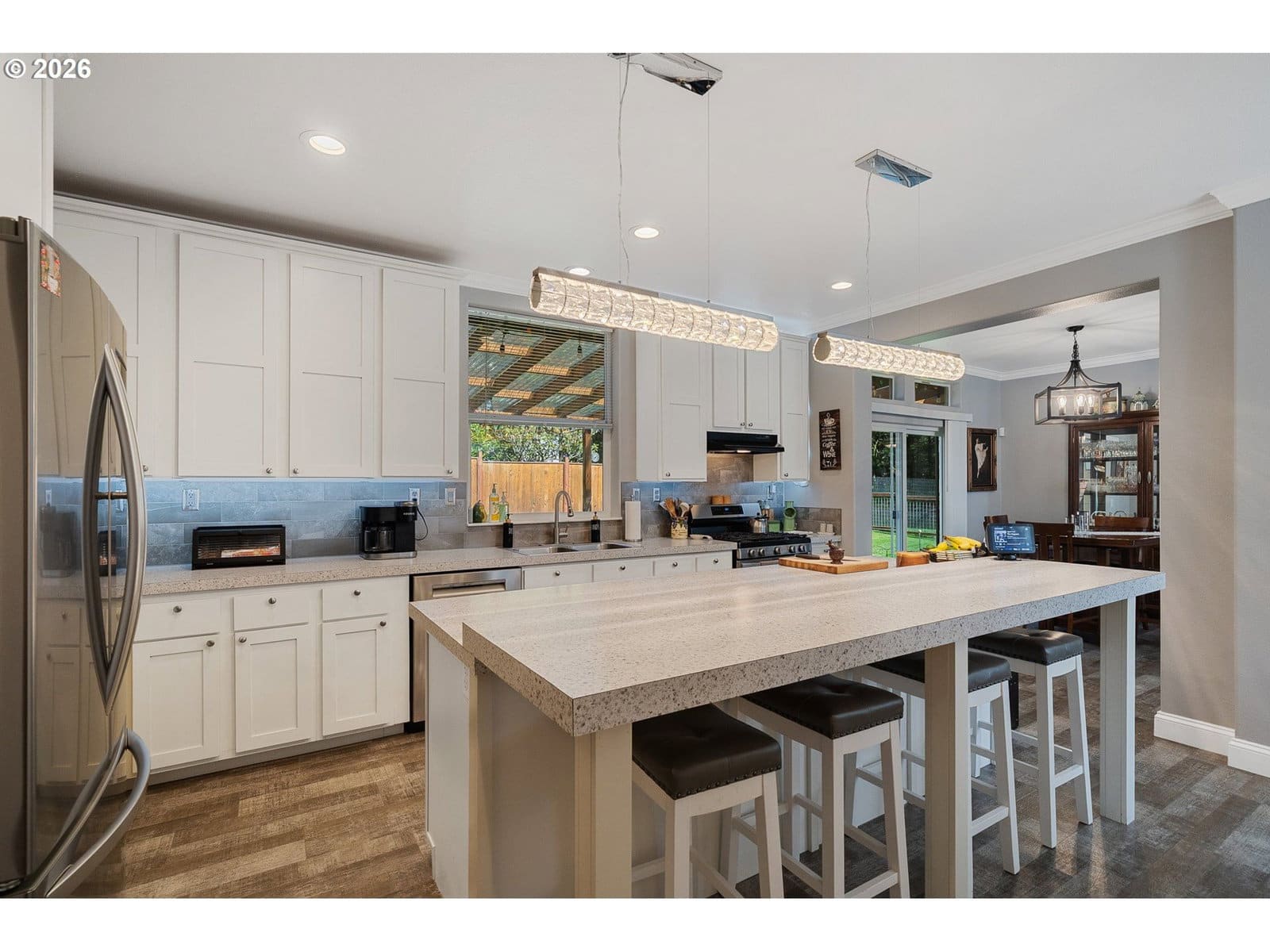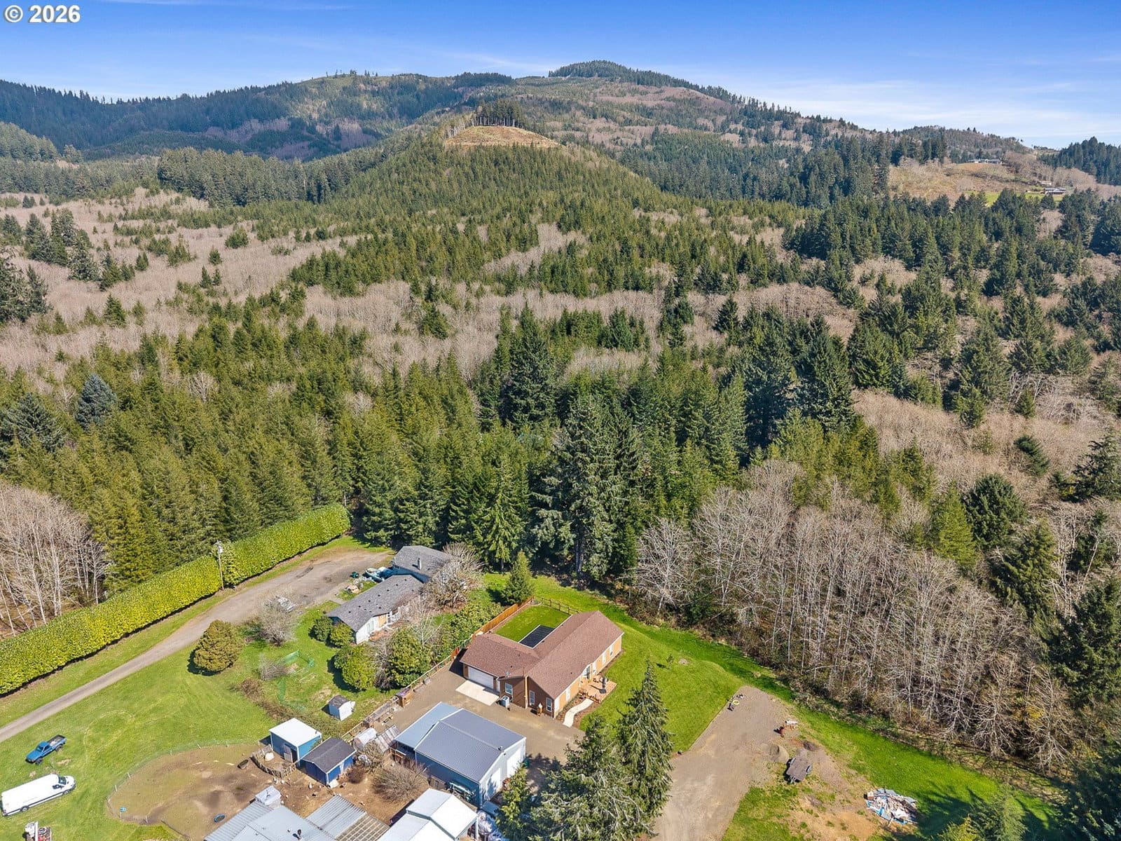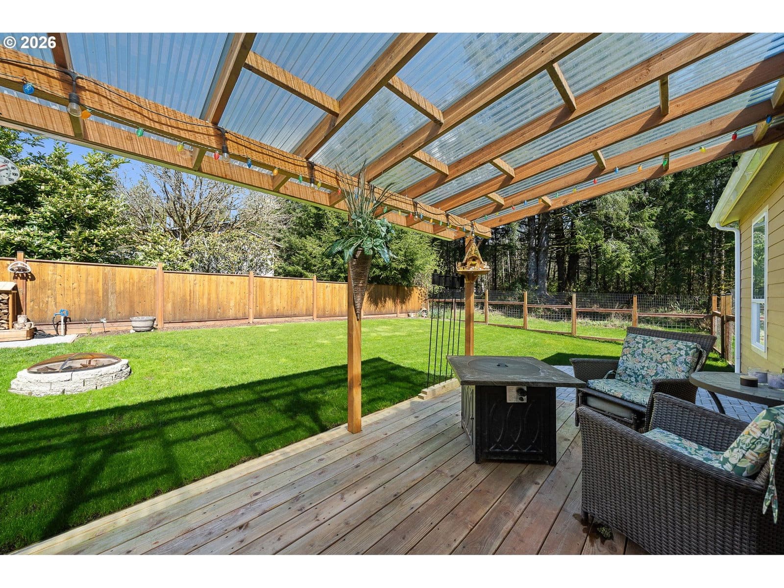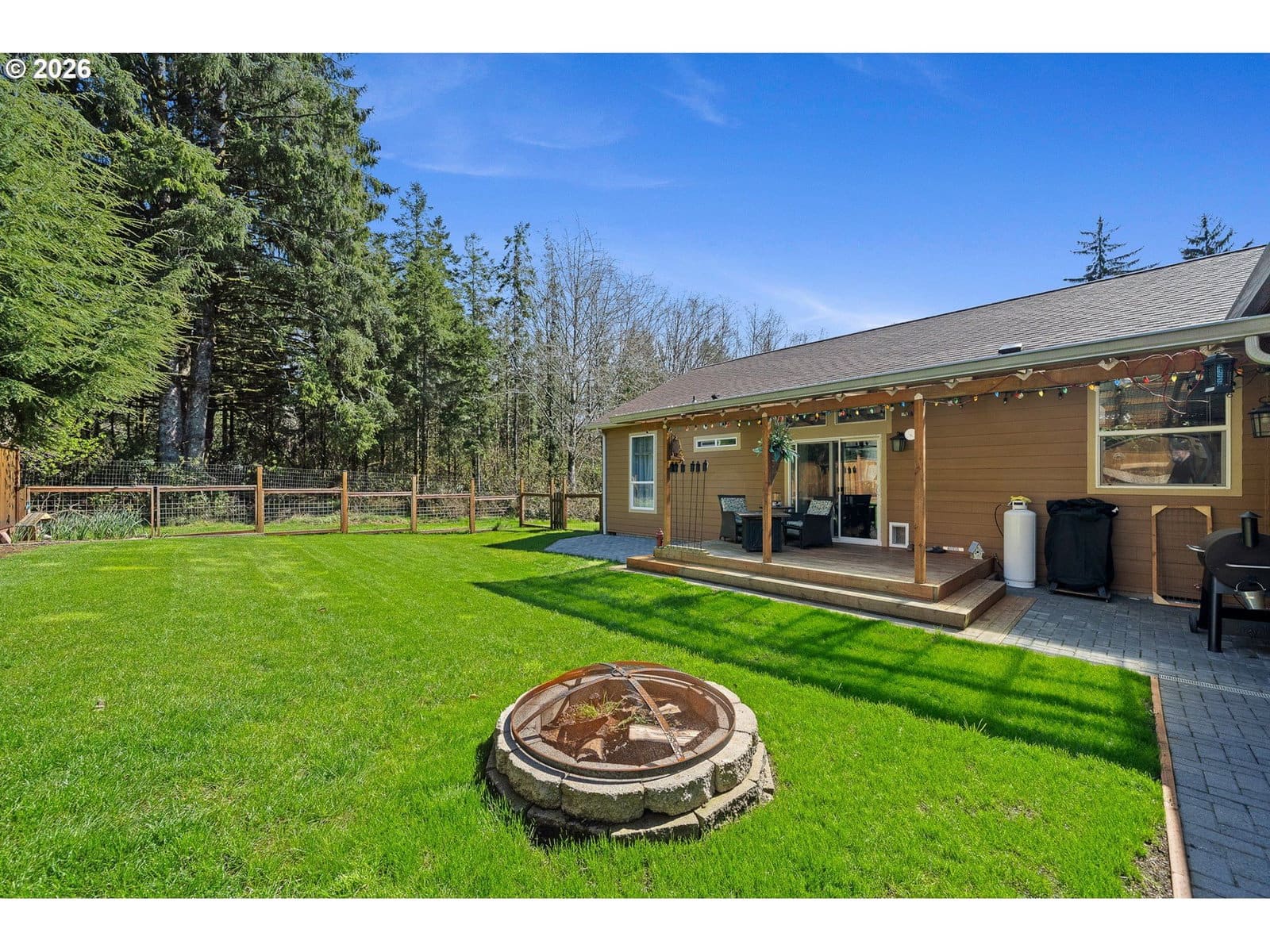 Welcome to this beautifully maintained 2021 home, where modern comfort meets thoughtful design. 9-foot ceilings with crown molding blend seamlessly with the home's neutral color palette, creating a light and airy atmosphere throughout the main living spaces. The layout flows effortlessly from the living room into the kitchen and dining area, offering a comfortable and functional space for both everyday living and entertaining. The kitchen features stainless steel appliances, a large island with breakfast bar seating, and ample cabinetry; all positioned to keep you connected to the heart of the home. Just off the dining area, a sliding glass door leads to a covered outdoor sitting area and a fully fenced backyard—perfect for relaxing or hosting year-round. The primary suite is spacious and private, complete with a large ensuite bathroom featuring double sinks, a walk-in shower, a separate soaking tub, and generous storage. An oversized walk-in closet adds even more functionality to the space. Outside, the property is well-equipped for hobbies, projects, or small-scale homesteading. Highlights include hot and cold water at the exterior spigot, a 30x35 shop with two bays and a wood stove, a covered carport, a 10x12 greenhouse, and a chicken coop with an enclosed run. The level lot provides usable space with a sense of privacy, surrounded by a peaceful, forested backdrop.