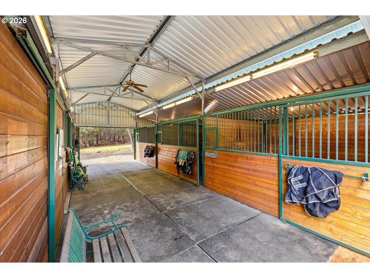 Exceptional 10-acre estate in a quiet, upscale area on a paved private road. The fully fenced, level property features irrigated lawn supported by a 20 GPM well and 40-sprinkler system. A 12-year-old Castlebrook barn includes four matted stalls, lighted tack and feed rooms, paddock, electric-fenced turnout, and a 60×100 arena. The 3-bedroom, 3-bath home with 2-car garage offers vaulted ceilings, exposed wood beams, a Clayton wood stove, and a covered deck with built-in Green Egg. A detached 25×50 shop/garage with oversized doors provides additional storage and workspace. Additional features include a Lennox dual-fuel HVAC system with warranty, Mitsubishi whole-house generator, built-in water softener, updated well piping with a 5-year-old Jacuzzi pump, and a Hot Springs spa with new cover.