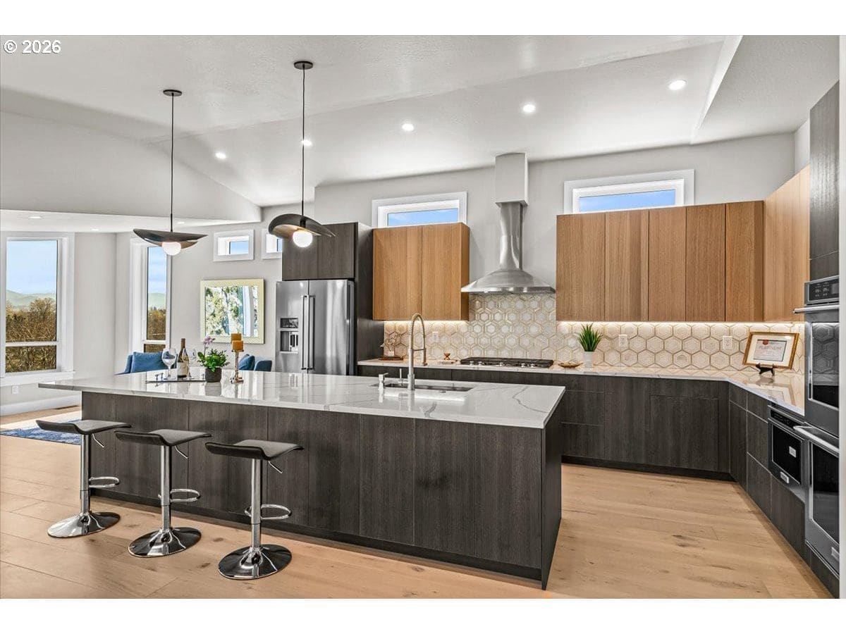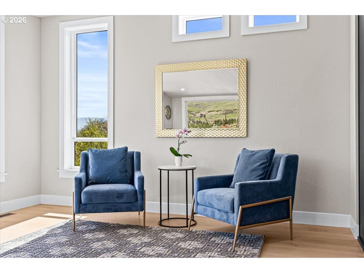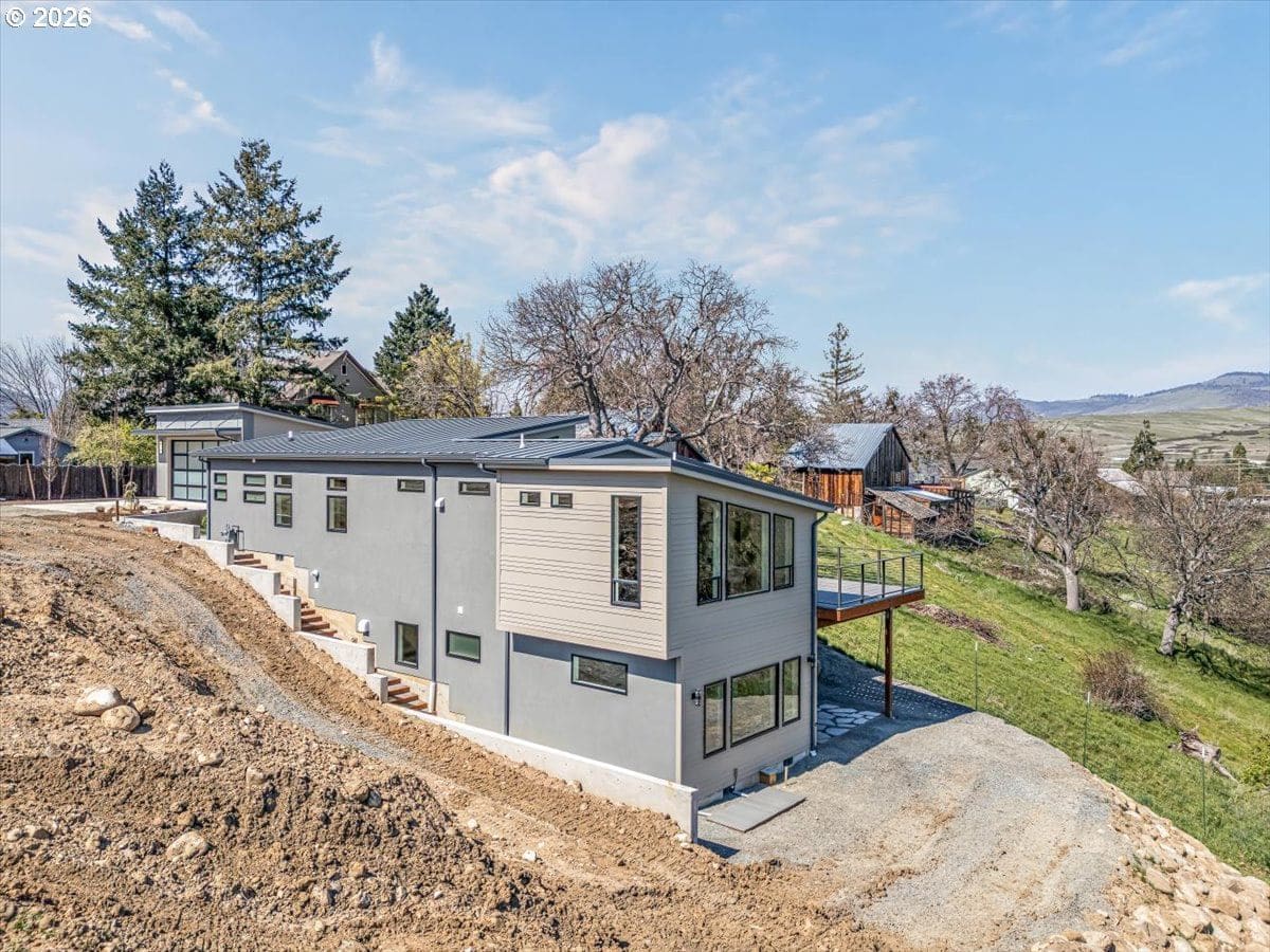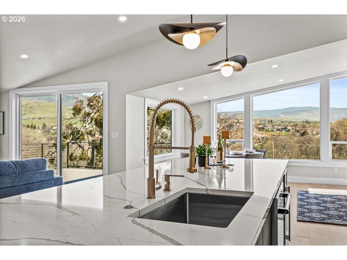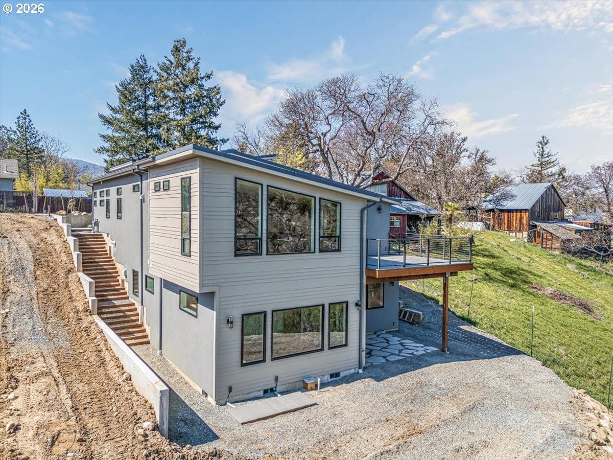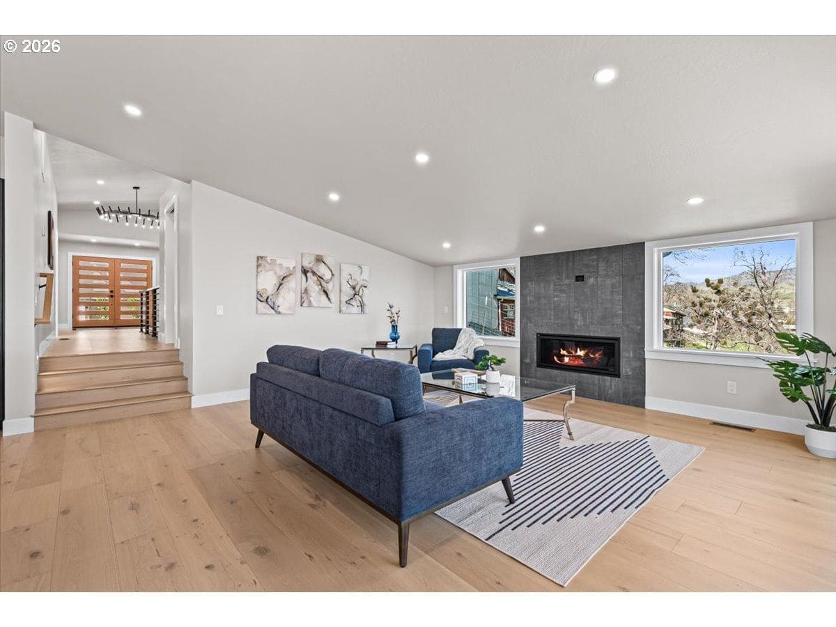 Platinum Earth Advantage home just minutes from downtown, offering 2,750 sq ft of thoughtfully designed 4BR, 3BA + office living space with stunning views of Grizzly Peak and the Cascades. This light-filled residence features 12’ ceilings, expansive windows, quartz surfaces, designer lighting, and blonde wide-plank hardwood floors. The main level features two ensuite bedrooms, highlighted by a luxurious primary suite with radiant heated floors, dual shower system, and two walk-in closets. The chef’s kitchen boasts an 11-ft island, double ovens, gas cooktop, beverage fridge, and walk-in pantry. Enjoy seamless indoor-outdoor living with an 8’ slider to a spacious view deck. Lower level offers 2 bedrooms, office, second laundry, and potential for separate living. Professionally landscaped, private setting with detached 2-car garage, EV charging, and energy-efficient 2-zone HVAC system. Home designed by Vadim Agakhanov.