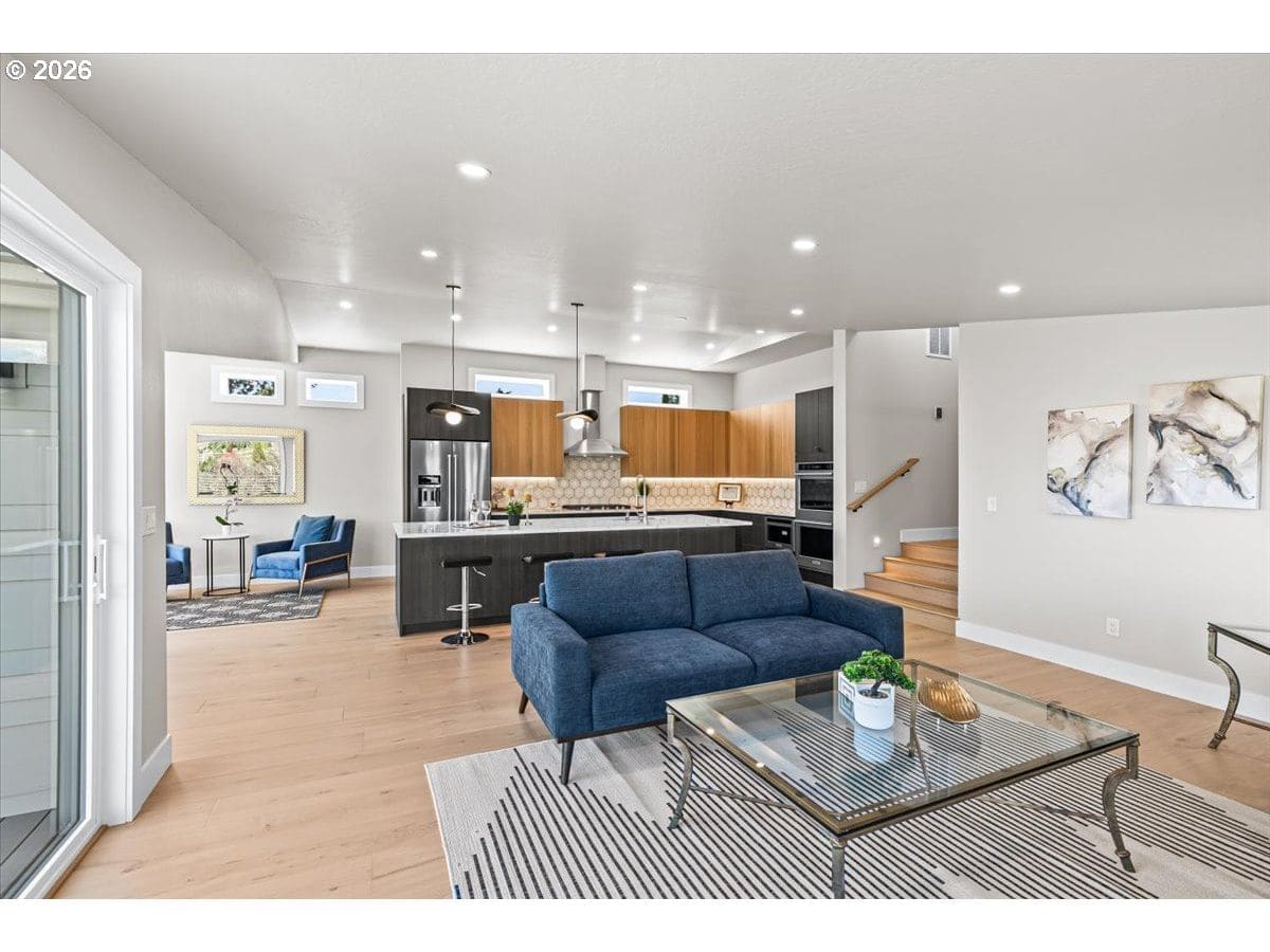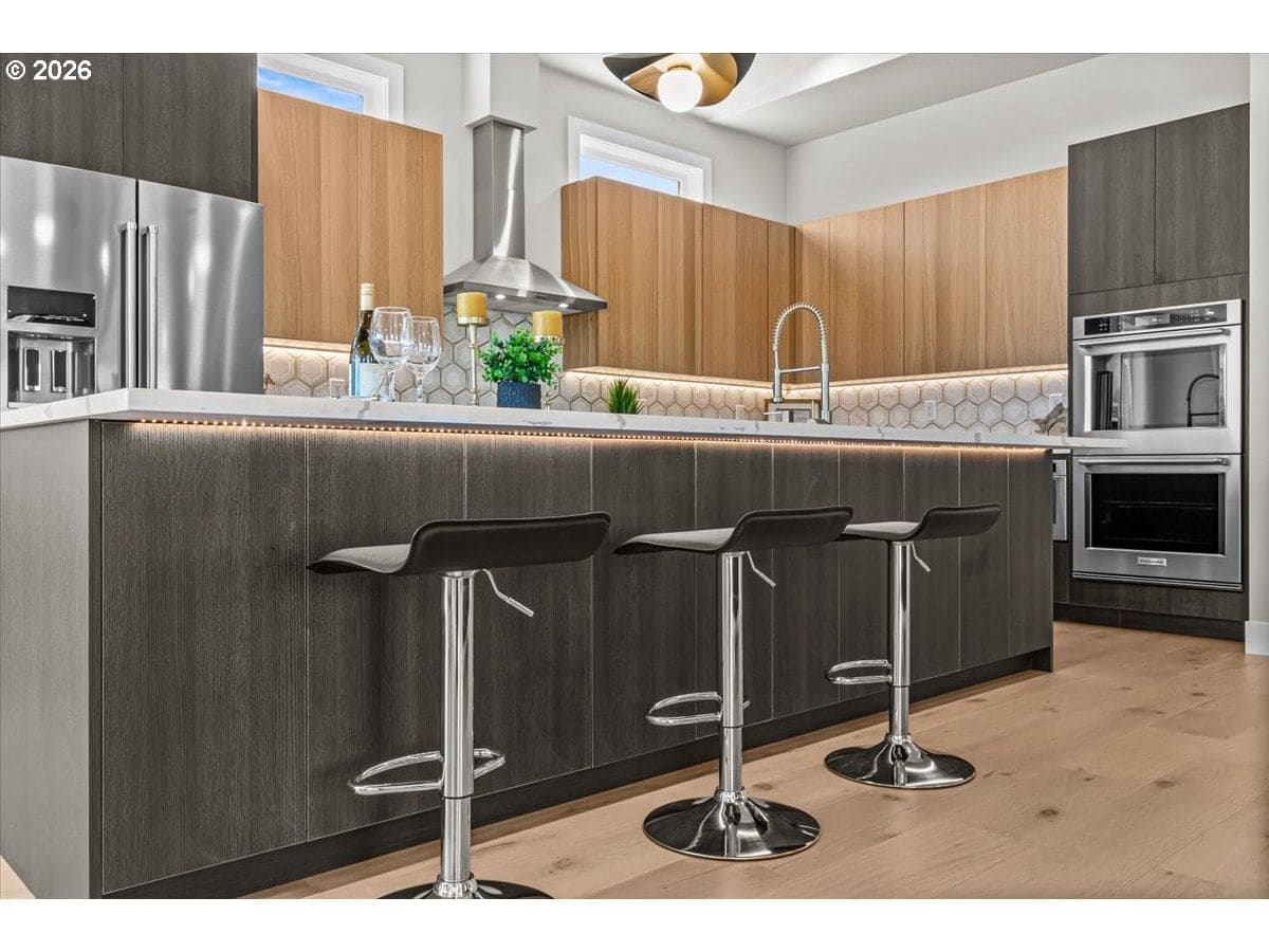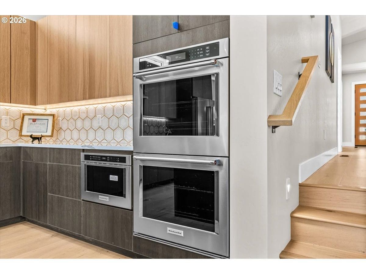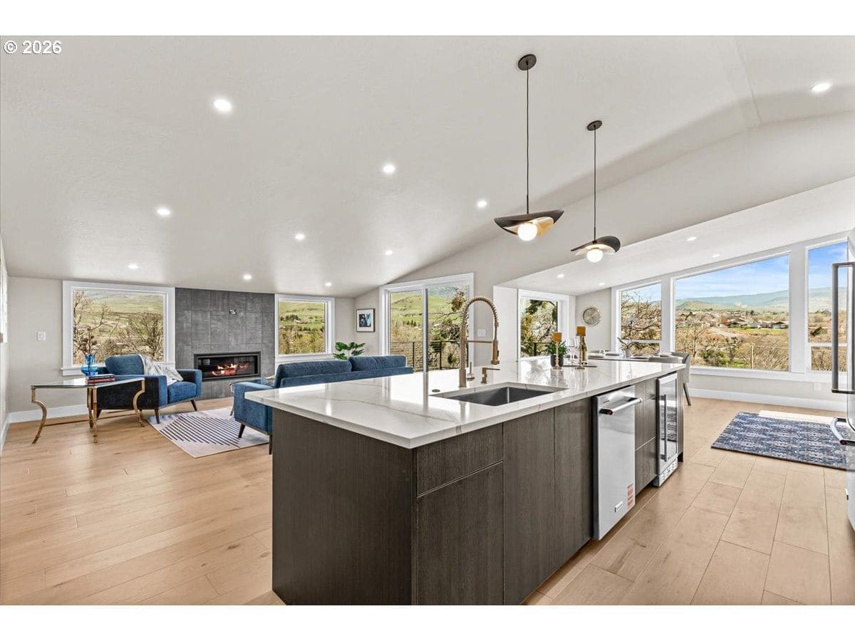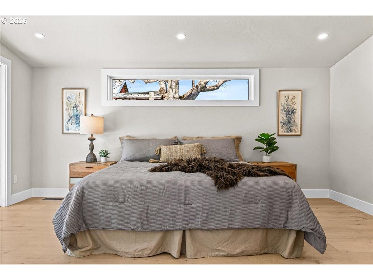 Platinum Earth Advantage home just minutes from downtown, offering 2,750 sq ft of thoughtfully designed 4BR, 3BA + office living space with stunning views of Grizzly Peak and the Cascades. This light-filled residence features 12’ ceilings, expansive windows, quartz surfaces, designer lighting, and blonde wide-plank hardwood floors. The main level features two ensuite bedrooms, highlighted by a luxurious primary suite with radiant heated floors, dual shower system, and two walk-in closets. The chef’s kitchen boasts an 11-ft island, double ovens, gas cooktop, beverage fridge, and walk-in pantry. Enjoy seamless indoor-outdoor living with an 8’ slider to a spacious view deck. Lower level offers 2 bedrooms, office, second laundry, and potential for separate living. Professionally landscaped, private setting with detached 2-car garage, EV charging, and energy-efficient 2-zone HVAC system. Home designed by Vadim Agakhanov.