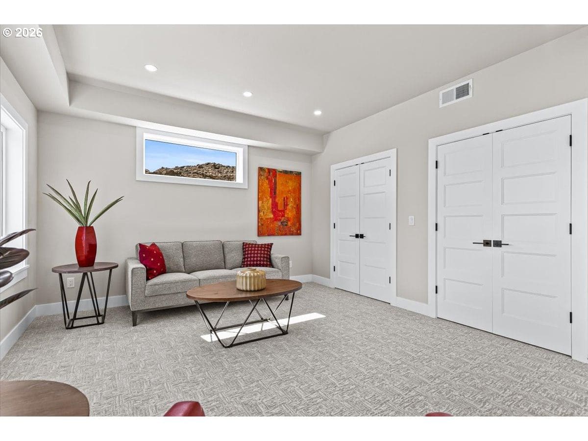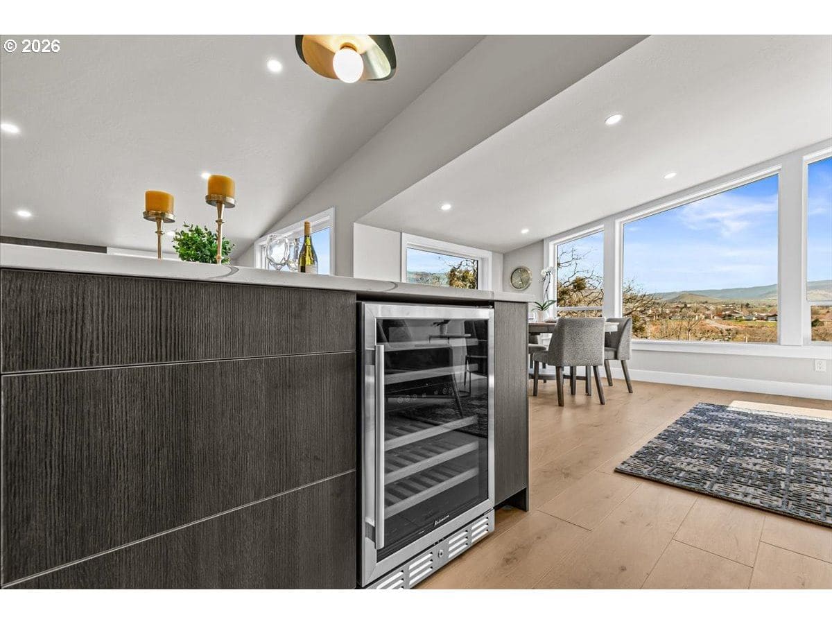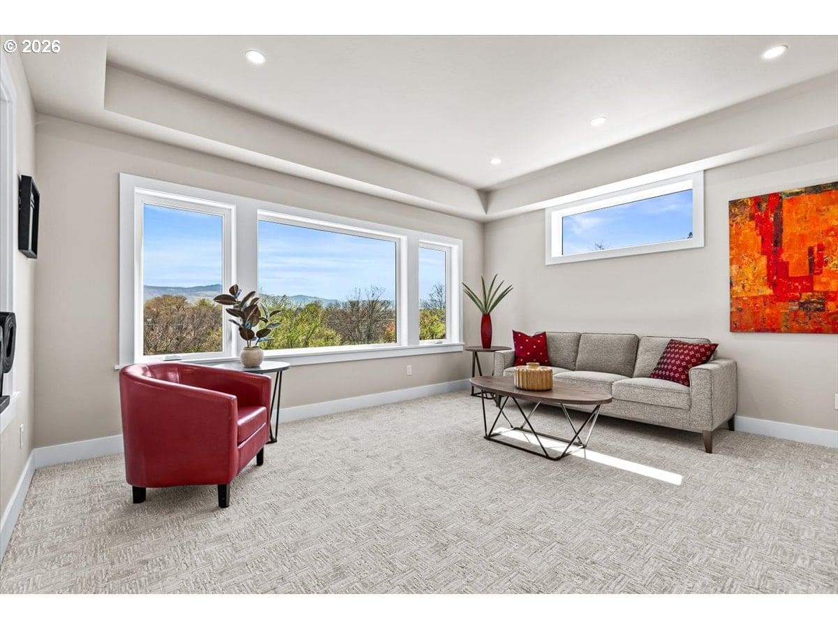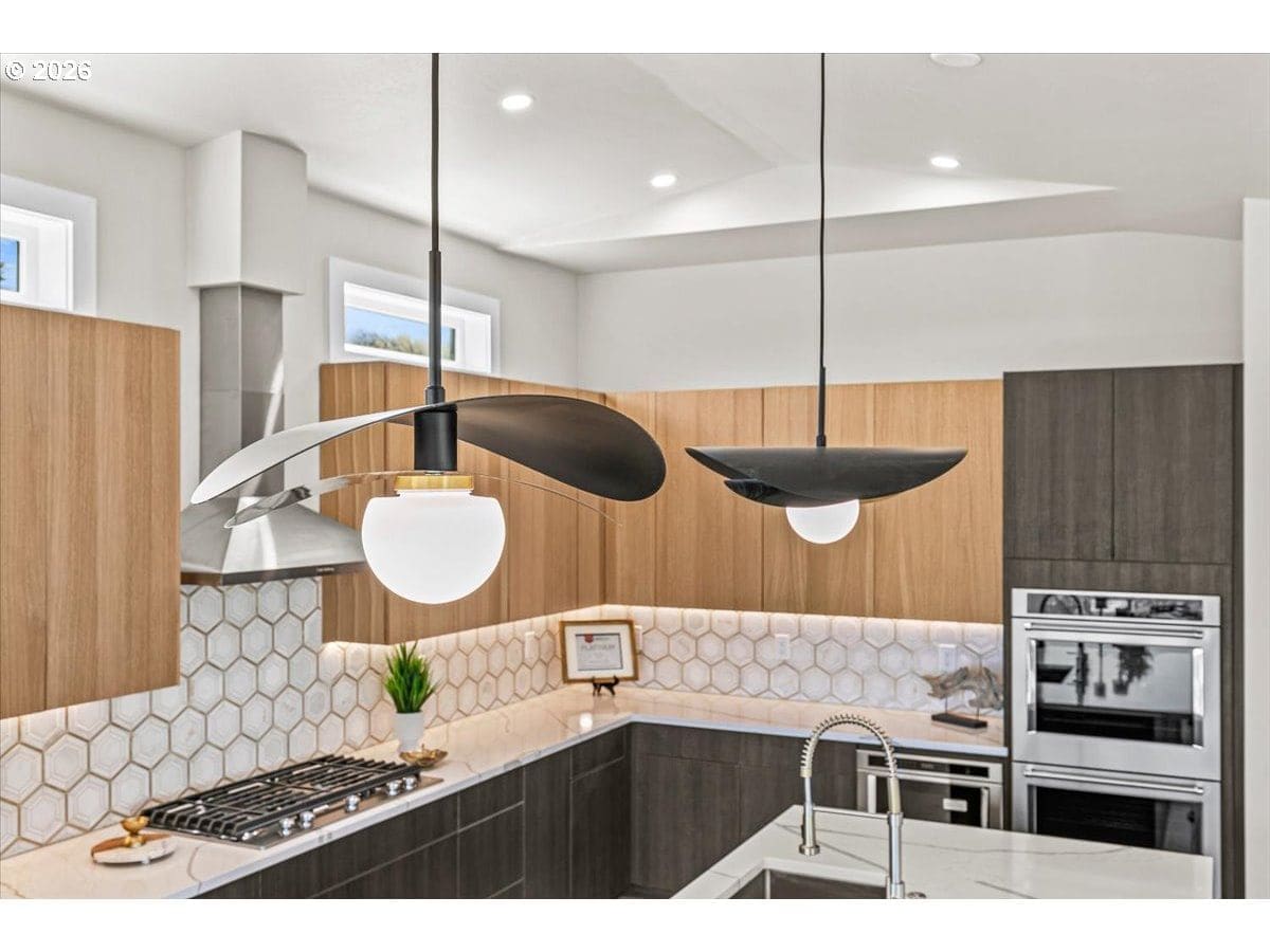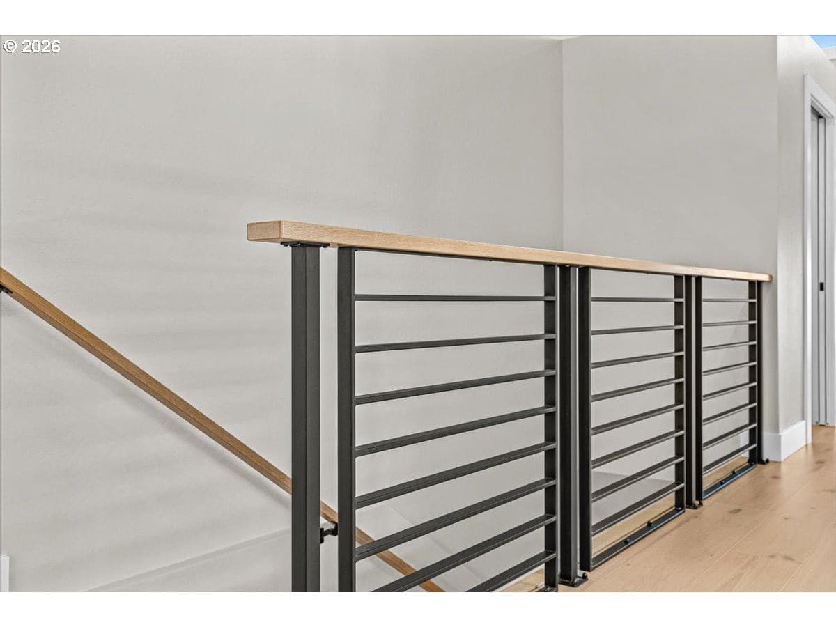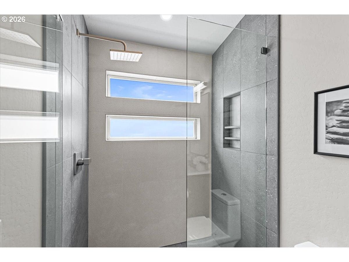 Platinum Earth Advantage home just minutes from downtown, offering 2,750 sq ft of thoughtfully designed 4BR, 3BA + office living space with stunning views of Grizzly Peak and the Cascades. This light-filled residence features 12’ ceilings, expansive windows, quartz surfaces, designer lighting, and blonde wide-plank hardwood floors. The main level features two ensuite bedrooms, highlighted by a luxurious primary suite with radiant heated floors, dual shower system, and two walk-in closets. The chef’s kitchen boasts an 11-ft island, double ovens, gas cooktop, beverage fridge, and walk-in pantry. Enjoy seamless indoor-outdoor living with an 8’ slider to a spacious view deck. Lower level offers 2 bedrooms, office, second laundry, and potential for separate living. Professionally landscaped, private setting with detached 2-car garage, EV charging, and energy-efficient 2-zone HVAC system. Home designed by Vadim Agakhanov.