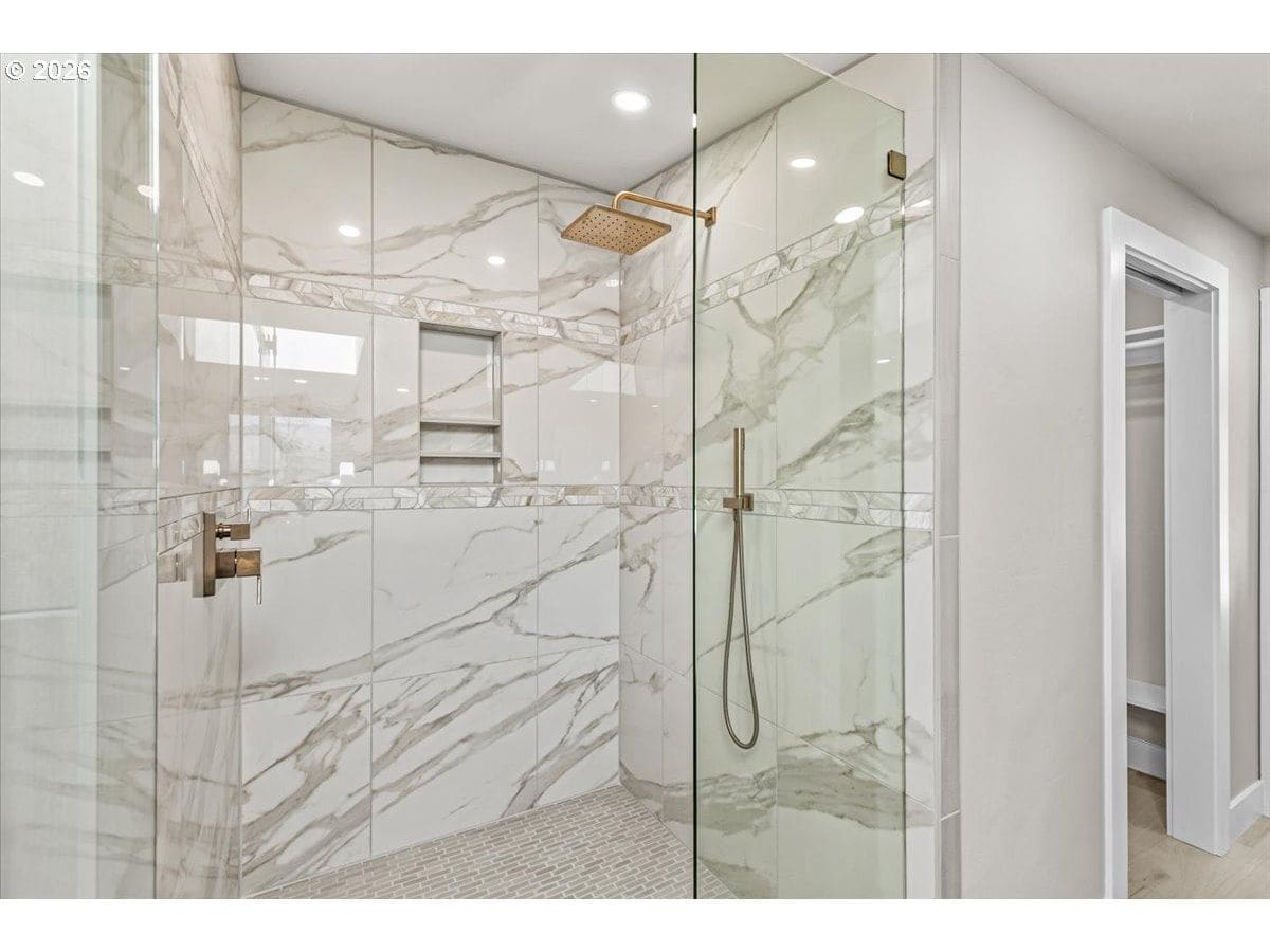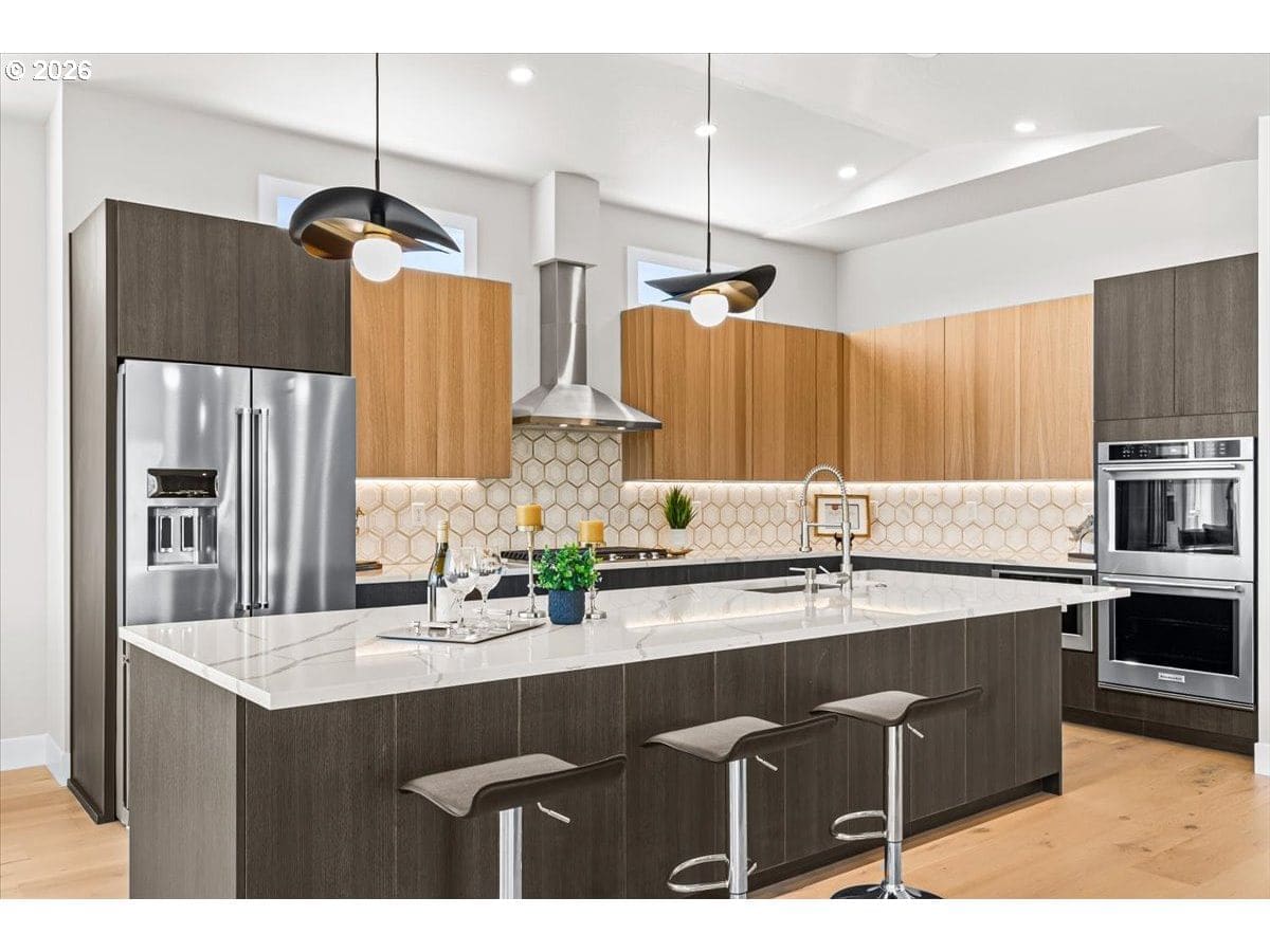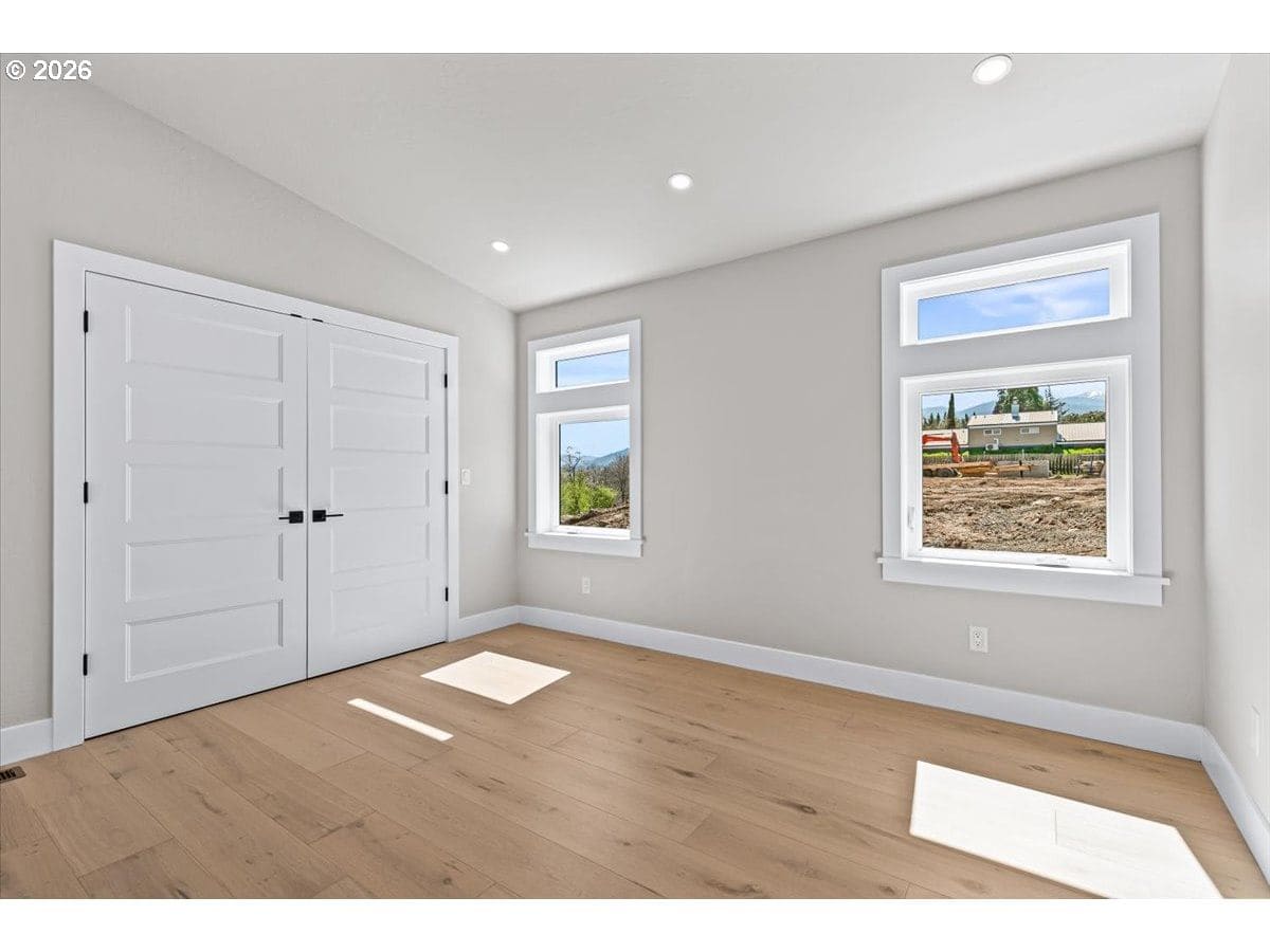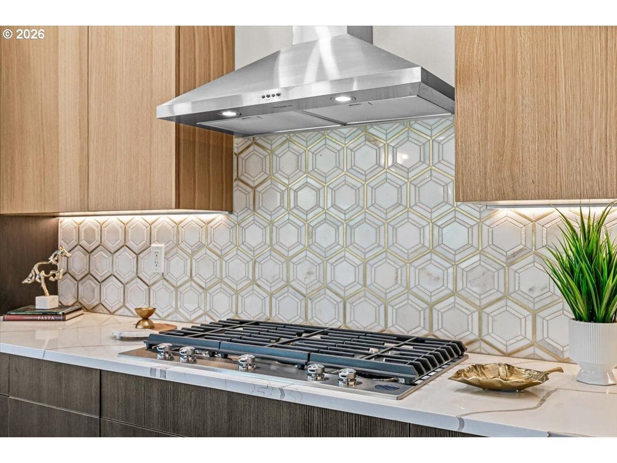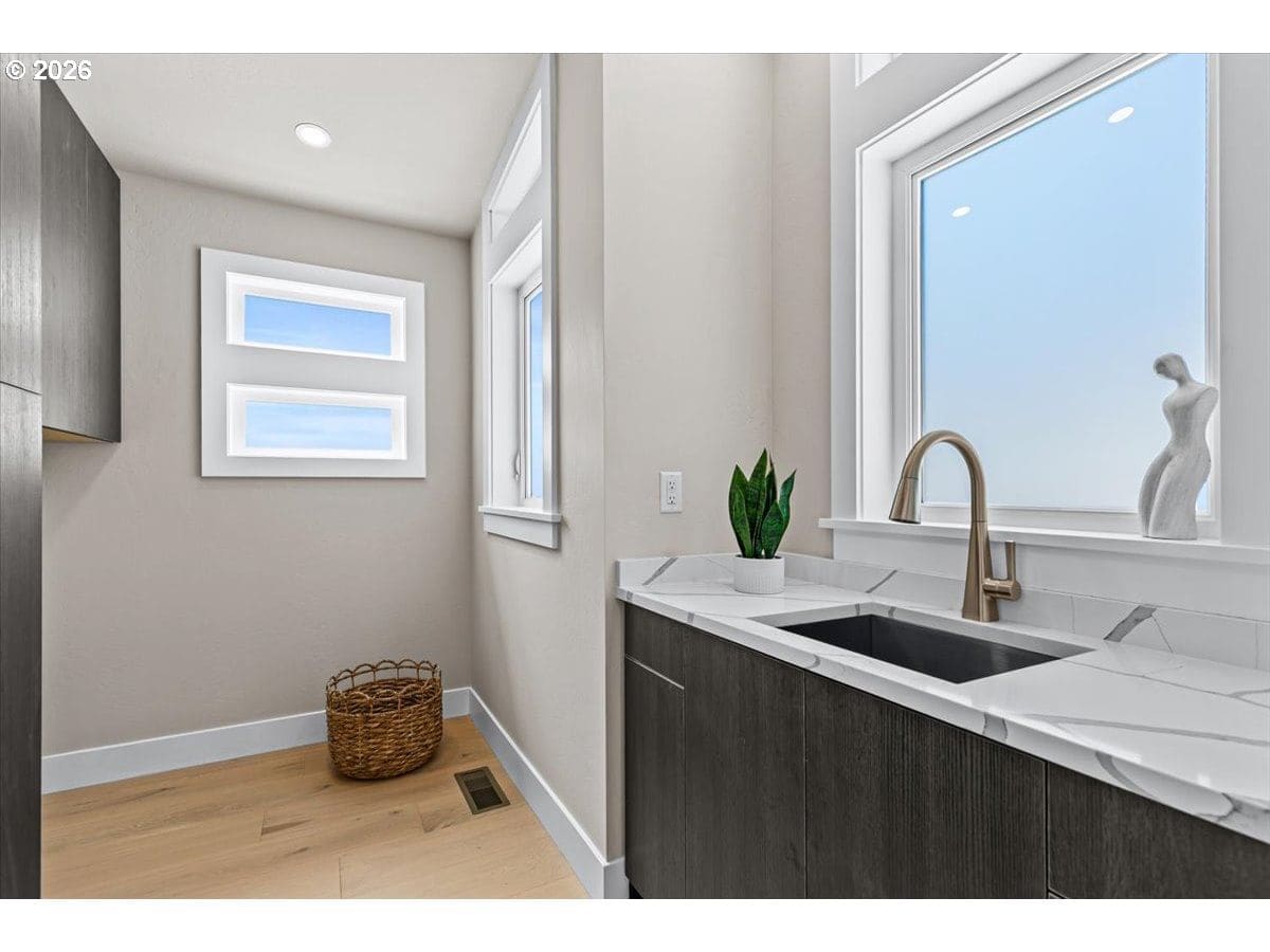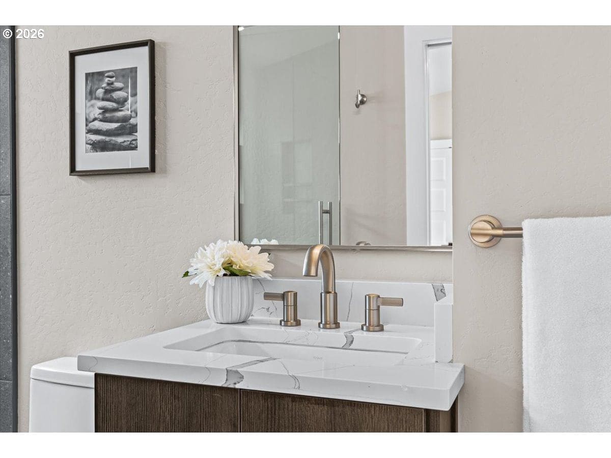 Platinum Earth Advantage home just minutes from downtown, offering 2,750 sq ft of thoughtfully designed 4BR, 3BA + office living space with stunning views of Grizzly Peak and the Cascades. This light-filled residence features 12’ ceilings, expansive windows, quartz surfaces, designer lighting, and blonde wide-plank hardwood floors. The main level features two ensuite bedrooms, highlighted by a luxurious primary suite with radiant heated floors, dual shower system, and two walk-in closets. The chef’s kitchen boasts an 11-ft island, double ovens, gas cooktop, beverage fridge, and walk-in pantry. Enjoy seamless indoor-outdoor living with an 8’ slider to a spacious view deck. Lower level offers 2 bedrooms, office, second laundry, and potential for separate living. Professionally landscaped, private setting with detached 2-car garage, EV charging, and energy-efficient 2-zone HVAC system. Home designed by Vadim Agakhanov.