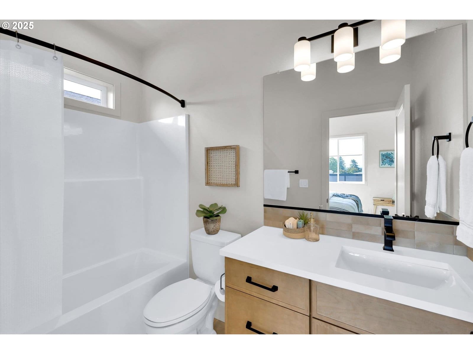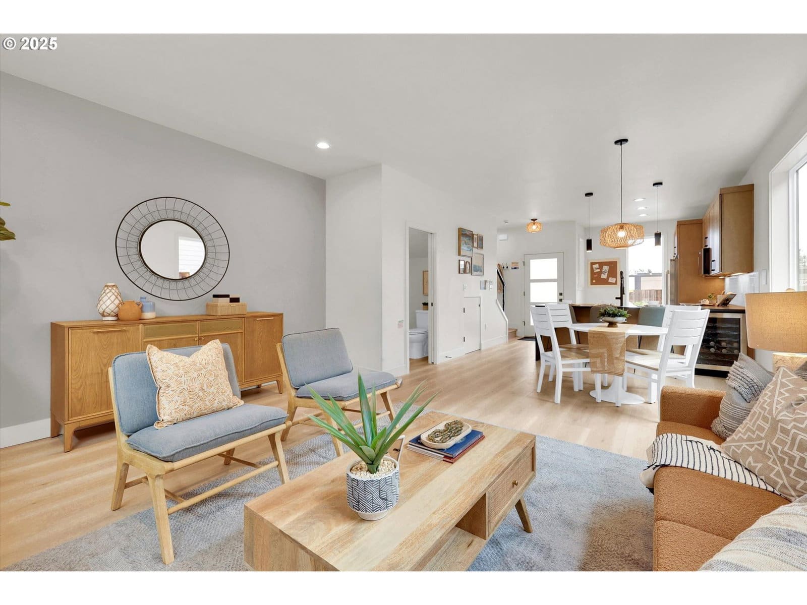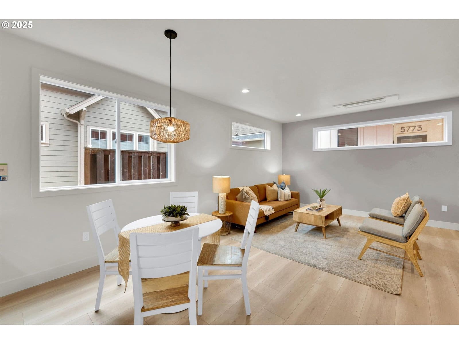 Exceptional quality new home in a great Johns Landing location just two blocks to Jola and walkable to the Willamette River Greenway Trail and Elephants. Walk score 79, bike score 97. Exceptionally light and bright with plentiful windows including transoms. Both bedrooms have their own bath and vaulted ceilings. Many special features including a wine refrigerator, under counter lighting, quartz countertops (waterfall in the kitchen), plumbed for central vacuum, soft close cabinet doors and drawers, fully wrapped windows upstairs and down, and even a built-in safe! It's the perfect urban home replete with a large front patio for enjoying the sun and your new neighbors. Furnished pictures are from model home (5769 S Kelly) which is also shown on the left in photo 5. The same exterior is shown in photo 6 (note the "bump out" in the upstairs right). [Home Energy Score = 10. HES Report at https://rpt.greenbuildingregistry.com/hes/OR10242205]