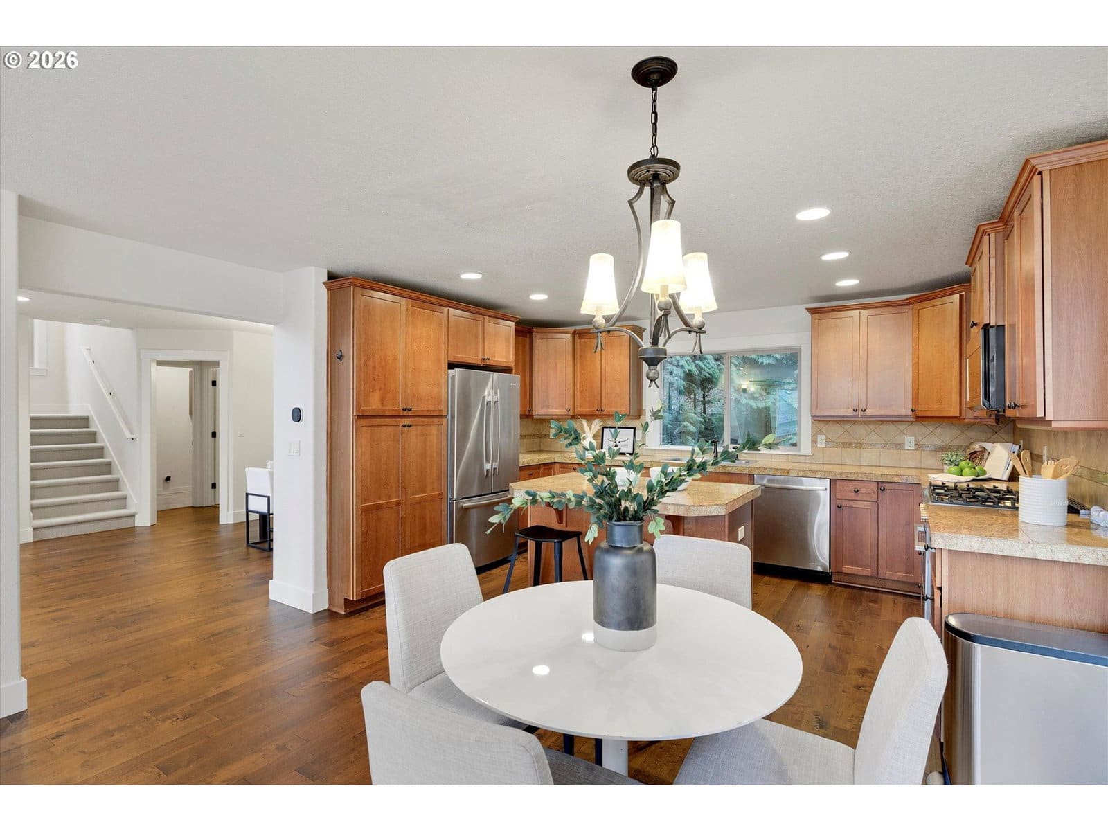 This inviting home features high ceilings and abundant natural light throughout, creating a bright and open atmosphere. Recent upgrades include engineered hardwood flooring, new carpet and tile, updated appliances, fresh interior and exterior paint, and a roof replaced in 2015. Additional improvements include a new exterior deck and stairs, hot water tank, and air conditioning. Generously sized rooms and a peaceful setting make this home both comfortable and welcoming.
