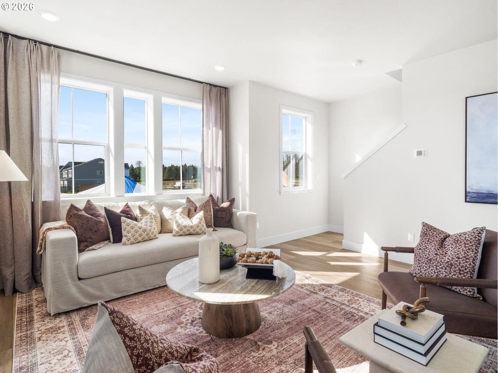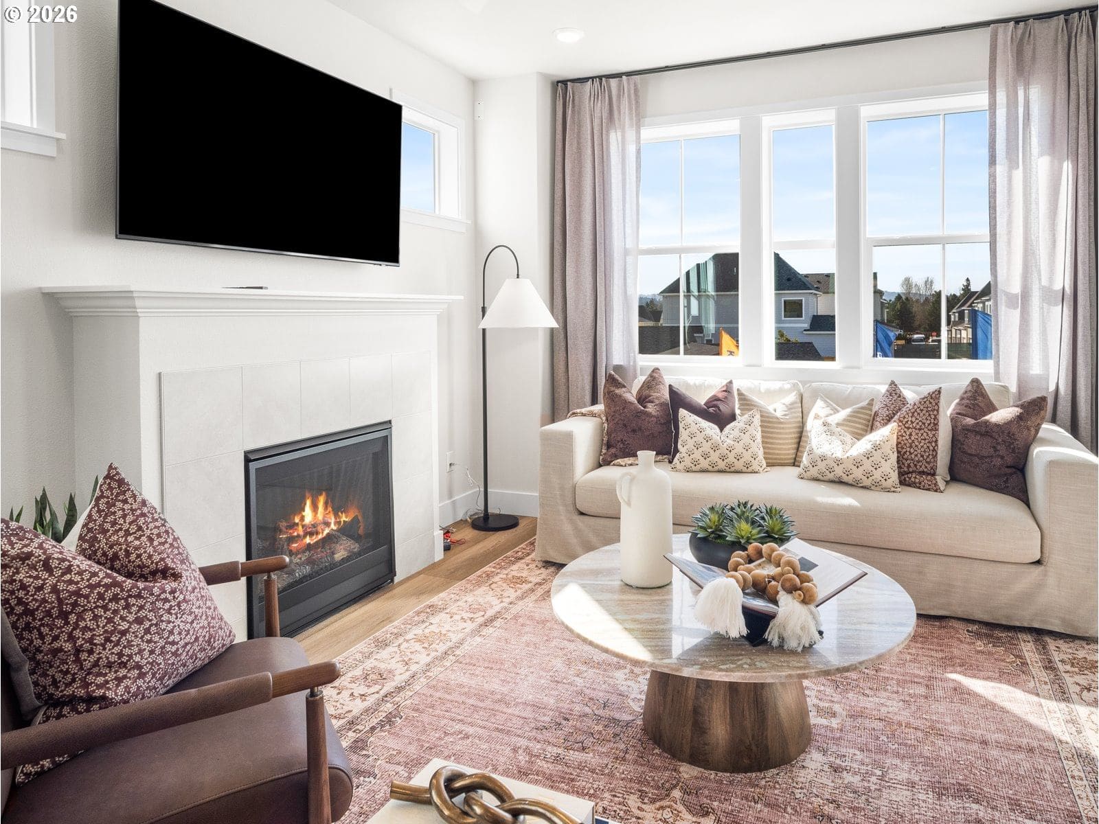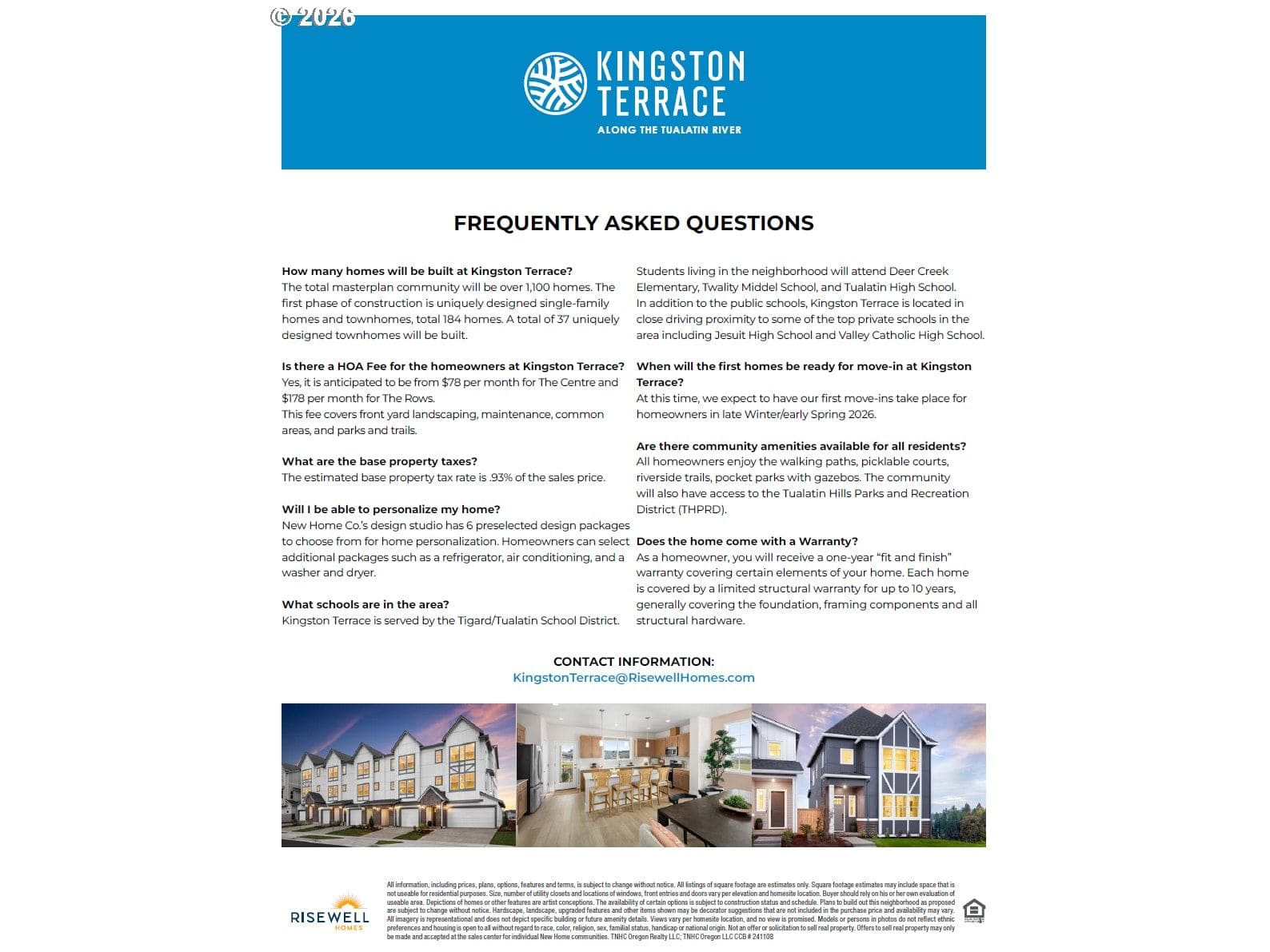 Discover Kingston Terrace, a vibrant new community designed for connection and convenience, with planned parks, walking trails, and future retail. This beautifully appointed three-level townhome offers 9ft ceilings on main floor, 3 bedrooms and 2.5 bathrooms, with an open-concept main level that seamlessly blends the living, dining, and kitchen areas. The kitchen features quartz countertops, a spacious island, and opens to a covered balcony—perfect for morning coffee or evening relaxation. Covered front porch too! A cozy fireplace anchors the living room, creating a warm and inviting atmosphere. The home also includes a two-car extra-deep garage for added storage and flexibility/shop. Also, a side-by-side driveway. Kingston Terrace is King City's newest community. Located in a vibrant community with future parks, retail, walking trails, and a pickleball court. Experience modern comfort in a thoughtfully planned neighborhood. Minutes to Progress Ridge & Freeway access. Ask about special financing options with the use of our preferred lender. Exterior pic of actual home at left, interior of model home. Parking in huge garage, and side-by-side driveway. Come by to take a walk thru.