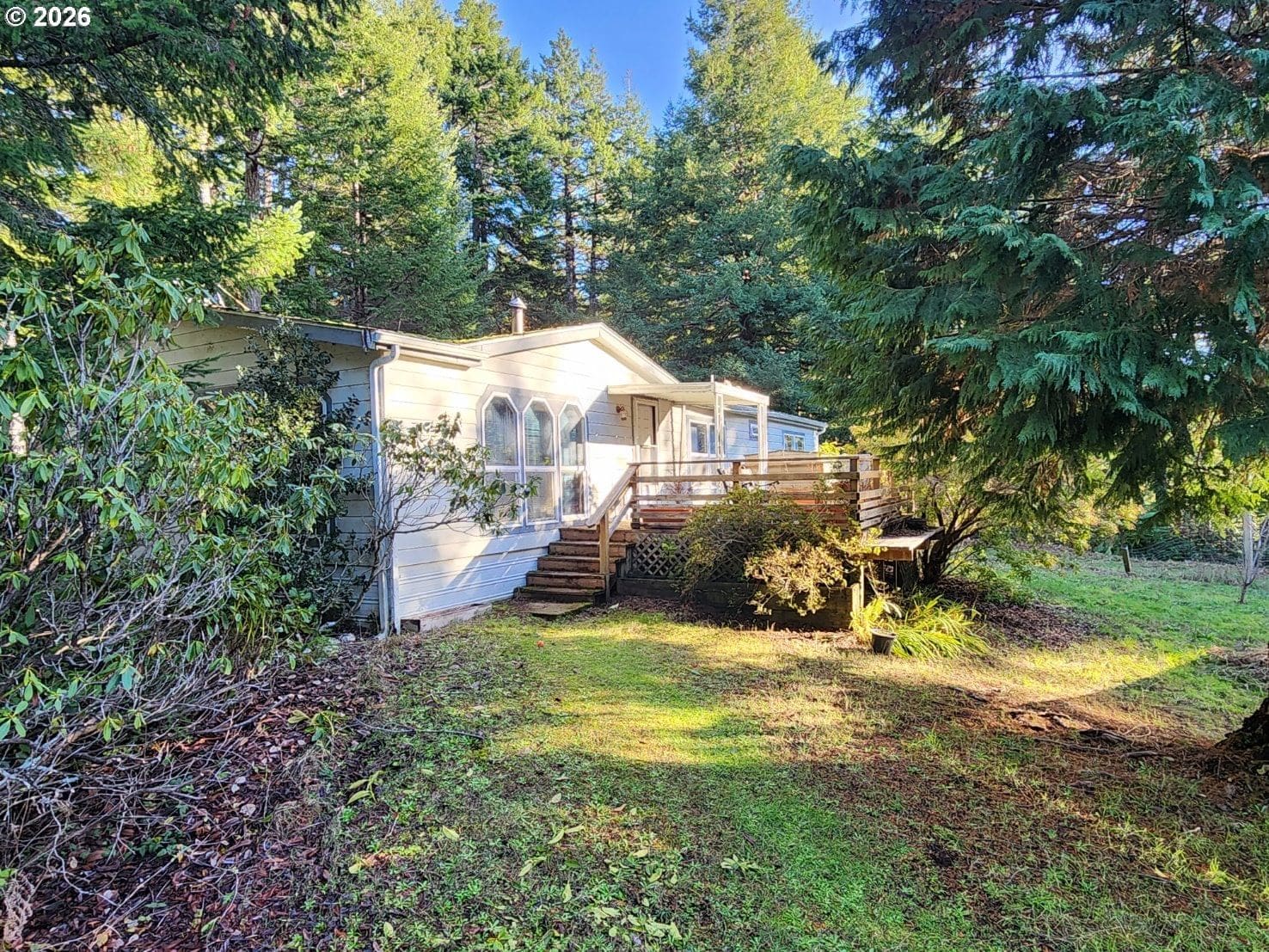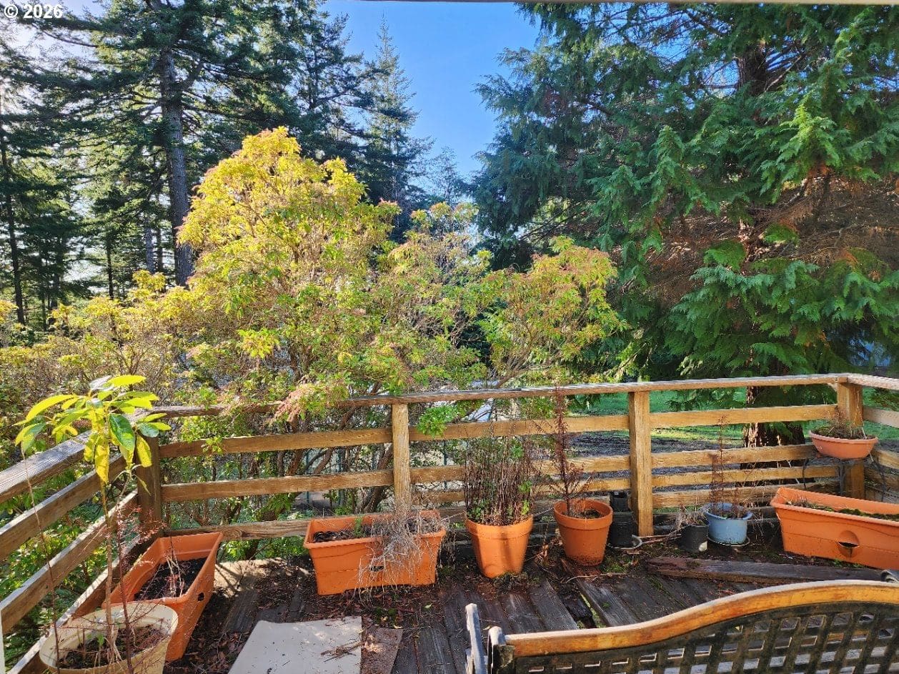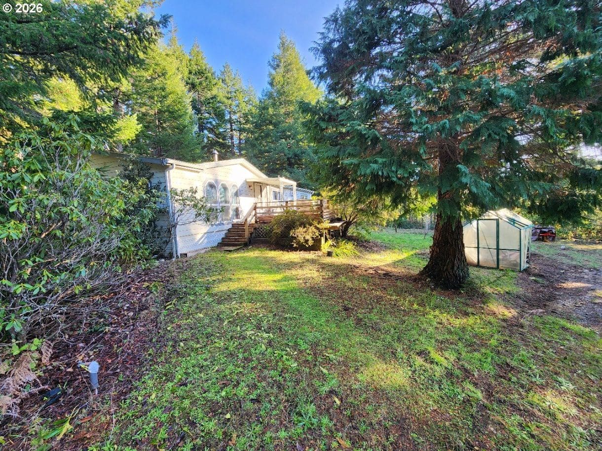 Peacefully situated on 1.5 acres up the Mountain in a Coastal town, this 3-bedroom, 2-bath home offers privacy, space, and a beautiful forested setting. Surrounded by mature trees with tranquil woodland views, the property features a large yard, detached two-car garage, expansive shop, and a greenhouse—ideal for hobbies, storage, or gardening. The home is currently in the process of being cleared and cleaned out, providing a great opportunity to personalize and add value. Enjoy the quiet, natural surroundings while remaining just a short drive to town and coastal amenities.