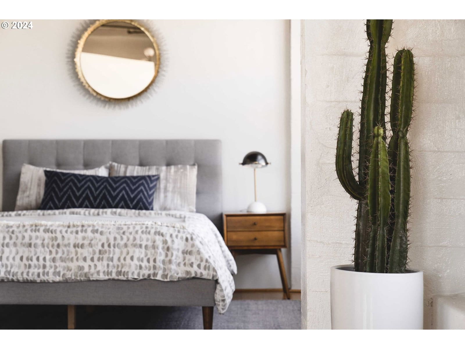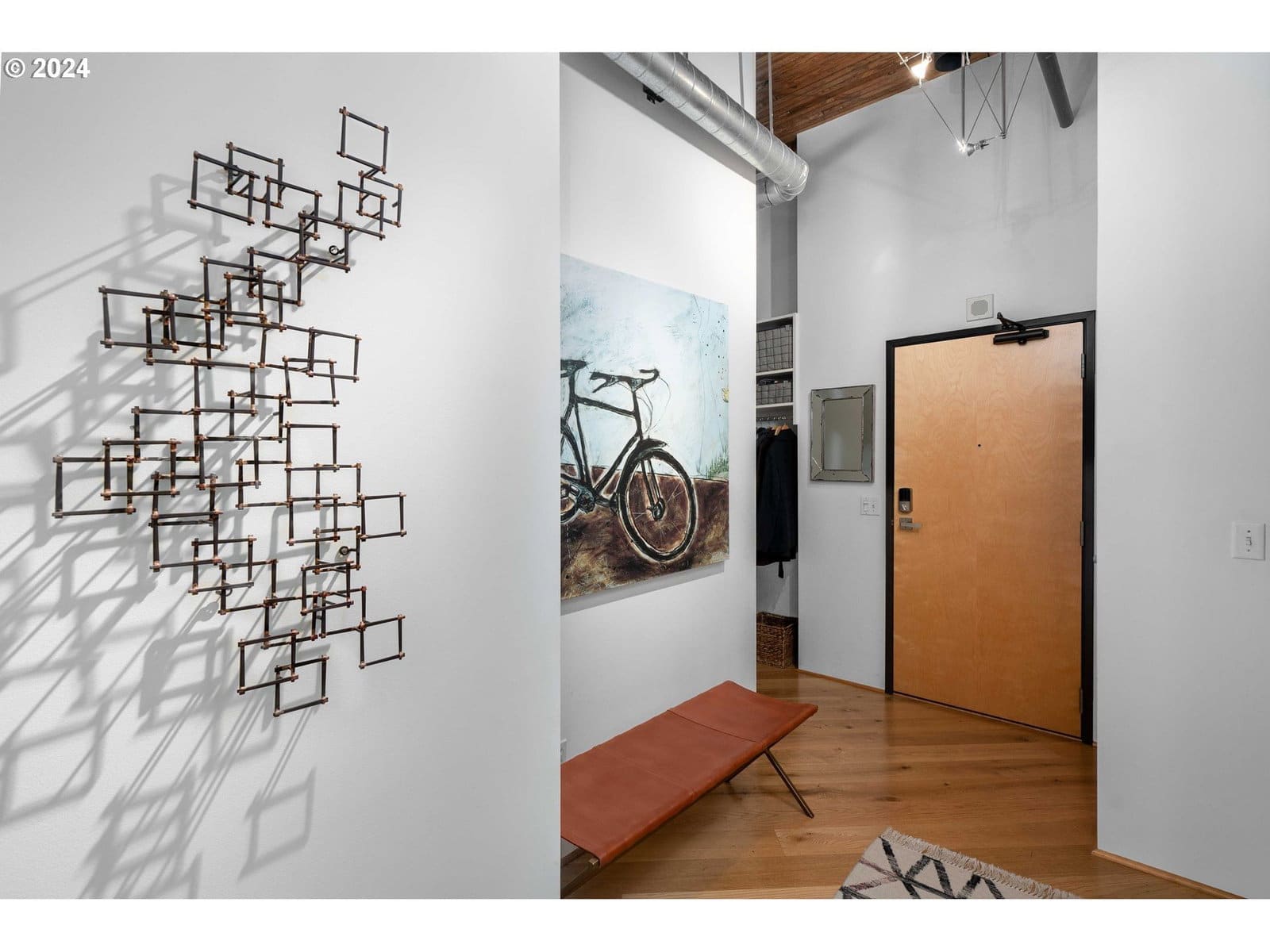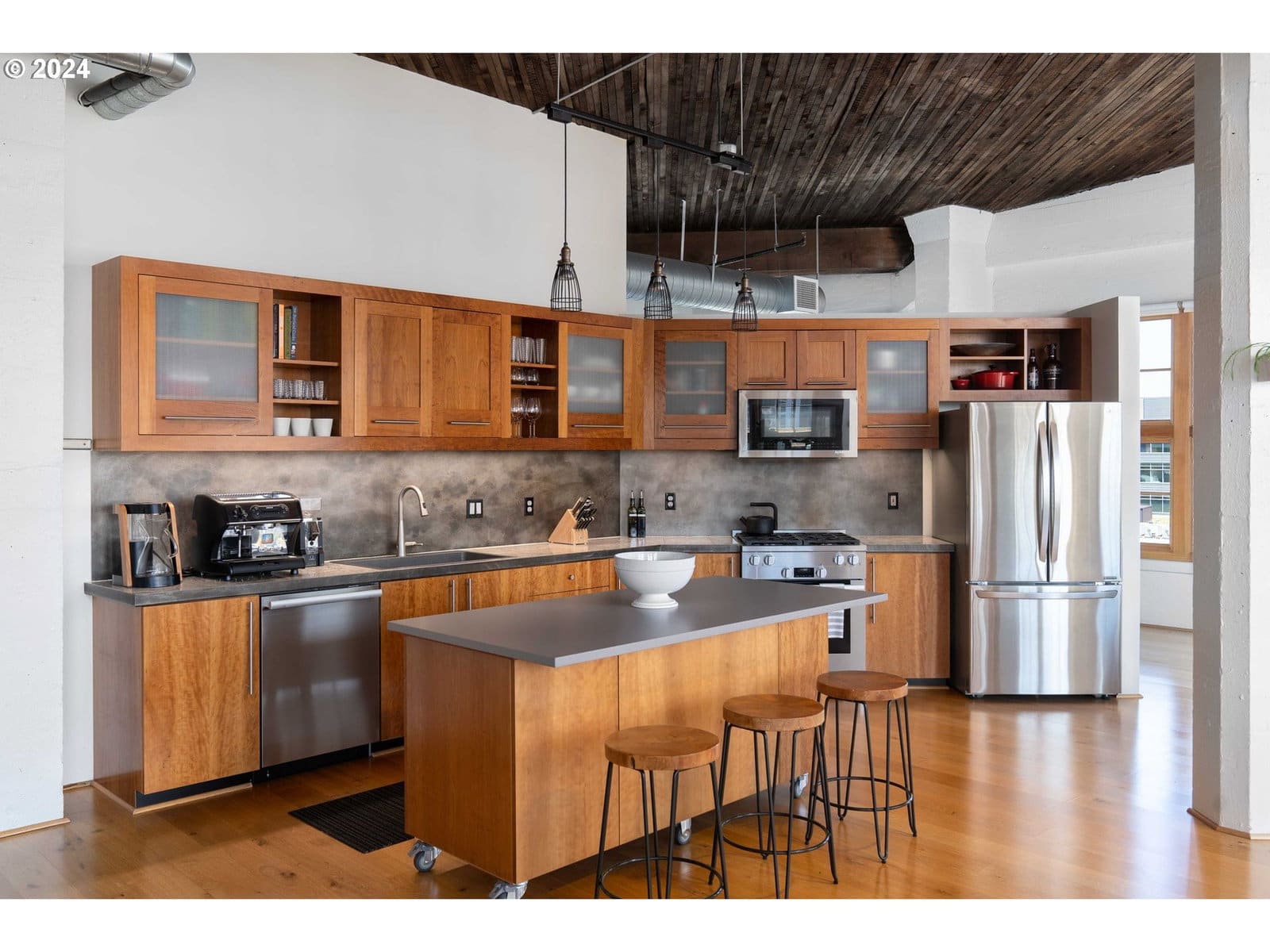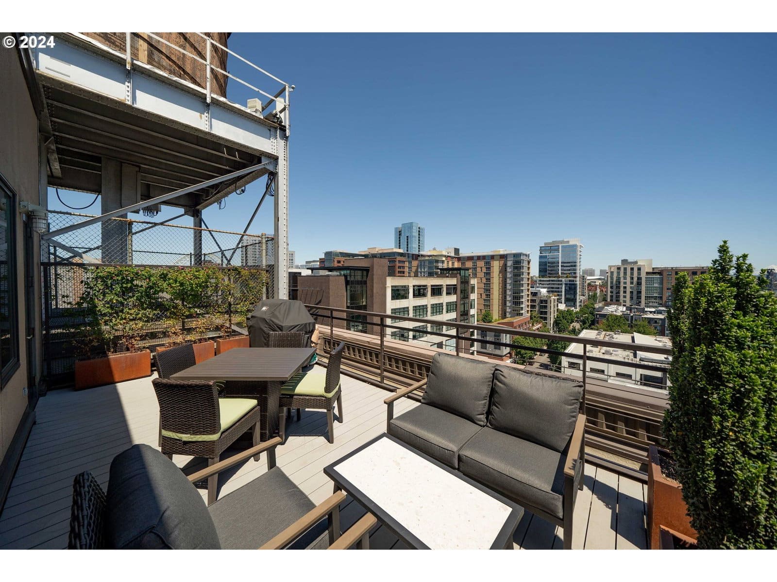 PRICE REDUCED $100,000!! Designed by Daniel Hudson Burnham, architect of New York’s Flatiron Building, the Marshall Wells Building remains one of the Pearl District’s most iconic addresses. This penthouse loft occupies the coveted northeast corner of the top floor. 14-foot ceilings and walls of windows frame Mt. Hood, the Steel, Broadway, and Fremont bridges, the skyline, and the Moda Center. Exposed brick and original timber beams anchor the space in its industrial past. A 2018 HVAC overhaul introduced a three-speed system, programmable thermostat, and refined ductwork, reducing energy costs. The primary bath was reimagined with heated tile floors, a soaking tub, and an expanded layout. The kitchen features upgraded appliances and under-cabinet LED lighting. Two garage parking spaces and an oversized storage unit with direct access offer rare convenience in the Pearl. Streetcar, galleries, parks, and coffee just outside. 3D tour and floorplan in photos.
