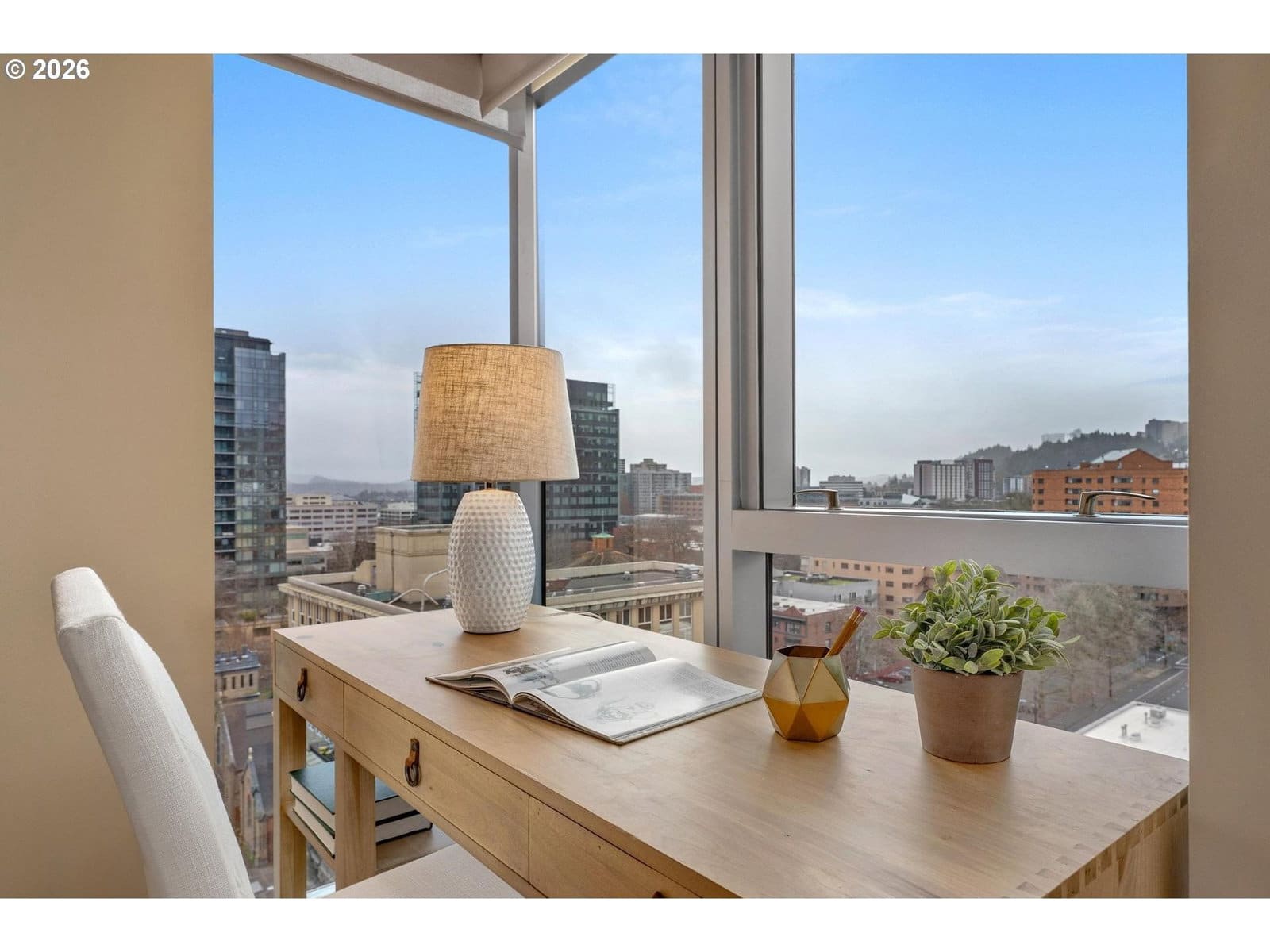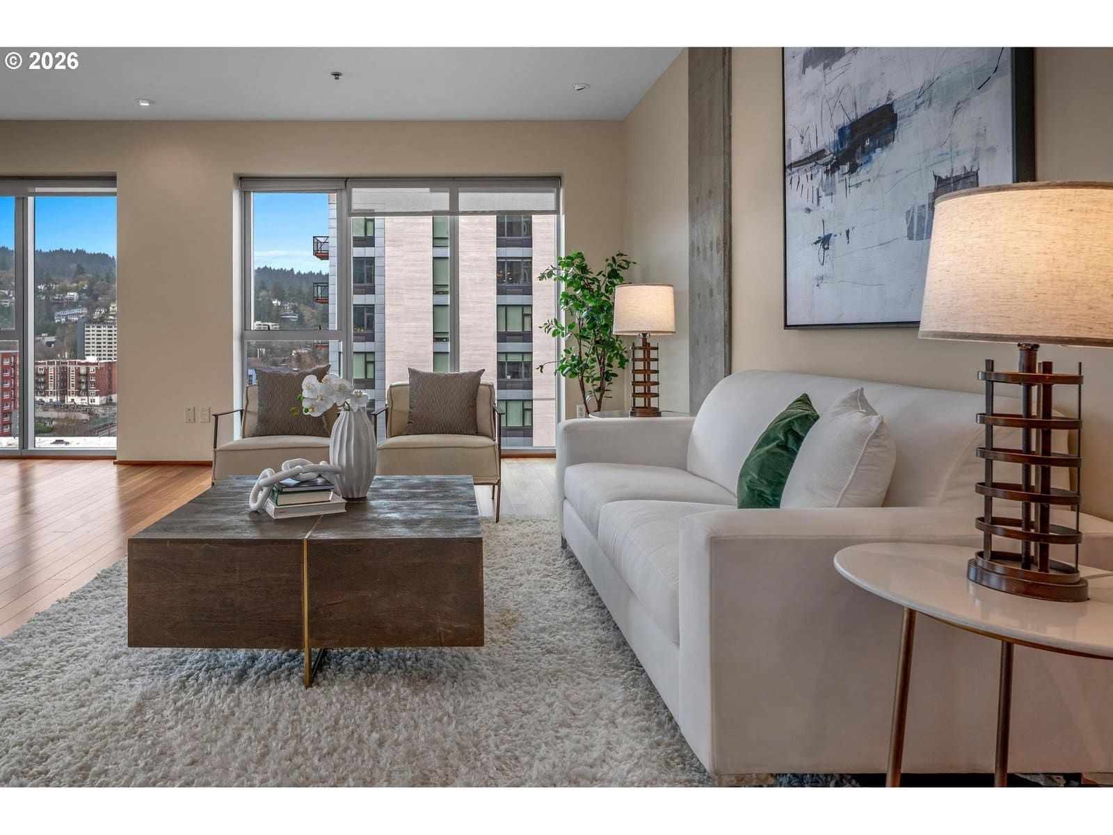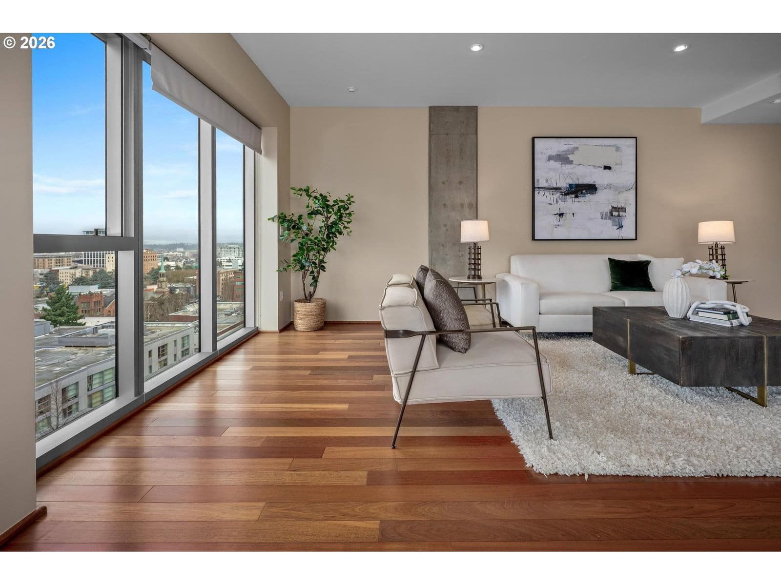 This 1,570 sf coveted SW corner unit is the one you've been waiting for! Well designed, with a gallery entry opening onto a spacious living and dining area, floor-to-ceiling windows and great natural light along with the special bonus of a SW corner niche that provides a cozy reading or relaxing space and multiple views allowing you to keep up on the weather, sunrises and sunsets in a very comfortable setting. The unit also offers rich hardwood floors, high ceilings, and an open contemporary kitchen ideal for entertaining, and opening on to a south-facing balcony. A spacious primary suite and a true 2nd bedroom with custom built-ins and a Murphy bed offers flexibility for guests or office needs. The laundry room includes storage and a Water Cop leak detection system with automatic shut off for peace of mind. In the heart of the Cultural Arts District, with a walk score of 98, you are just steps from the Art Museum with its new expansion including the Mark Rothko Pavilion and Coquelico Cafe, along with additional galleries, restaurants, shopping, the farmer’s market, and public transit. Building amenities include a common terrace with a kitchen, fitness center, library, meeting room, 24-hr concierge and a very well managed HOA. Two deeded parking spaces and a large deeded storage room complete this great package. EV parking infrastructure expense paid for by seller. Don’t miss this one!