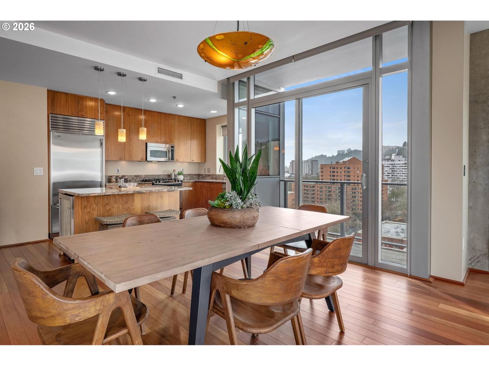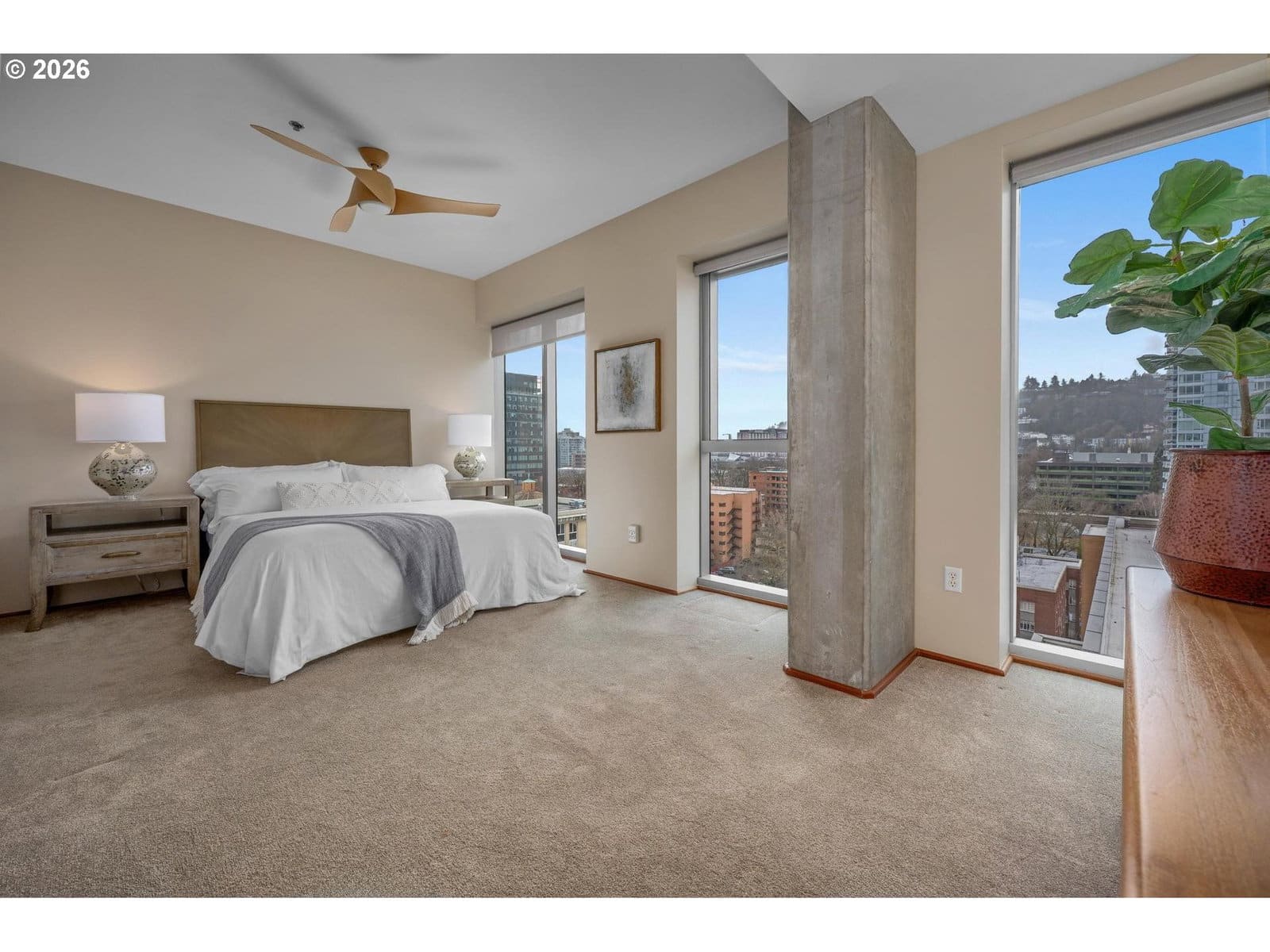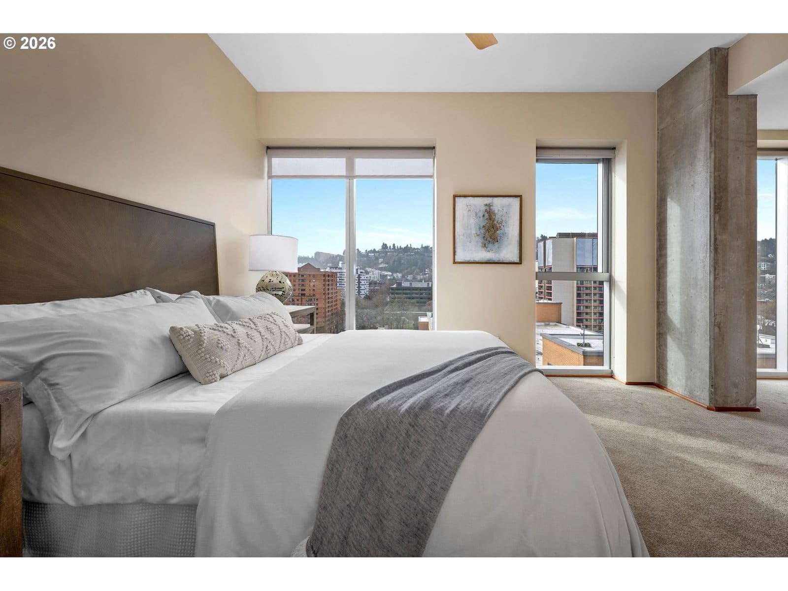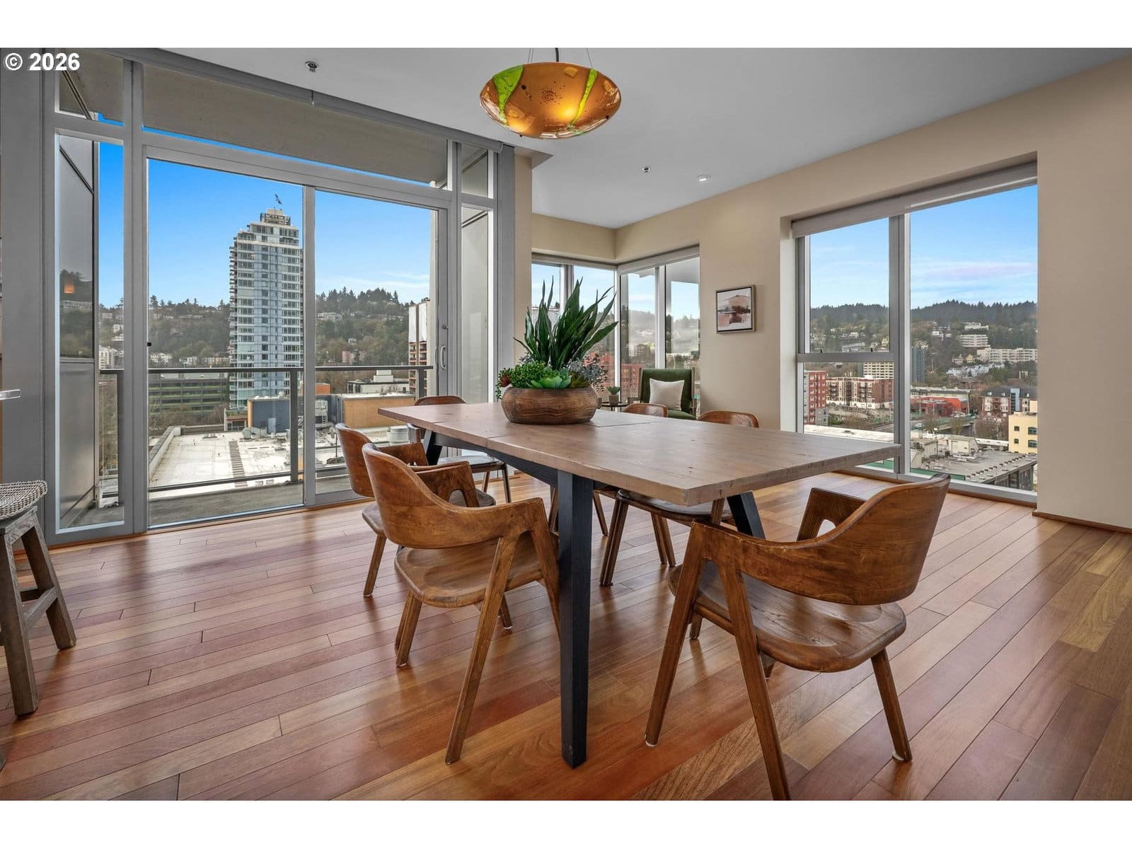 This 1,570 sf coveted SW corner unit is the one you've been waiting for! Well designed, with a gallery entry opening onto a spacious living and dining area, floor-to-ceiling windows and great natural light along with the special bonus of a SW corner niche that provides a cozy reading or relaxing space and multiple views allowing you to keep up on the weather, sunrises and sunsets in a very comfortable setting. The unit also offers rich hardwood floors, high ceilings, and an open contemporary kitchen ideal for entertaining, and opening on to a south-facing balcony. A spacious primary suite and a true 2nd bedroom with custom built-ins and a Murphy bed offers flexibility for guests or office needs. The laundry room includes storage and a Water Cop leak detection system with automatic shut off for peace of mind. In the heart of the Cultural Arts District, with a walk score of 98, you are just steps from the Art Museum with its new expansion including the Mark Rothko Pavilion and Coquelico Cafe, along with additional galleries, restaurants, shopping, the farmer’s market, and public transit. Building amenities include a common terrace with a kitchen, fitness center, library, meeting room, 24-hr concierge and a very well managed HOA. Two deeded parking spaces and a large deeded storage room complete this great package. EV parking infrastructure expense paid for by seller. Don’t miss this one!