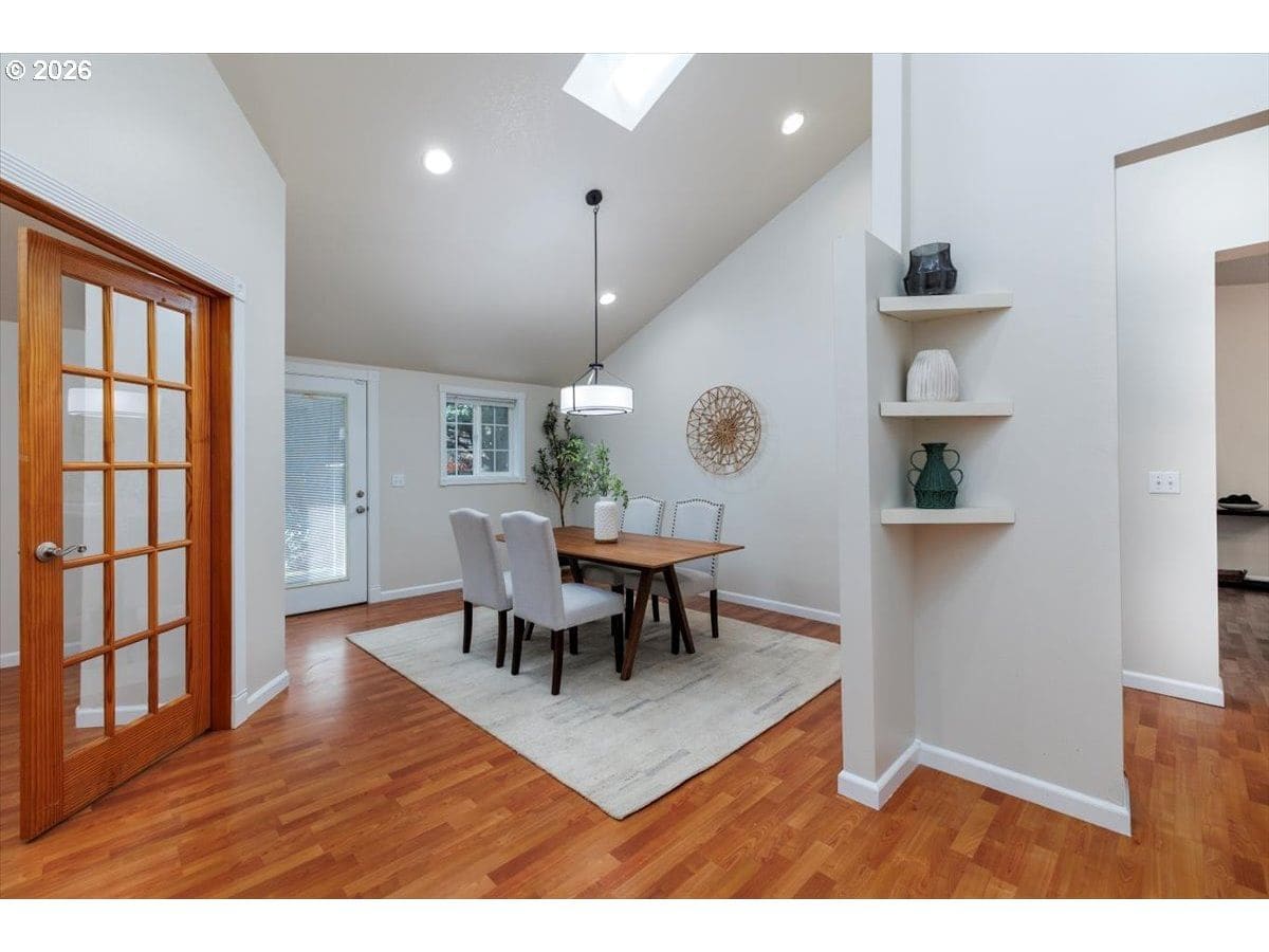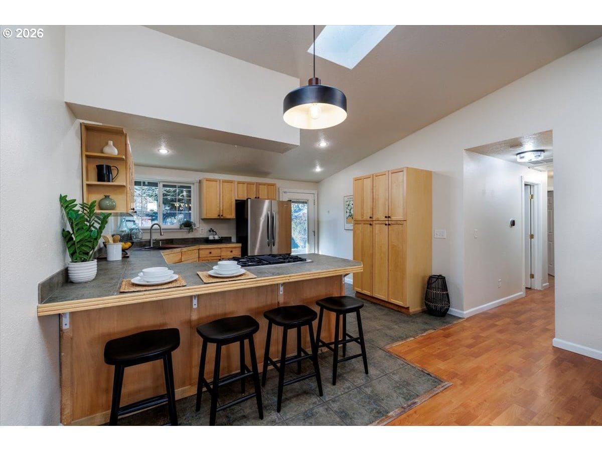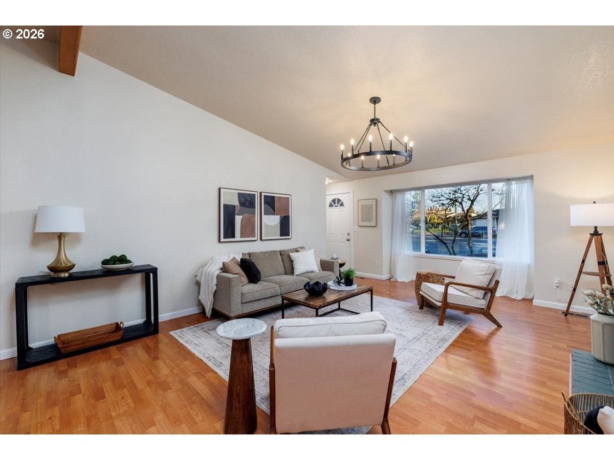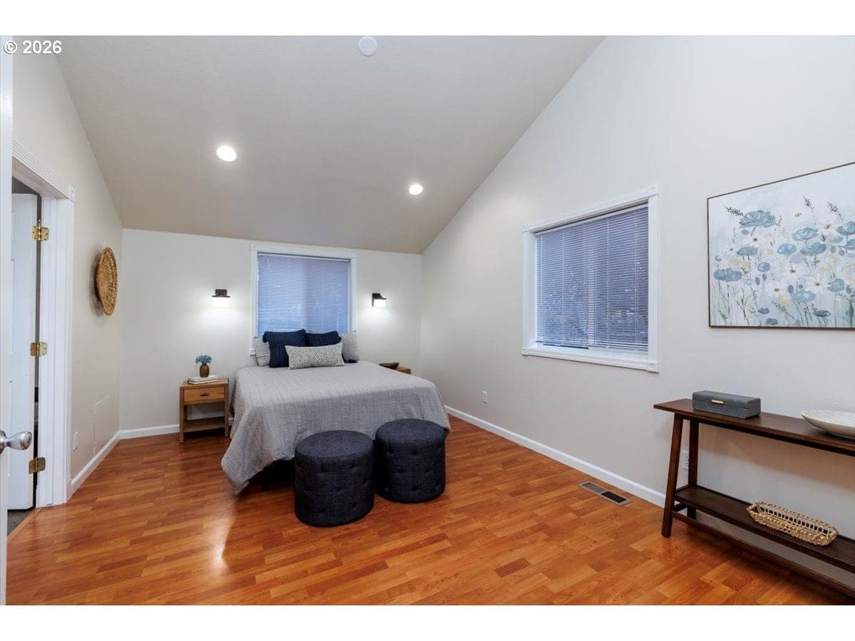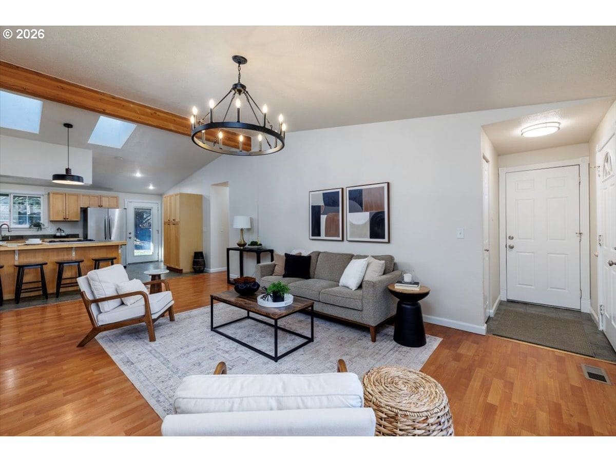 Enjoy easy one-level living in this spacious home tucked away on a quiet cul-de-sac. Vaulted ceilings and skylights create a bright, airy atmosphere throughout.Designed with flexibility in mind, the home features two primary suites plus three additional bedrooms—ideal for multigenerational living, guests, or work-from-home needs. The vaulted great room is the heart of the home, complete with a cozy wood-burning fireplace and open to the kitchen, which offers stainless steel appliances and abundant cabinet space. Freshly painted interior and exterior, updated. hall bath, new light fixtures throughout.Step outside to a fully fenced backyard with a patio, fire pit, and mature landscaping—perfect for relaxing or entertaining. The heated 415 sq ft outbuilding provides incredible versatility and can serve as a home office, playroom, studio, workshop, storage space, or your own private retreat. [Home Energy Score = 4. HES Report at https://rpt.greenbuildingregistry.com/hes/OR10243359]