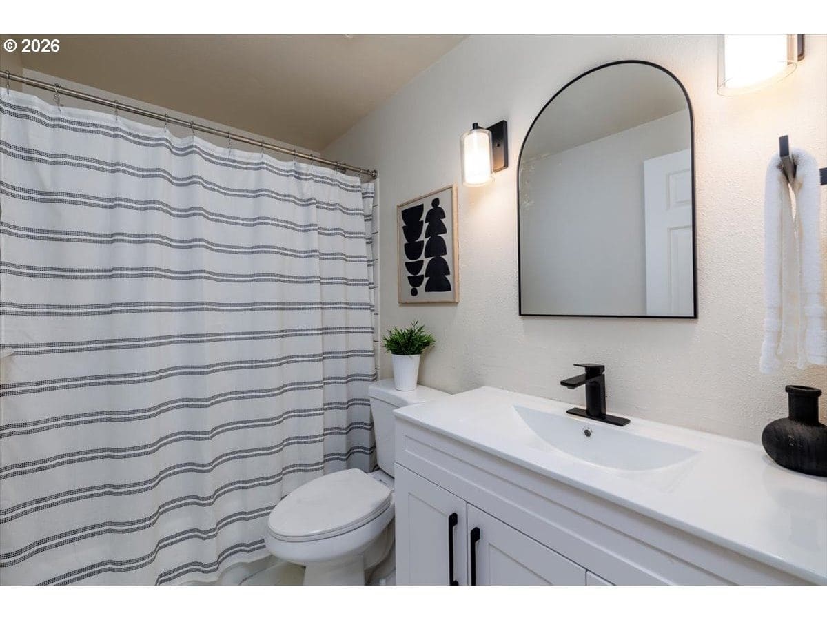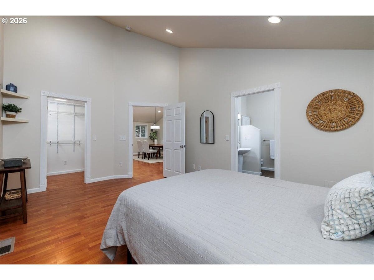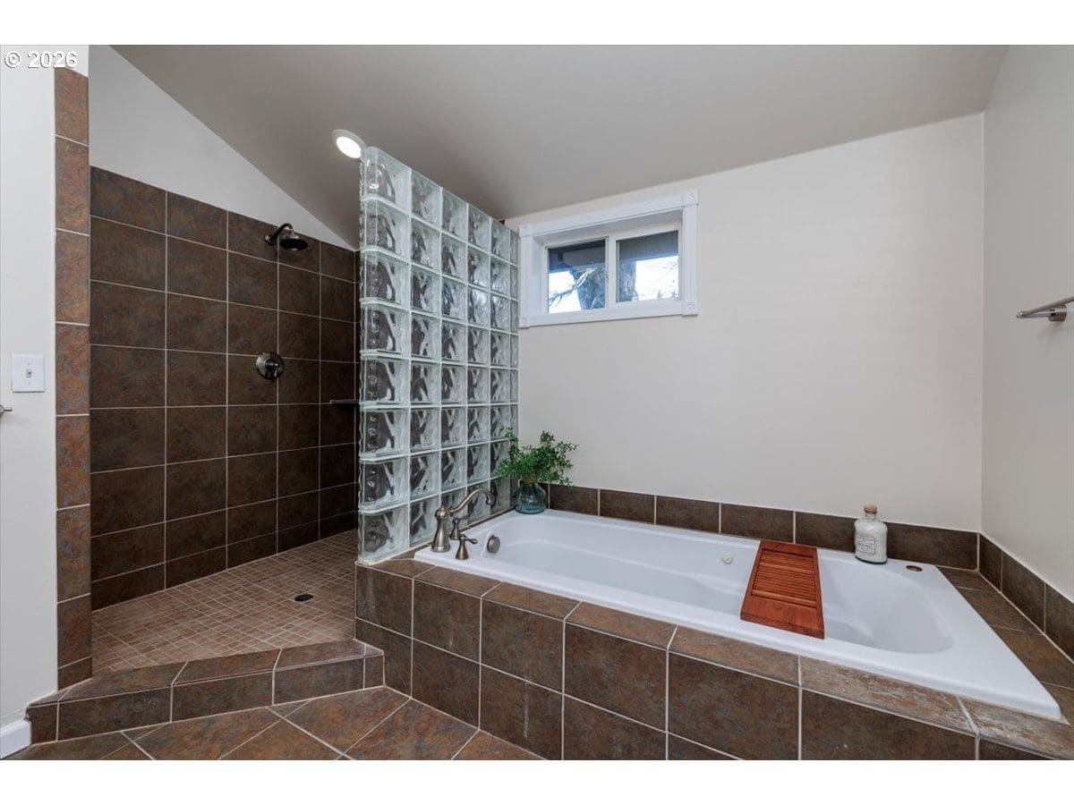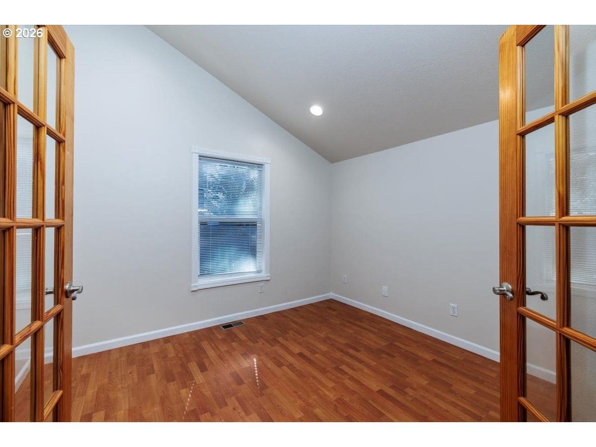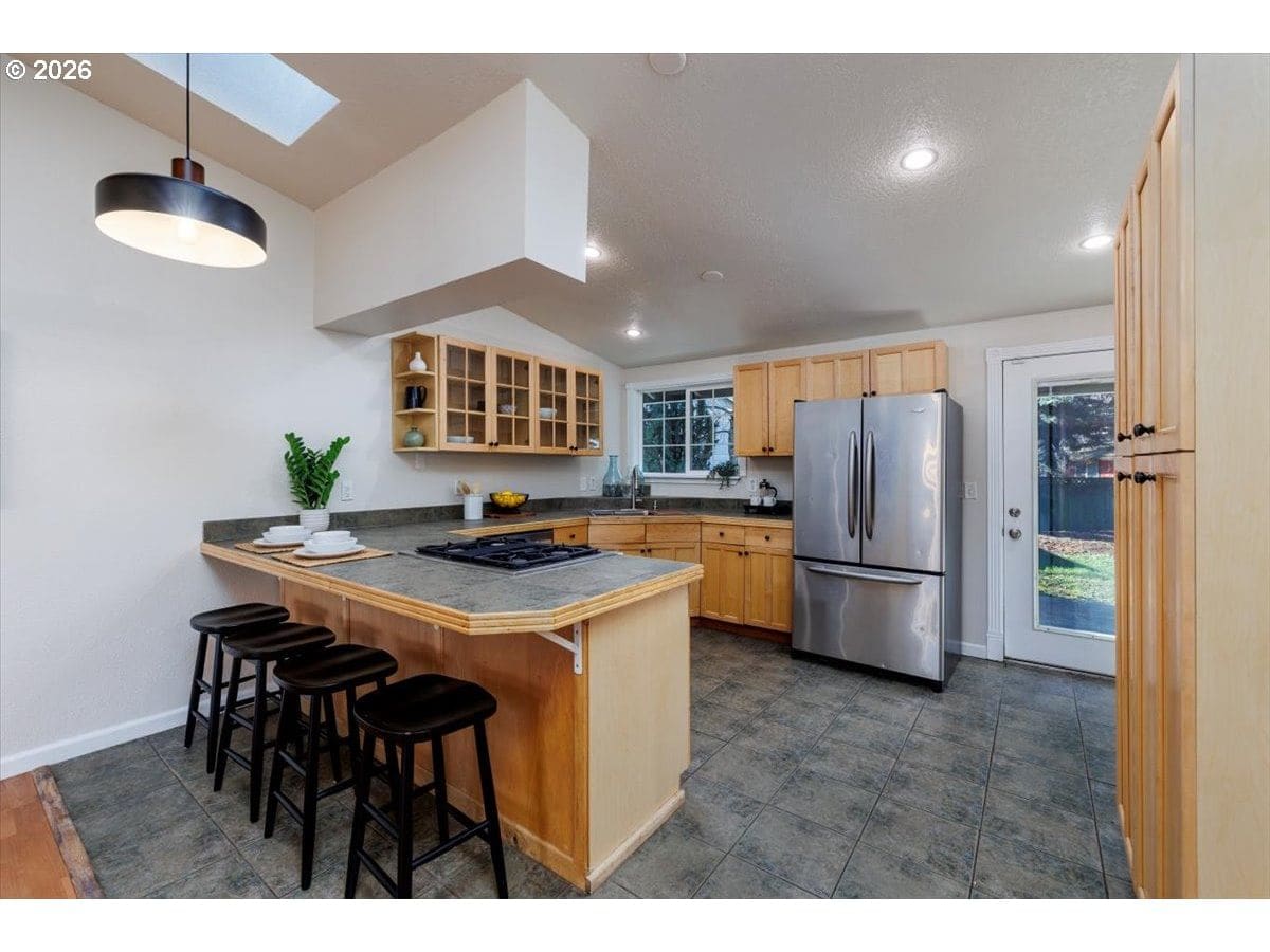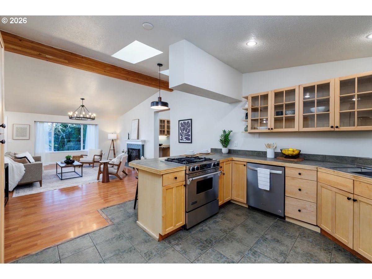 Enjoy easy one-level living in this spacious home tucked away on a quiet cul-de-sac. Vaulted ceilings and skylights create a bright, airy atmosphere throughout.Designed with flexibility in mind, the home features two primary suites plus three additional bedrooms—ideal for multigenerational living, guests, or work-from-home needs. The vaulted great room is the heart of the home, complete with a cozy wood-burning fireplace and open to the kitchen, which offers stainless steel appliances and abundant cabinet space. Freshly painted interior and exterior, updated. hall bath, new light fixtures throughout.Step outside to a fully fenced backyard with a patio, fire pit, and mature landscaping—perfect for relaxing or entertaining. The heated 415 sq ft outbuilding provides incredible versatility and can serve as a home office, playroom, studio, workshop, storage space, or your own private retreat. [Home Energy Score = 4. HES Report at https://rpt.greenbuildingregistry.com/hes/OR10243359]