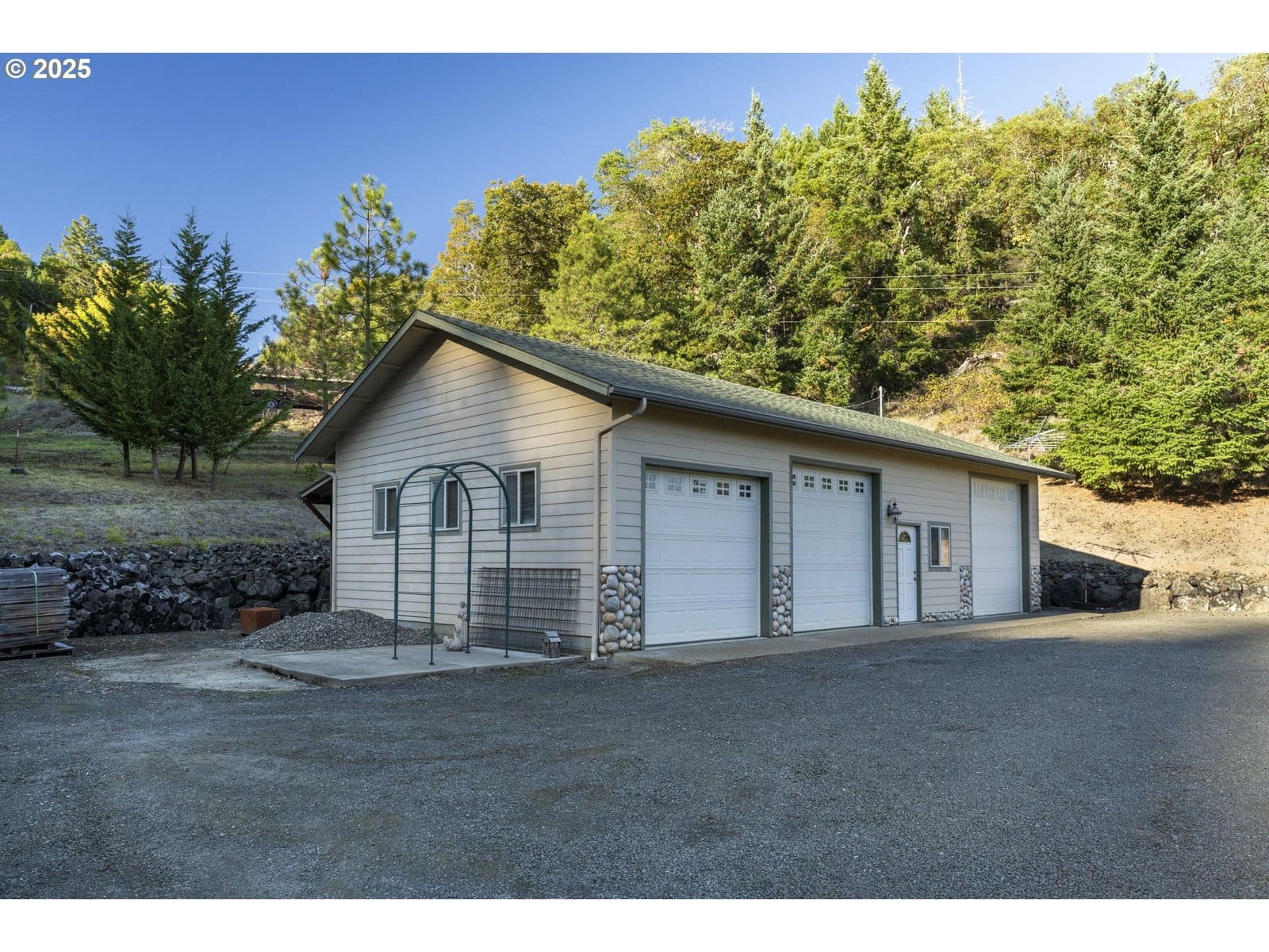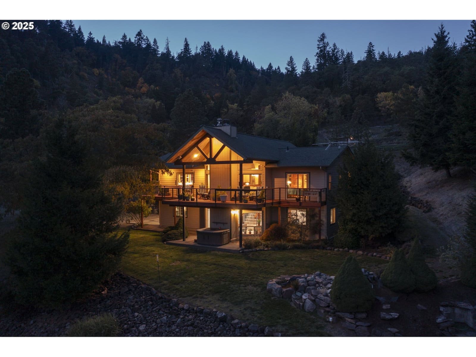 This property offers a truly beautiful and private setting with outstanding views. The home welcomes you with a grand entrance featuring a large rustic staircase. Both the scenic views and a river rock fireplace draw you into the living room, which boasts vaulted ceilings.The primary suite is a serene retreat, complete with sliding doors that open to a private deck, two walk-in closets, and an en-suite bathroom offering a separate tub, shower, and double vanity. The kitchen and dining room also feature sliding doors, providing seamless access to the main deck, perfect for entertaining or enjoying the outdoors. Practical amenities include a double-car attached garage and an impressive 28 x 50 shop with a full bathroom and laundry hook-up. Additionally, there is a separate tool shed with a concrete floor and power. There are approximately 3-acres with an invisible fence system, ensuring pets can safely roam. The property also features a fenced garden area with raised beds.