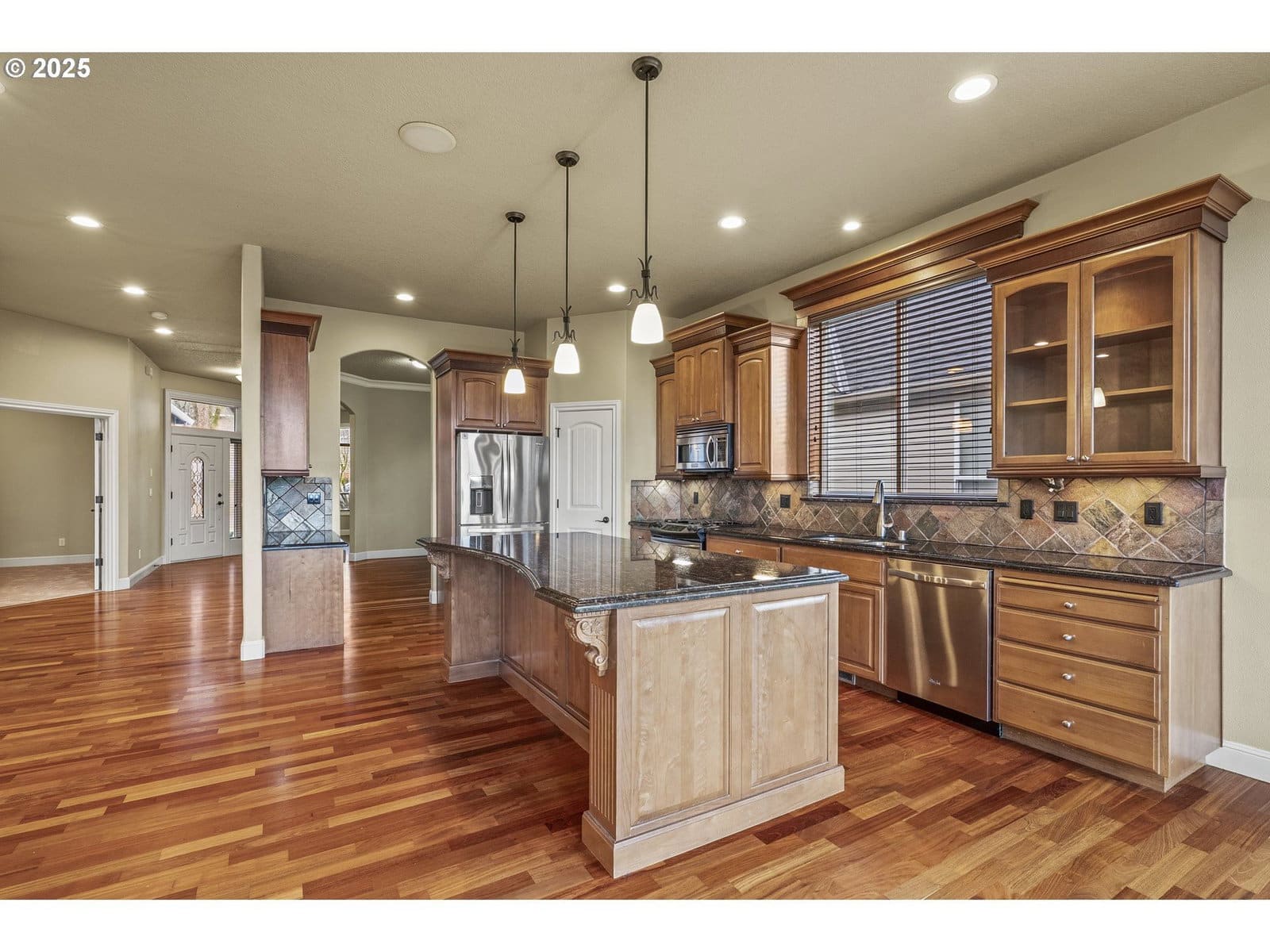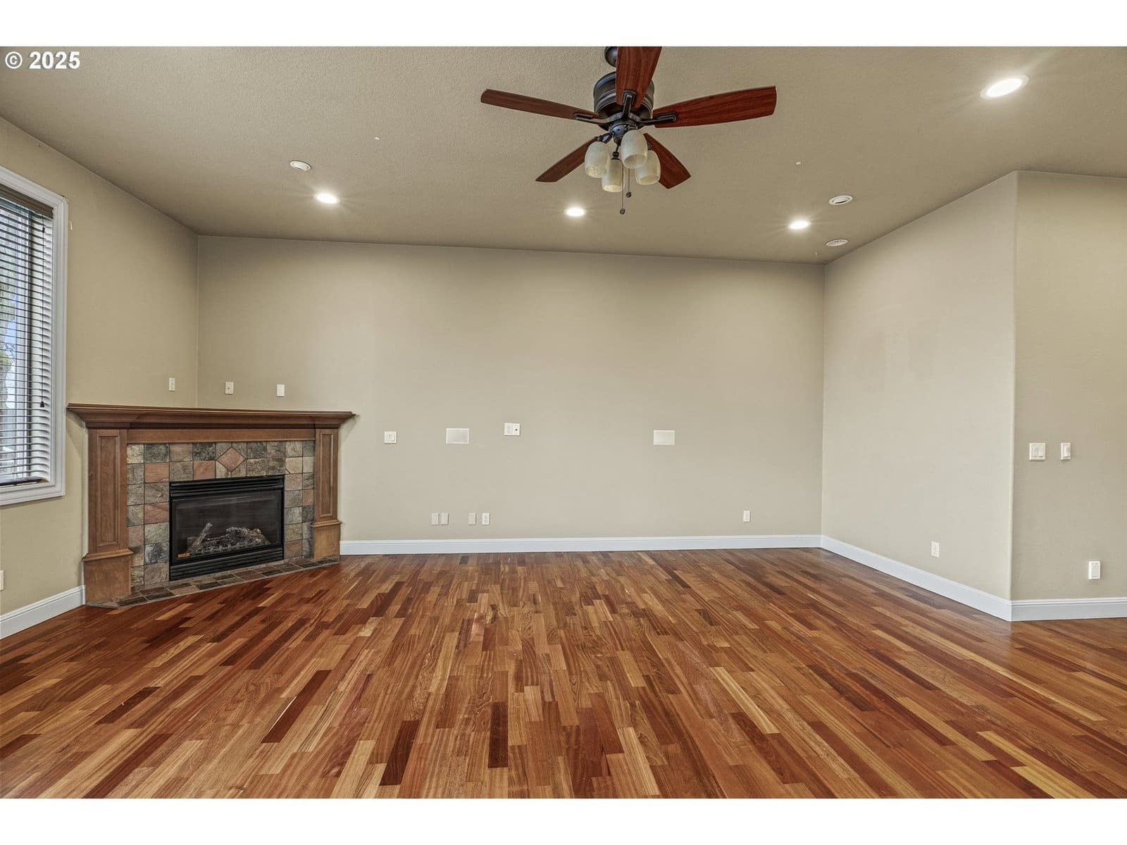 This 2,568 sq ft home offers a comfortable, open layout, beautiful inlayed wood floors, spacious kitchen with granite counters, large island, stainless appliances and an easy flow to the family room with gas fireplace. 3 bedrooms+ (fourth bedroom was converted into a walk-in closet for the primary suite and could easily be converted back). Primary bathroom features a jetted tub, tiled shower and heated bathroom floors. Some smart features throughout, wired for speakers inside and out, fenced backyard with deck, built in vac system, sprinkler system for easy maintenance. Quiet neighborhood, no HOA, and conveniently located near the golf course and pickleball courts. Warm, well-cared-for home that feels good the moment you walk in.