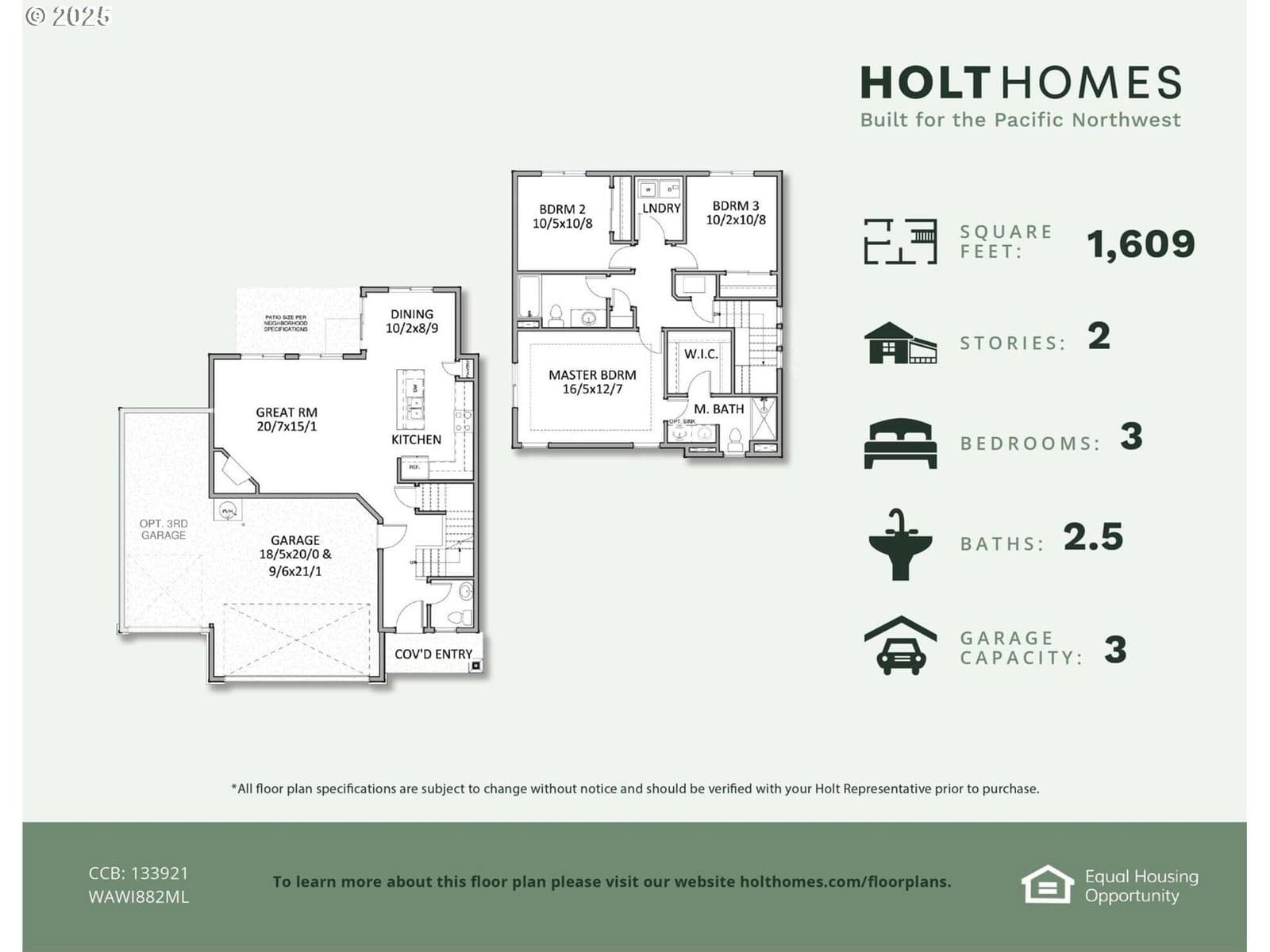 SAMPLE PHOTOS Displayed. The 1609 floor plan is a beautiful 3 bedroom 2.5 bath with entry access from the garage or covered porch, the great room opens up to the kitchen, complete with slab counters, stainless steel gas appliances, kitchen island and pantry.Rates as low as 2.99% with in house lender.
