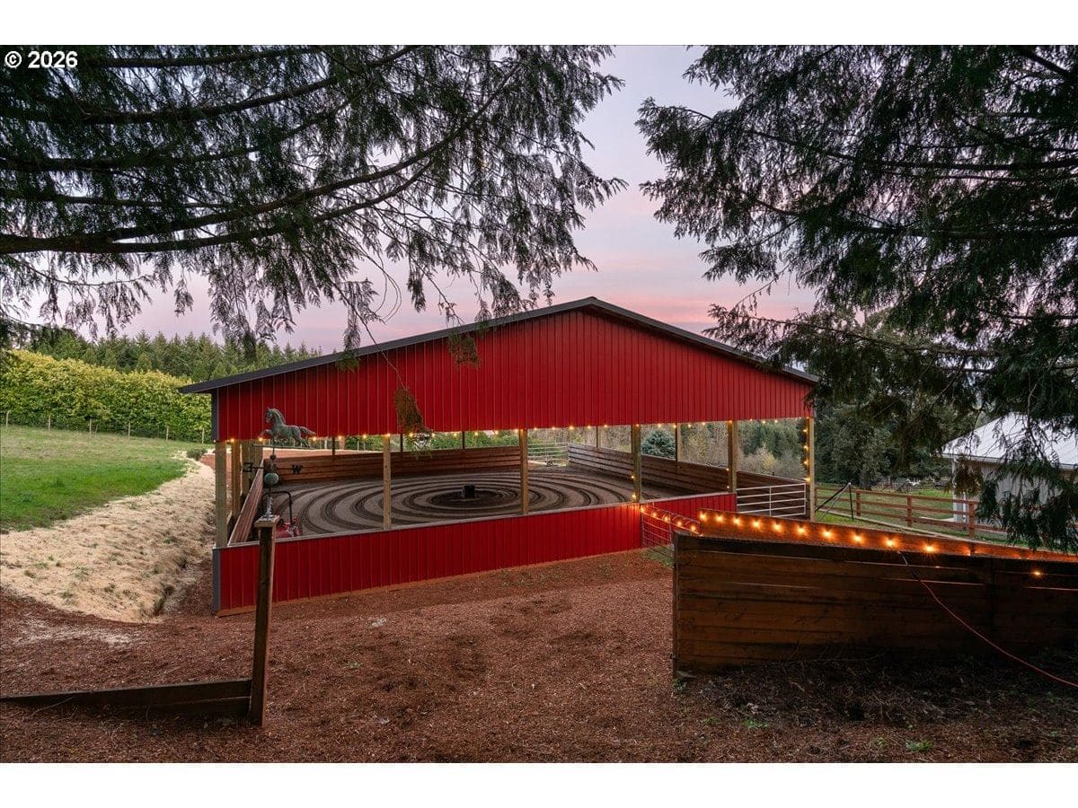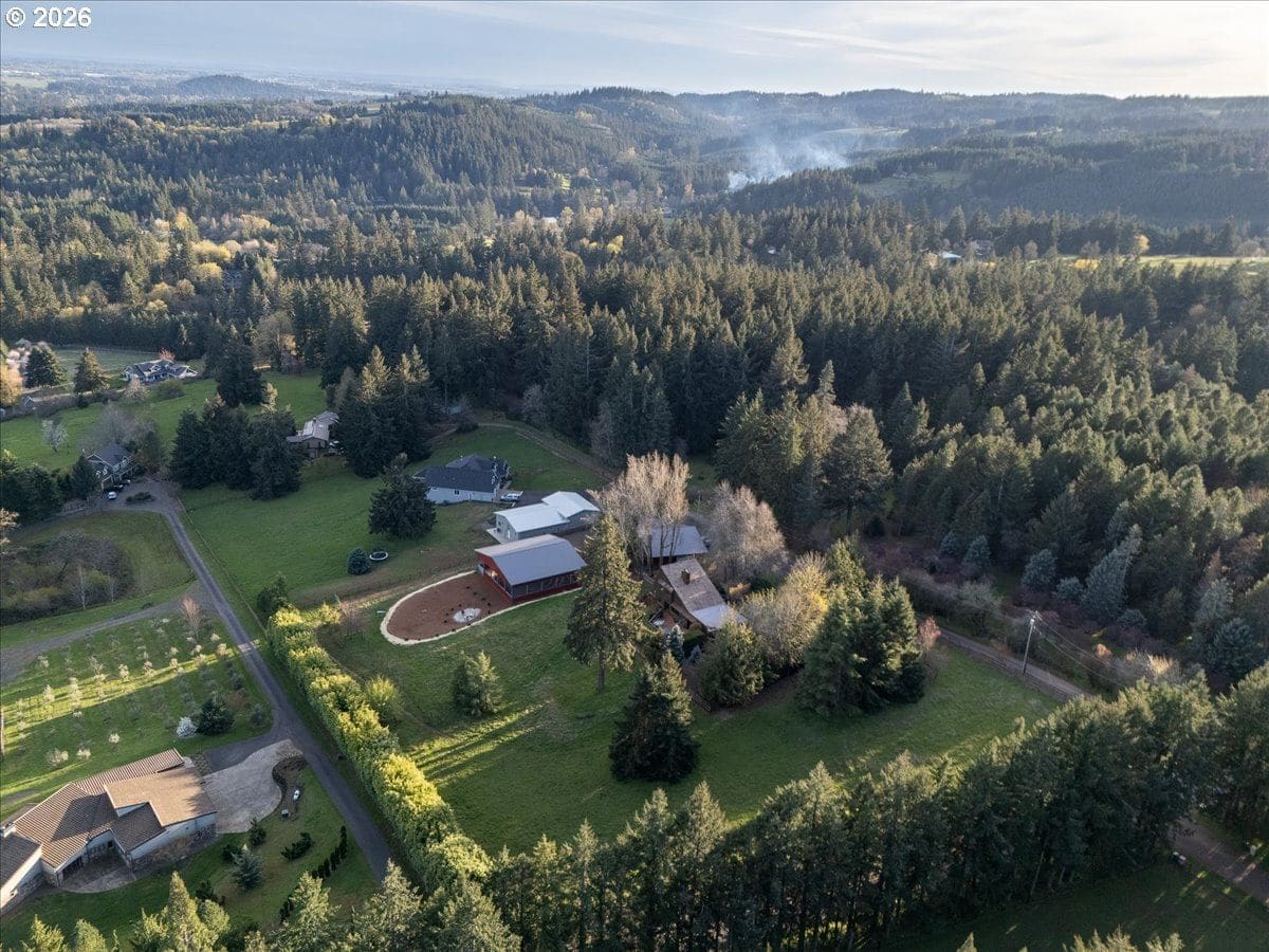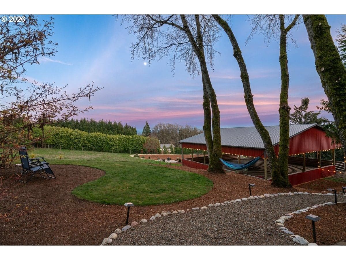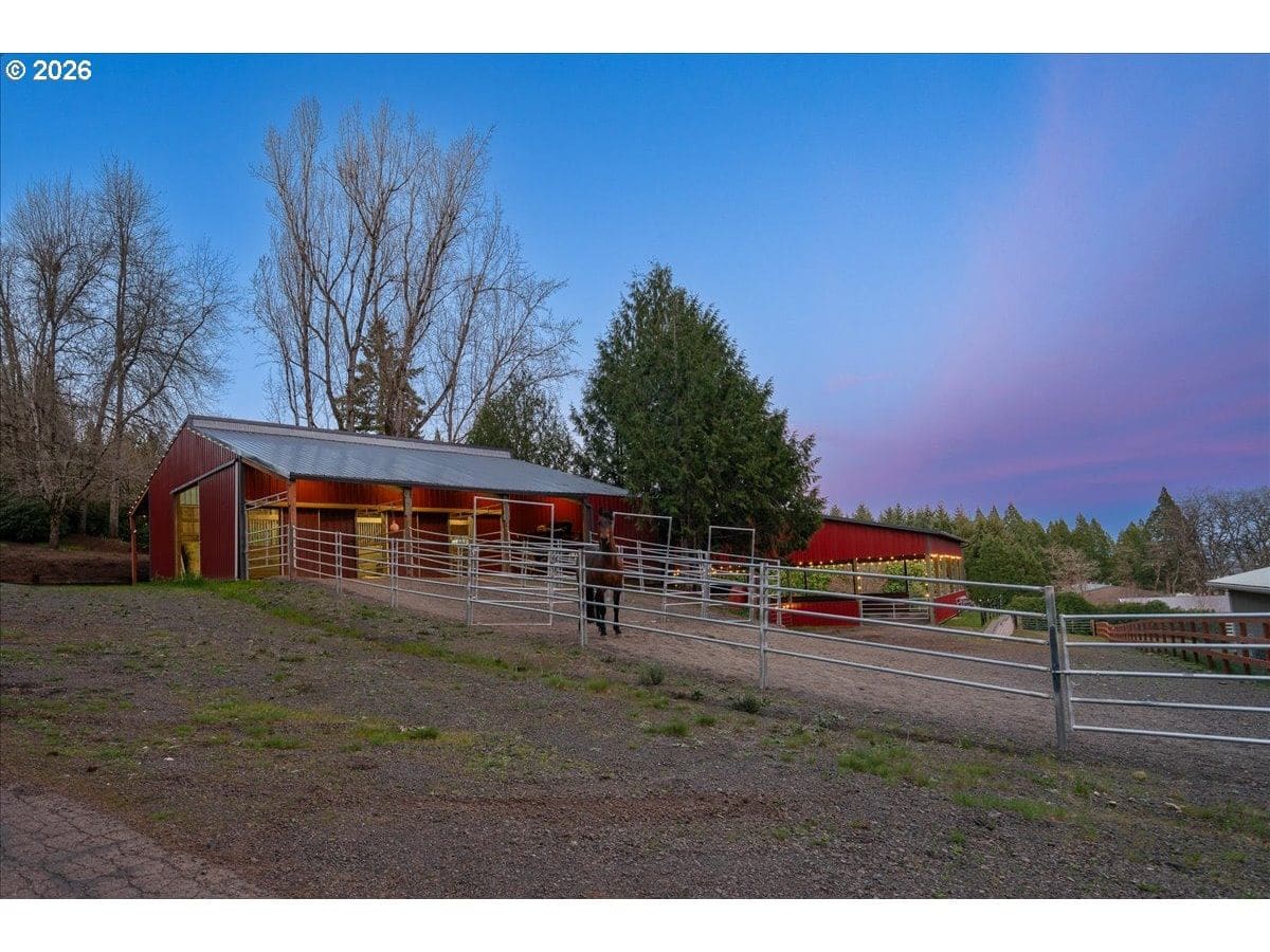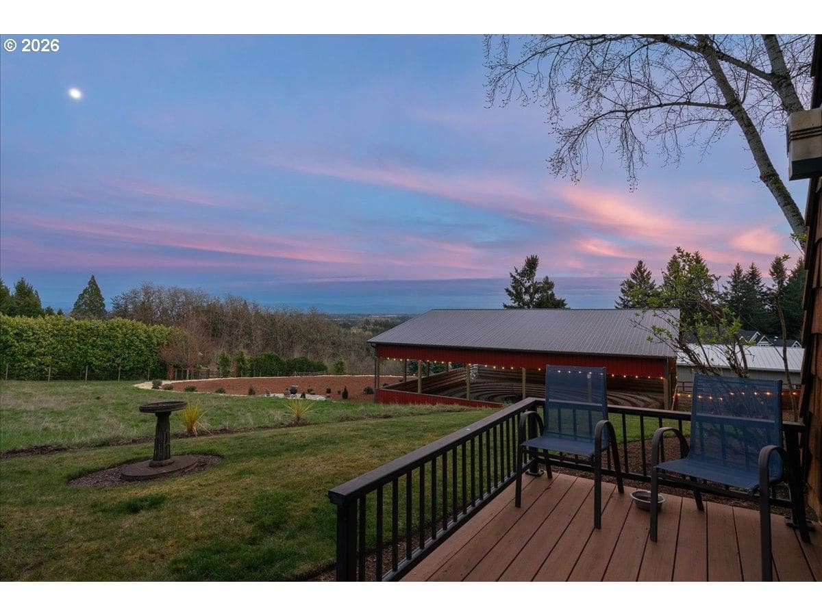Custom château-style retreat with breathtaking mountain views! This stunning NW contemporary luxury home sits on 3.64 acres, offering sweeping valley and Cascade views in a serene, private setting. A rare blend of cozy cabin charm, vintage elegance, and modern sophistication, this one-of-a-kind property showcases exceptional quality and craftsmanship throughout. The thoughtfully designed interior features a chef’s kitchen, custom cherry cabinetry, and a striking two-sided fireplace with slate and metal surround, creating a warm yet refined gathering space. An impressive wood and metal staircase serves as a true architectural centerpiece. Expansive windows flood the home with natural light, highlighting the beautiful finishes and surrounding landscape. Light-filled living spaces offer both comfort and style, ideal for everyday living or entertaining. The primary suite is a spa-like retreat, featuring a limestone shower with a granite outline of Mt. Hood. Dedicated spa/sauna room brings tranquility to your everyday living. Conveniently located just 7 minutes from Wilsonville, Sherwood, and I-5, this property provides peaceful country living with easy access to town. True dual living includes a separate entry, kitchen, laundry, and parking—perfect for Airbnb income potential or multi-generational living. Outdoors, enjoy gorgeous, fenced pastures, a new arena, and a refreshed 3-stall barn with new roof and siding (2024), making this property ideal for equestrian use or hobby farming. A rare opportunity to own a private retreat that seamlessly combines luxury, functionality, and natural beauty.