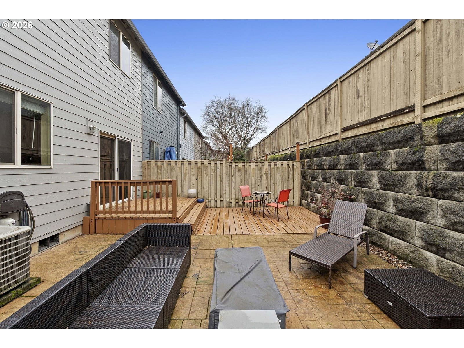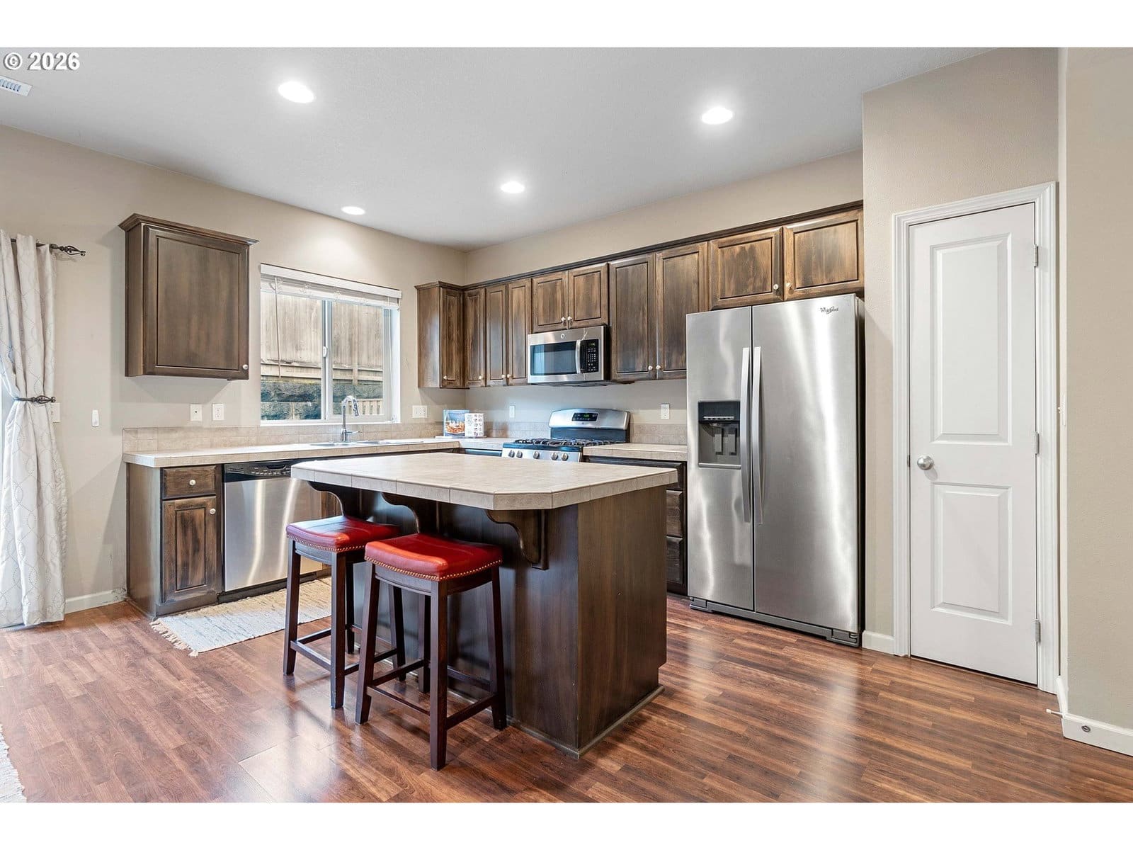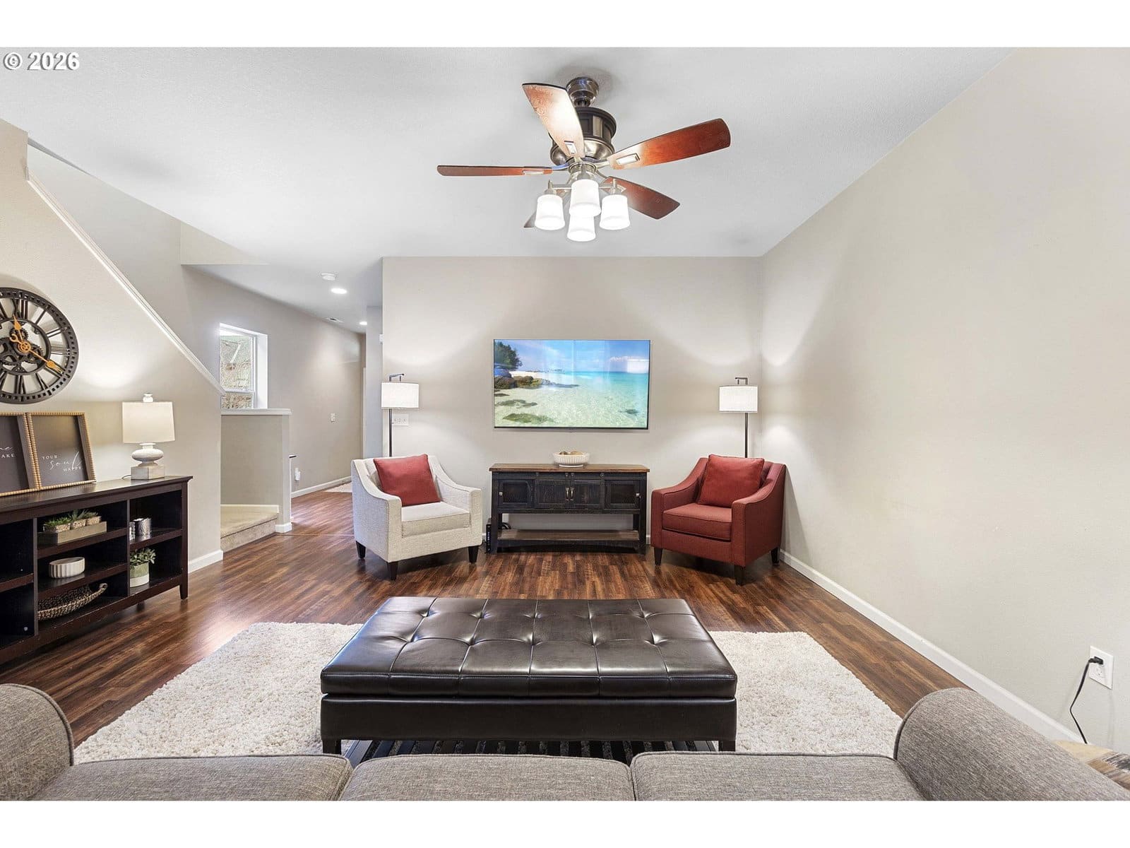 Beautiful End-Unit Townhome in Desirable Windswept Waters! This inviting home features a spacious great room with high ceilings and laminate flooring throughout the main level. The kitchen offers tile countertops, island, gas range, and stainless steel appliances, flowing into the dining area with sliding doors to a fenced backyard with deck and stamped concrete patio. Upstairs includes a primary suite with walk-in closet and double vanity, two additional bedrooms, a loft/bonus space, and a laundry room. Enjoy a vibrant community with amenities including a basketball court, dog park, playground, and walking paths. Newer hot water heater, Nest thermostat, and garage door opener. Electric car charging outlet in the garage. Prime location with easy access to I-205, Clackamas Town Center, and local dining. Managed by Association Management Services NW (AMS).