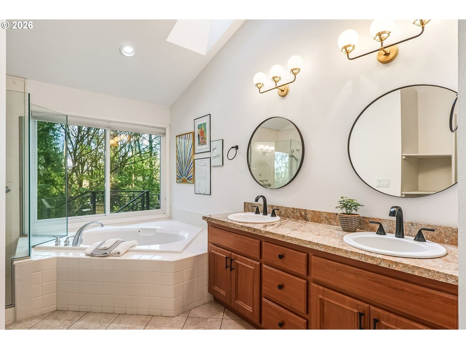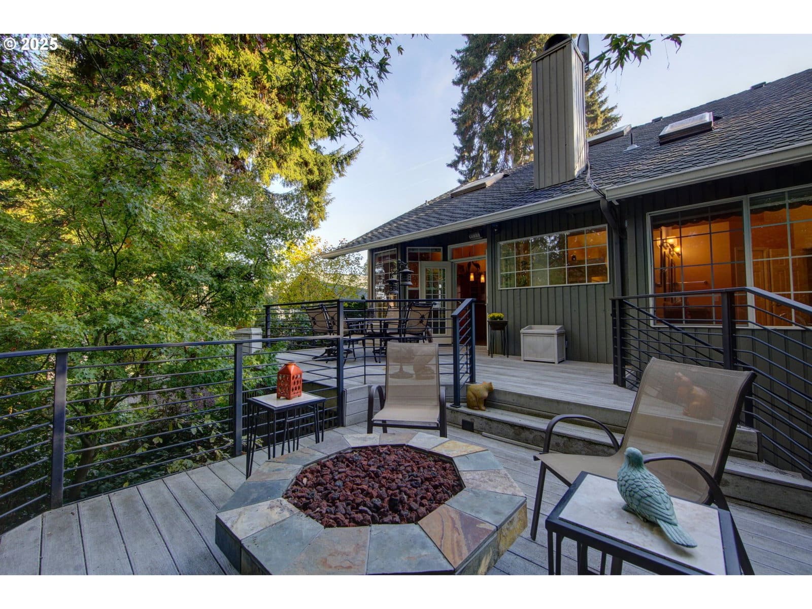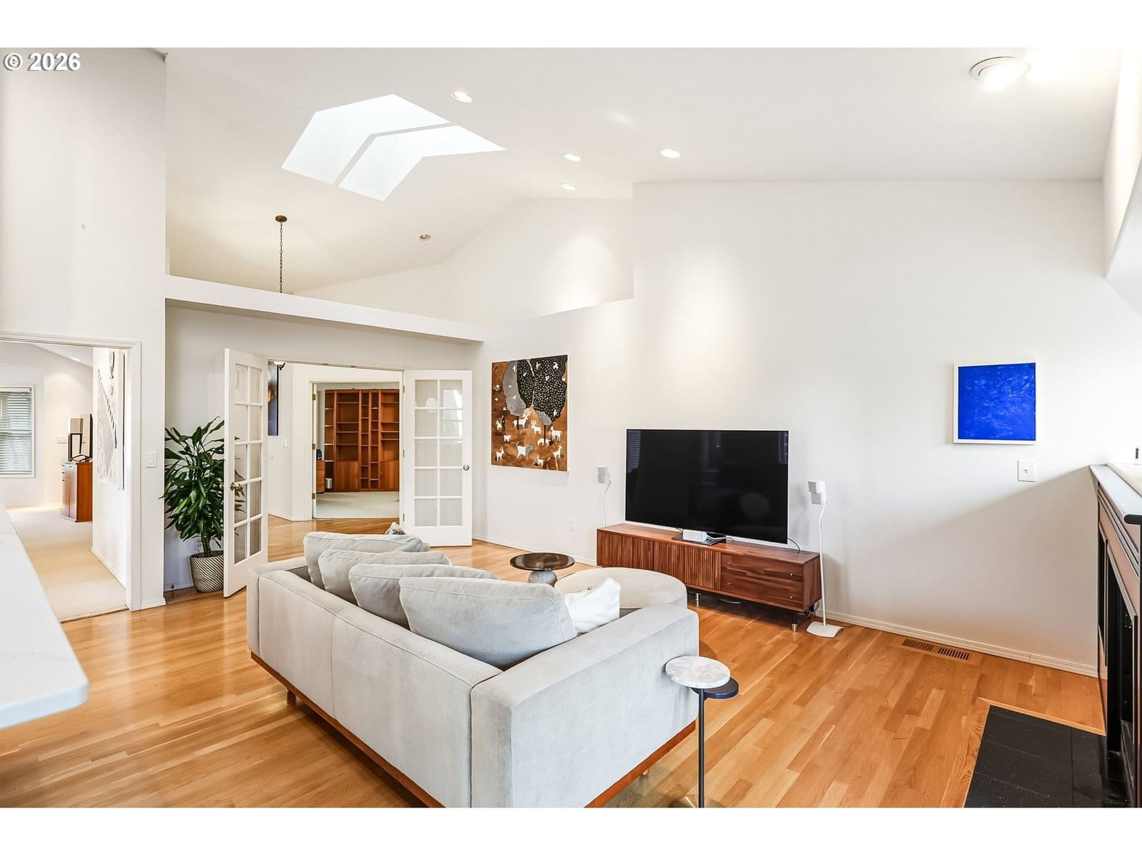 Expansive single-level home offering high ceilings, abundant natural light, and a private green space backdrop located on over a quarter-acre. Exceptionally maintained and thoughtfully updated, this home boasts original hardwood floors and skylights that bring light into every corner of the home. The chef's kitchen is designed for entertaining with new quartz countertops and tile backsplash (2021), an expansive island with integrated storage and prep sink, food-warming cabinet, premium stainless steel appliances including JennAir gas range, built-in microwave, and a cozy breakfast nook. Recent improvements include new Andersen windows and skylights, custom up-down window treatments, updated lighting fixtures, a new solar tube, and newer interior paint. The primary suite features vaulted ceilings and a spacious ensuite with a large walk-in closet, walk-in shower, jetted soaking tub, and double sinks with granite countertops. Two additional bedrooms offer flexibility, with one ideal for a home office or guest space. The living room showcases hardwood floors, a gas fireplace, high ceilings with a skylight, and French doors that open to the backyard. Outside, a multi-level deck and custom paver patio create an exceptionally private setting surrounded by mature trees and fully fenced grounds, backing directly to green space. All of this is just minutes from Bridgeport Village, parks, and major freeways, offering convenience without sacrificing privacy.