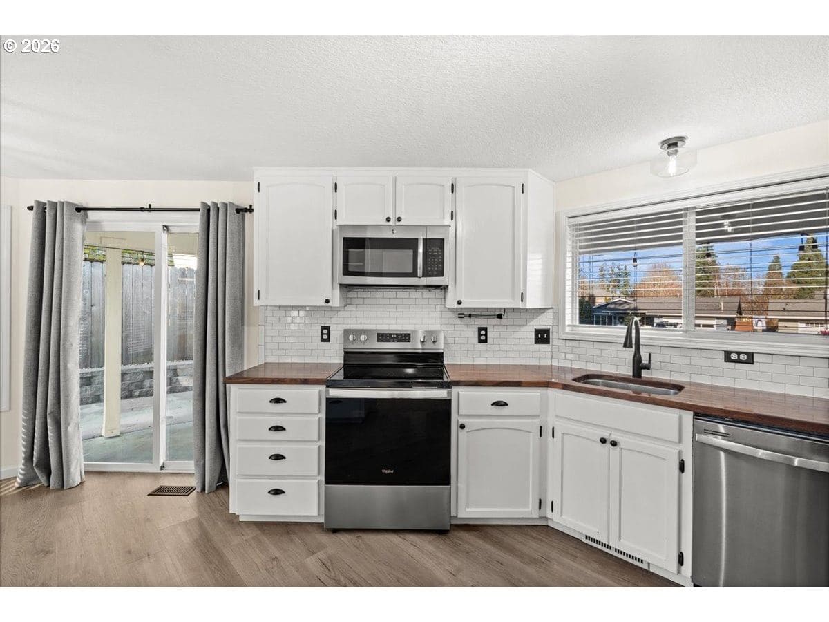 Beautifully updated single-level ranch home situated on a spacious lot in the heart of Old Town Forest Grove. This turnkey residence offers the perfect blend of modern comfort and small-town charm, all within walking distance to local parks & Joseph Gale Elementary School, downtown Forest Grove, and Pacific University. Enjoy the convenience of nearby shops, dining, and community events while living in a well-established neighborhood known for its tree-lined streets and welcoming atmosphere. The interior has been thoughtfully remodeled from top to bottom, with updates to every surface. The kitchen features stainless appliances, butcher block counter tops and subway tile backsplash, complemented by fully updated bathrooms, new flooring throughout, and fresh interior paint, creating a clean, cohesive, and move-in-ready living space. Step outside to a completely reimagined outdoor entertaining area designed for year-round enjoyment. The backyard boasts a covered entertaining space, low-maintenance turf, and a concrete retaining wall—ideal for gatherings, relaxation, or play. Additional upgrades include a new heat pump, providing energy-efficient heating and cooling for year-round comfort. A rare opportunity to own a beautifully updated home in one of Forest Grove’s most desirable and walkable locations. Schedule your showing today!