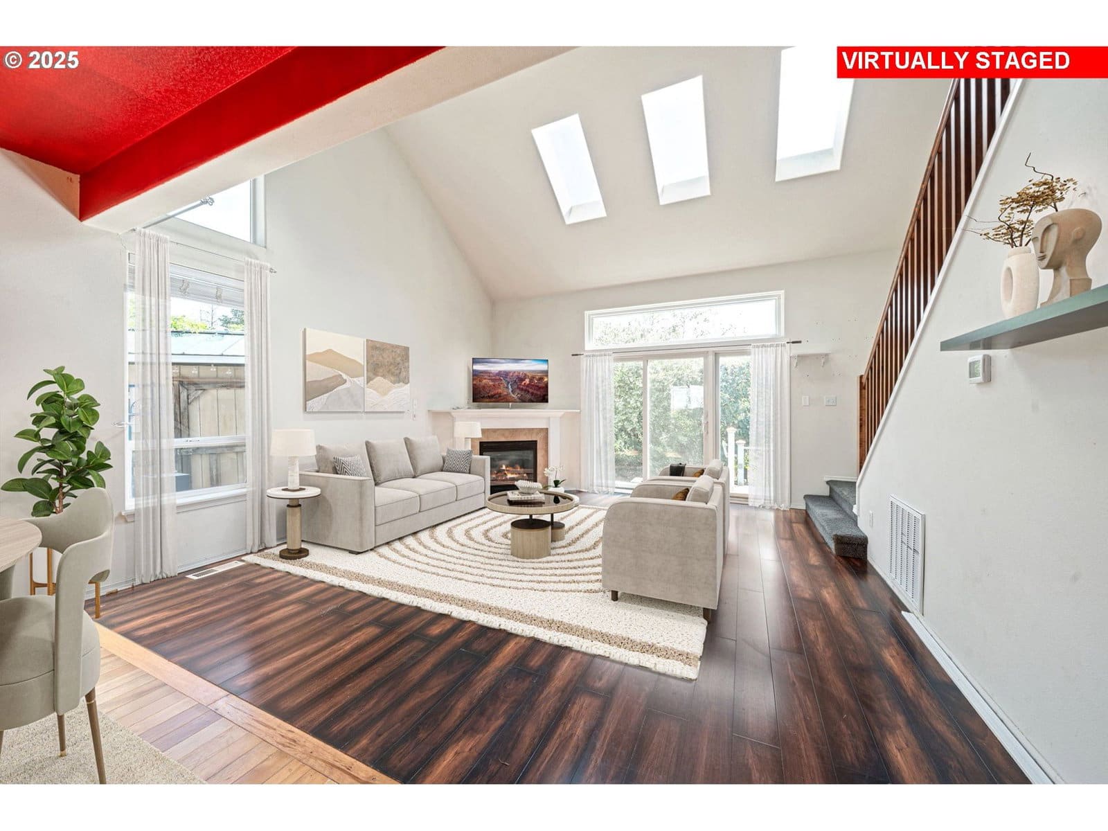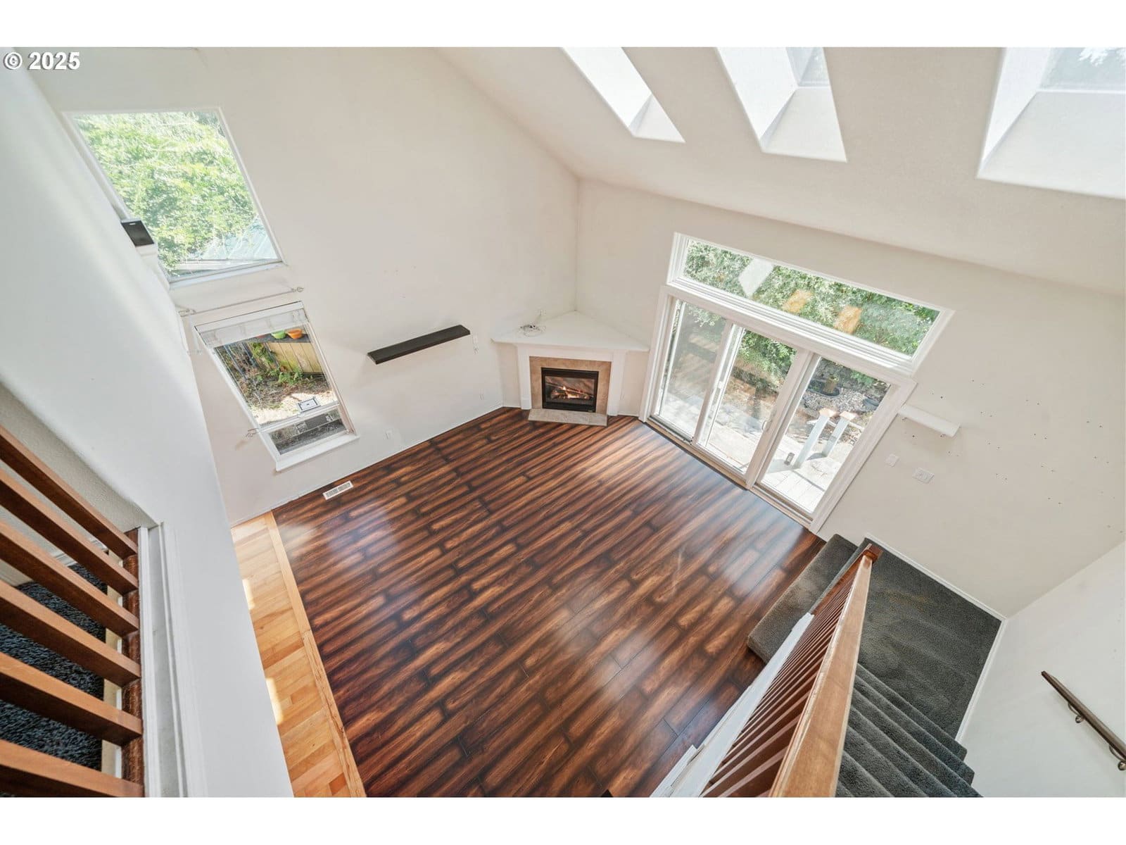 Welcome to this great room floor plan with vaulted ceiling. Light pours into the rooms from an abundance of window, high ceilings and skylights. Primary suite on the main floor with double doors and French door leading to fenced backyard. 3 bedrooms on the upper level. Just needs some paint and flooring to make this one a fabulous place to call home. Tucked away on a low traffic lane, the private backyard is ready for your finishing touches to sit back and relax in the lush outdoor spaces, with multiple sheds. Newer metal roof is a plus