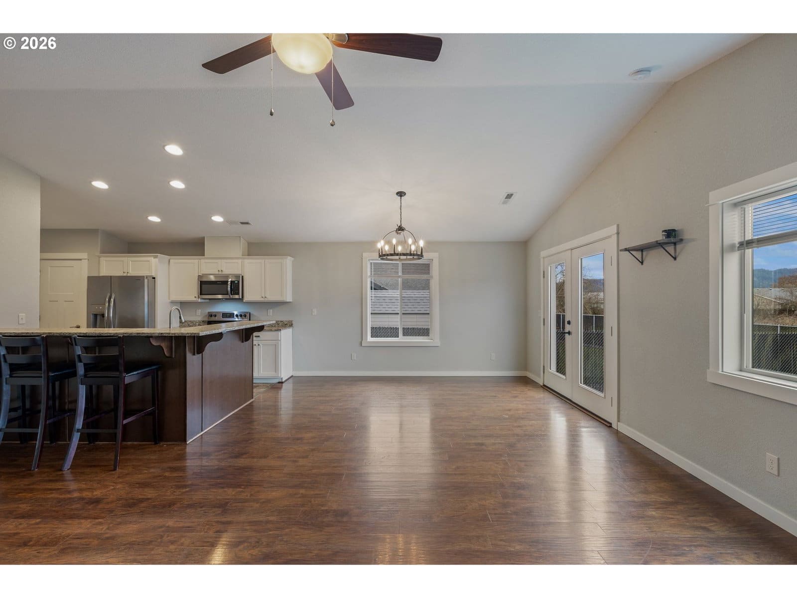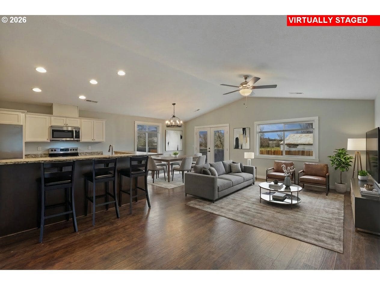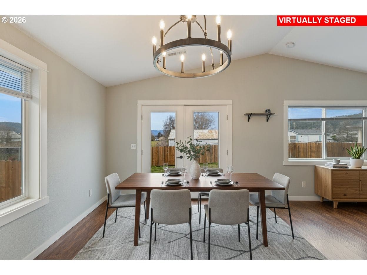 Welcome to this impeccably maintained 2016-built Craftsman Ranch home, where timeless architectural details meet the ease of modern, single-level living. The striking curb appeal makes a lasting impression, featuring contemporary board and batten siding, elegant gables, and a crisp, high-contrast color palette. This is a home designed for those who appreciate both style and substance, offering a spacious open floor plan that maximizes every square foot and creates a seamless flow for everyday living. As you step inside, the entryway leads you into an inviting living room that serves as the heart of the home. Soaring vaulted ceilings and a stylish ceiling fan create an airy feel, while durable luxury vinyl plank (LVP) flooring flows throughout the entire open space. The gourmet kitchen is a true centerpiece, showcasing stunning textured granite countertops that offer ample workspace. Complete with a large pantry and stainless steel appliances, this kitchen is as functional as it is fashionable, making it the ideal spot for morning coffee or hosting holiday gatherings. The primary suite is a true retreat, featuring a generous walk-in closet and a contemporary walk-in shower. Two additional spacious bedrooms provide plenty of versatility, whether you need room for family, a dedicated guest wing, or a bright home office. Practicality is woven throughout the design, including a convenient laundry room situated just off the oversized two-car garage to keep daily chores organized and out of sight. The living experience extends outdoors through elegant french doors that lead to a patio and a fully fenced backyard. This outdoor space is your personal canvas—perfect for summer barbecues, gardening, or simply relaxing in the fresh Oregon air. Enjoy quick I-5 access for a hassle-free commute and easy weekend trips to the Umpqua Valley's famous wineries, trails, and rivers. Combining modern luxury with an unbeatable location, this home is a must-see—schedule your tour today!